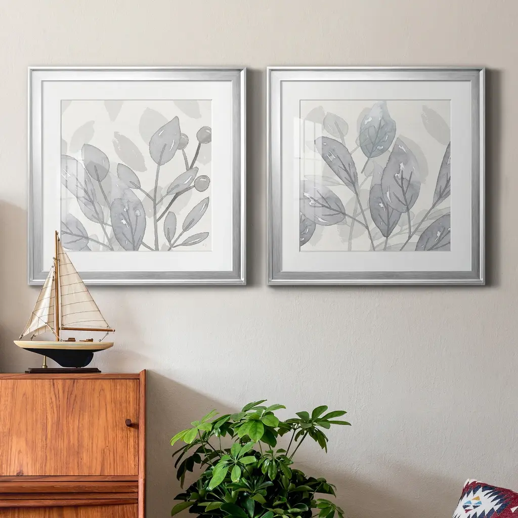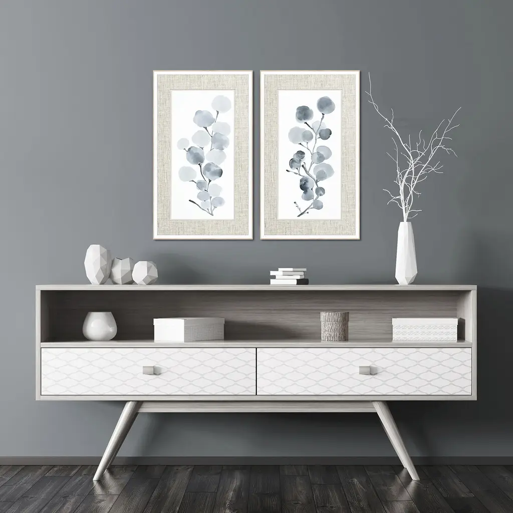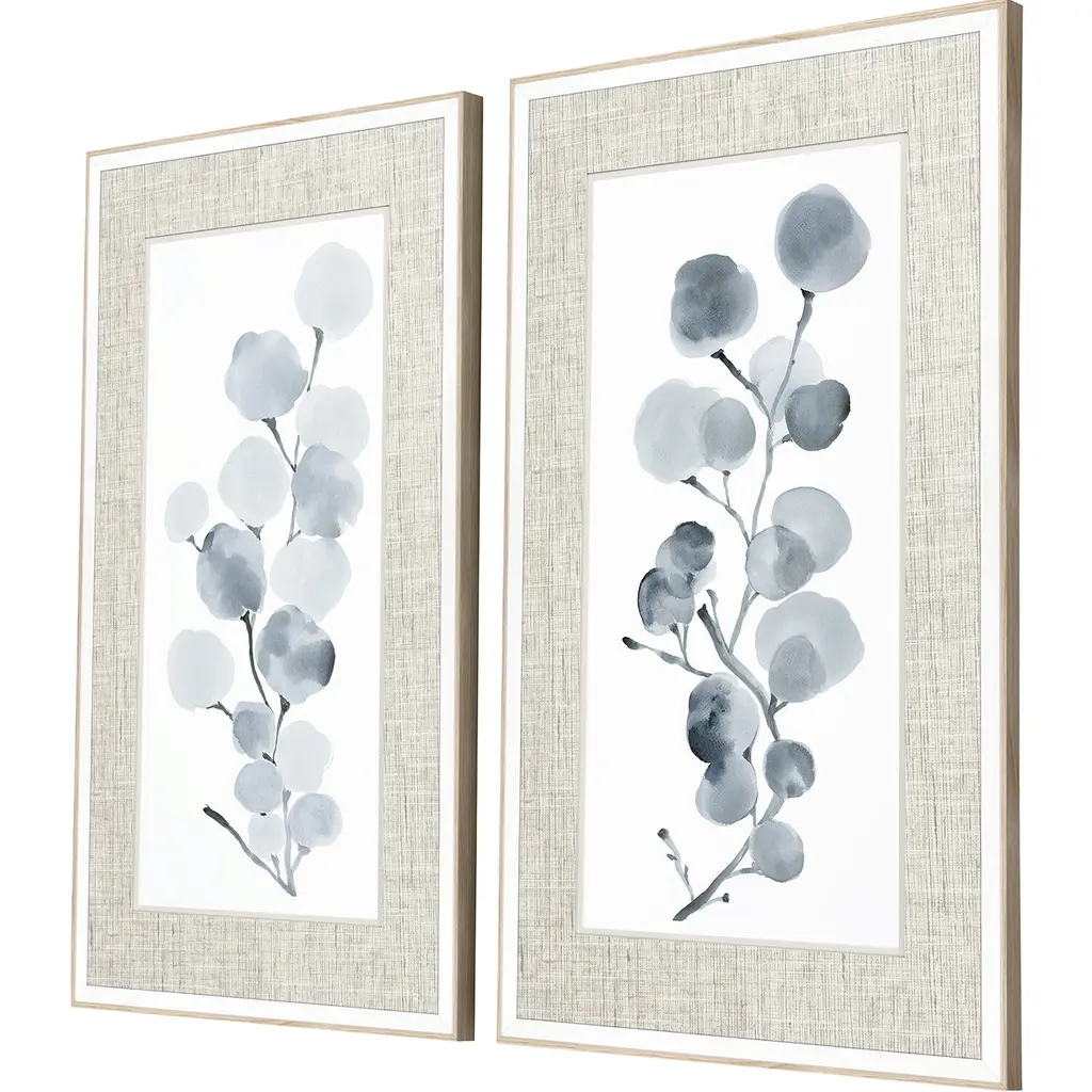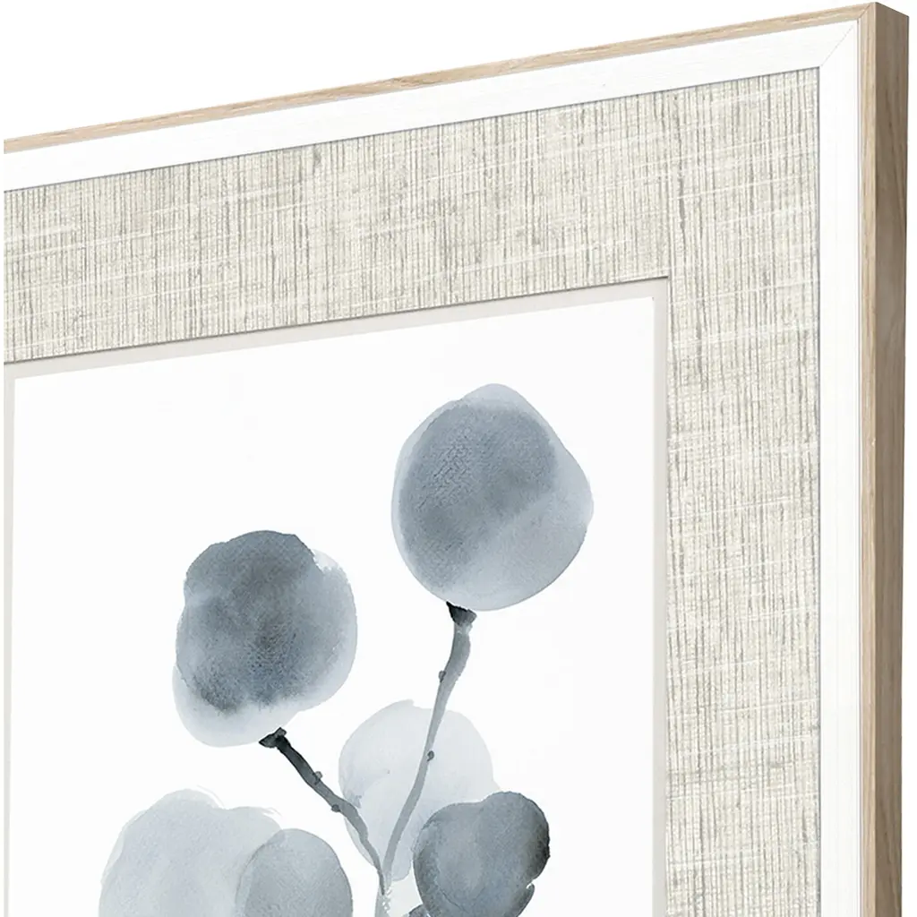 Botanical branches are given a sophisticated treatment with a hand applied decorative paper. Framed in a ribbed white wood with blonde wood side.