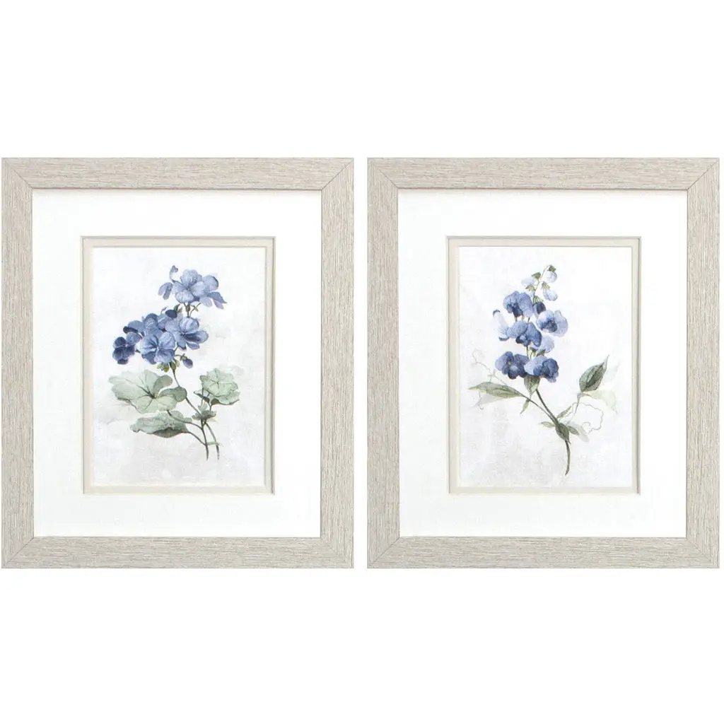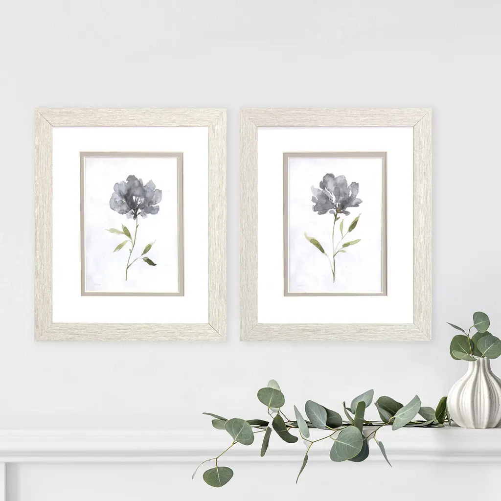 A set of two neutral floral images that are double matted, framed under glass and paired with a white wash wood tone textured frame.