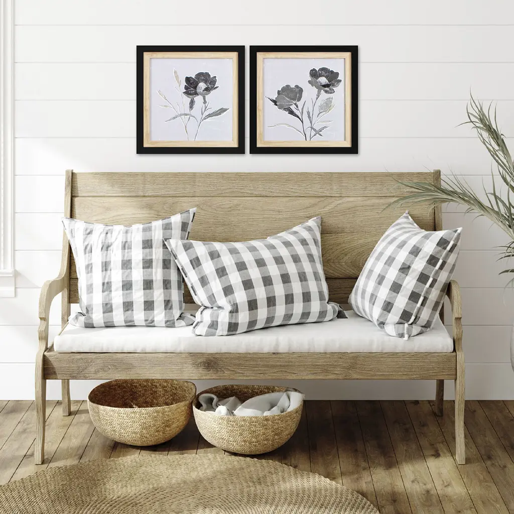Set of two gray floral images are framed to size in a shadow box style moulding in black with a natural wood finish liner. Under glass.