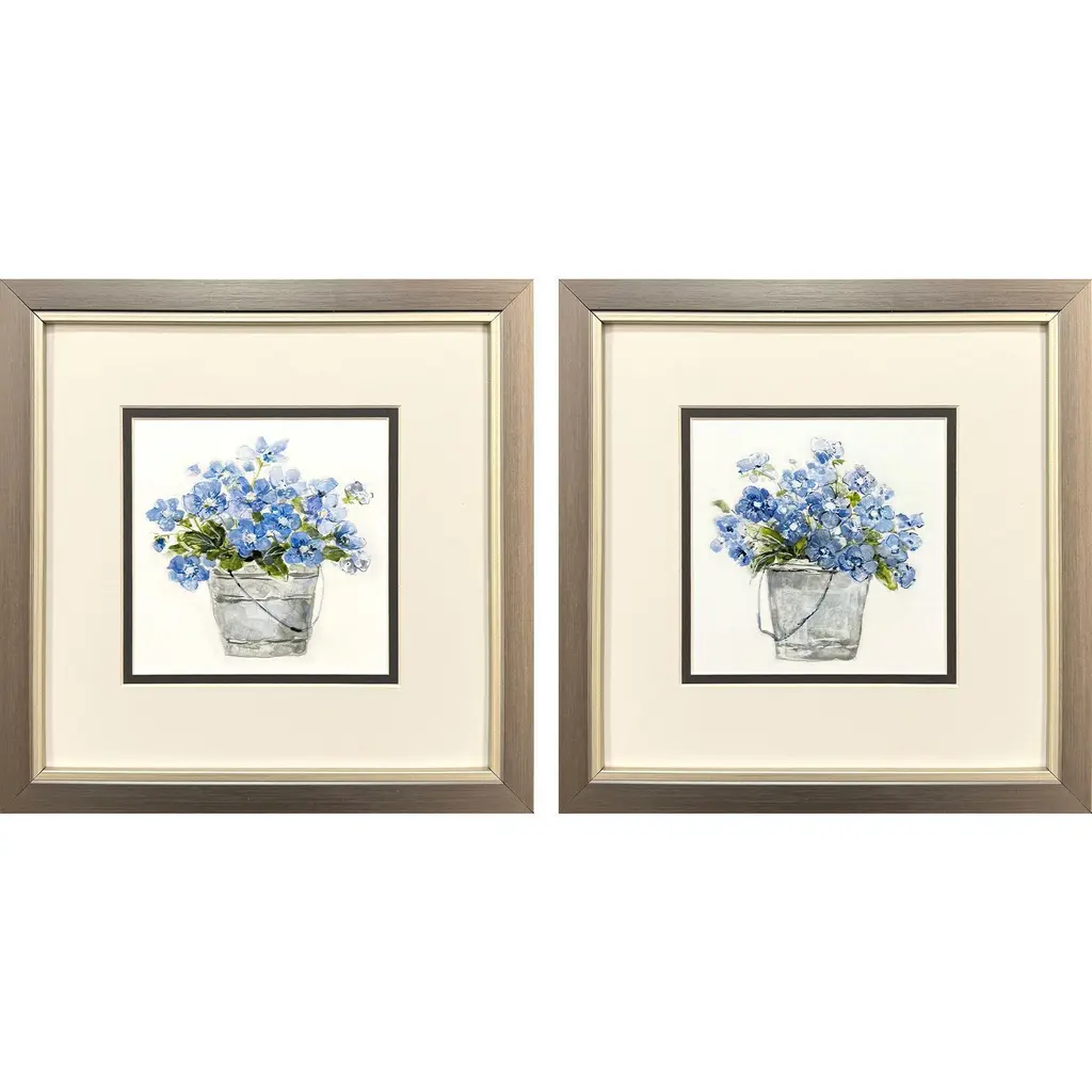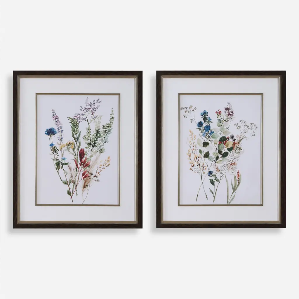 Pretty farmhouse style floral bouquets in rust and green are matted in white. Framed in a brushed pewter finish moulding with silver lip.