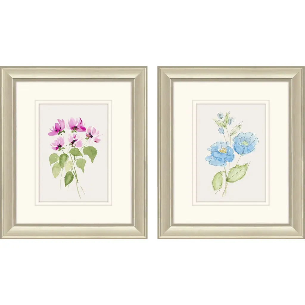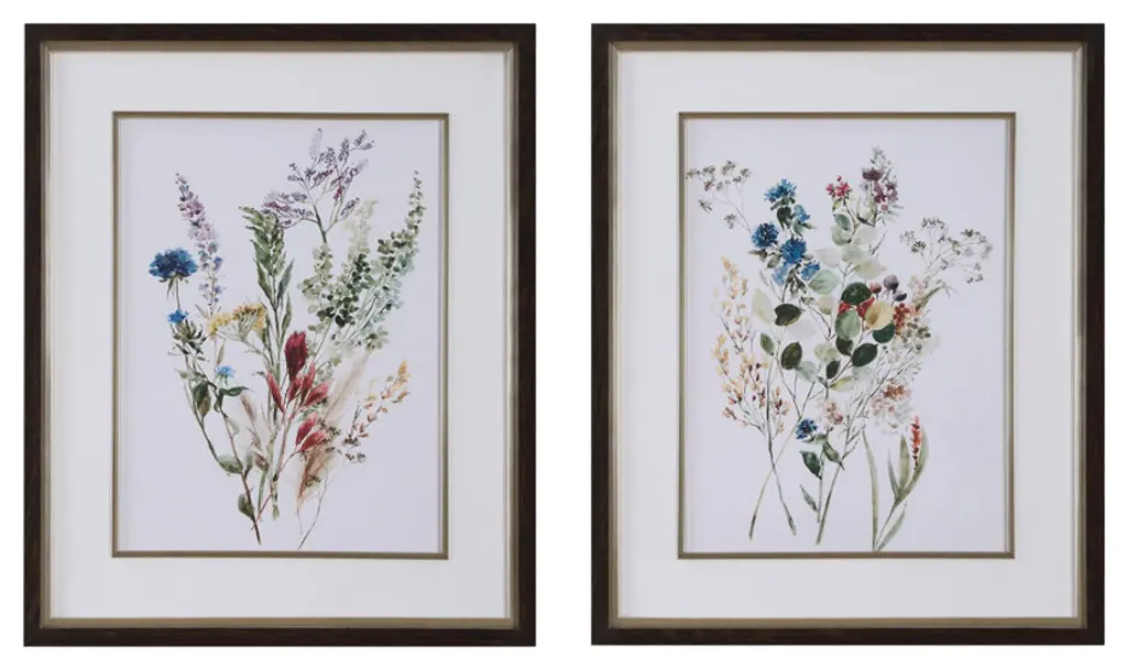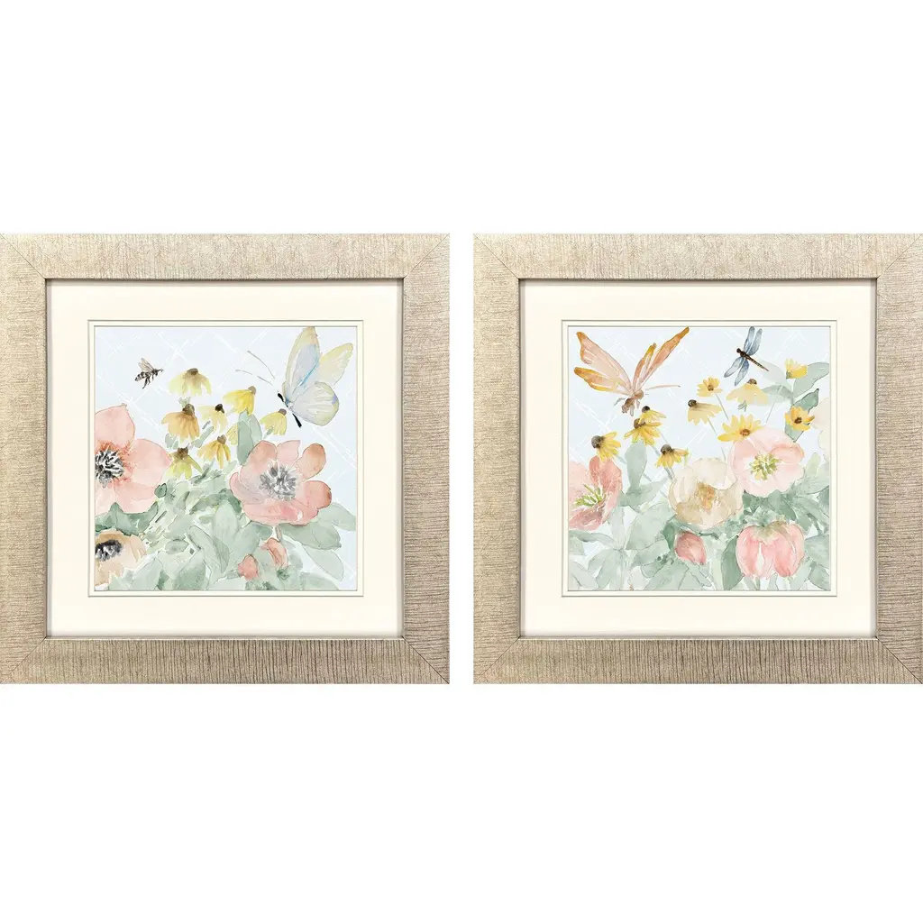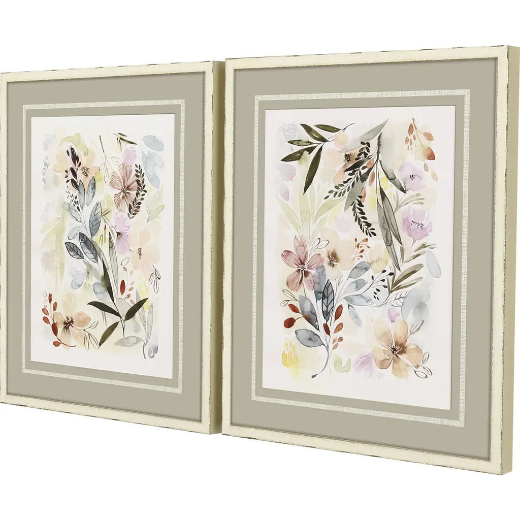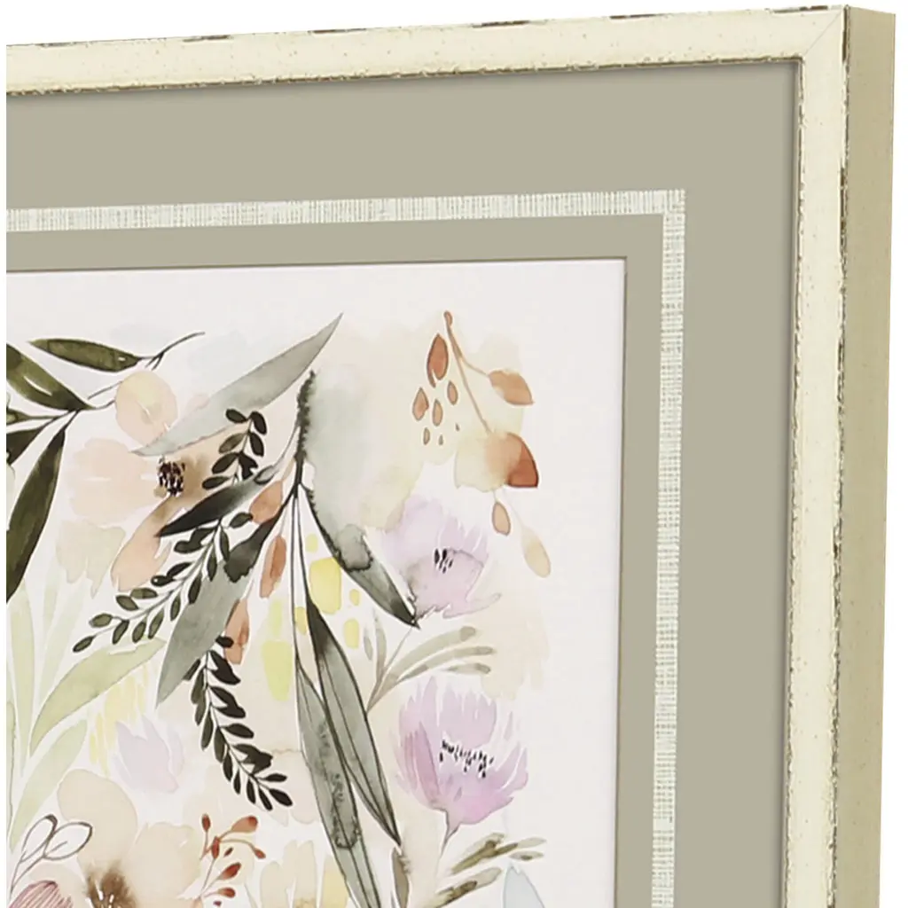Florals feature premium matting with hand applied gold accents and decorative papers. Framed in a rubbed ivory wood shadow box with distressed edges.