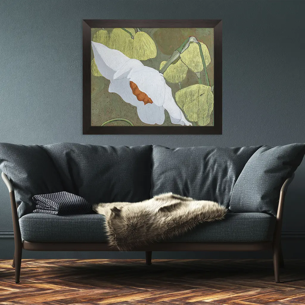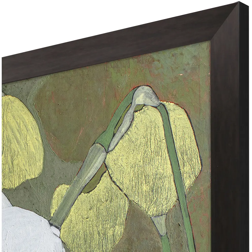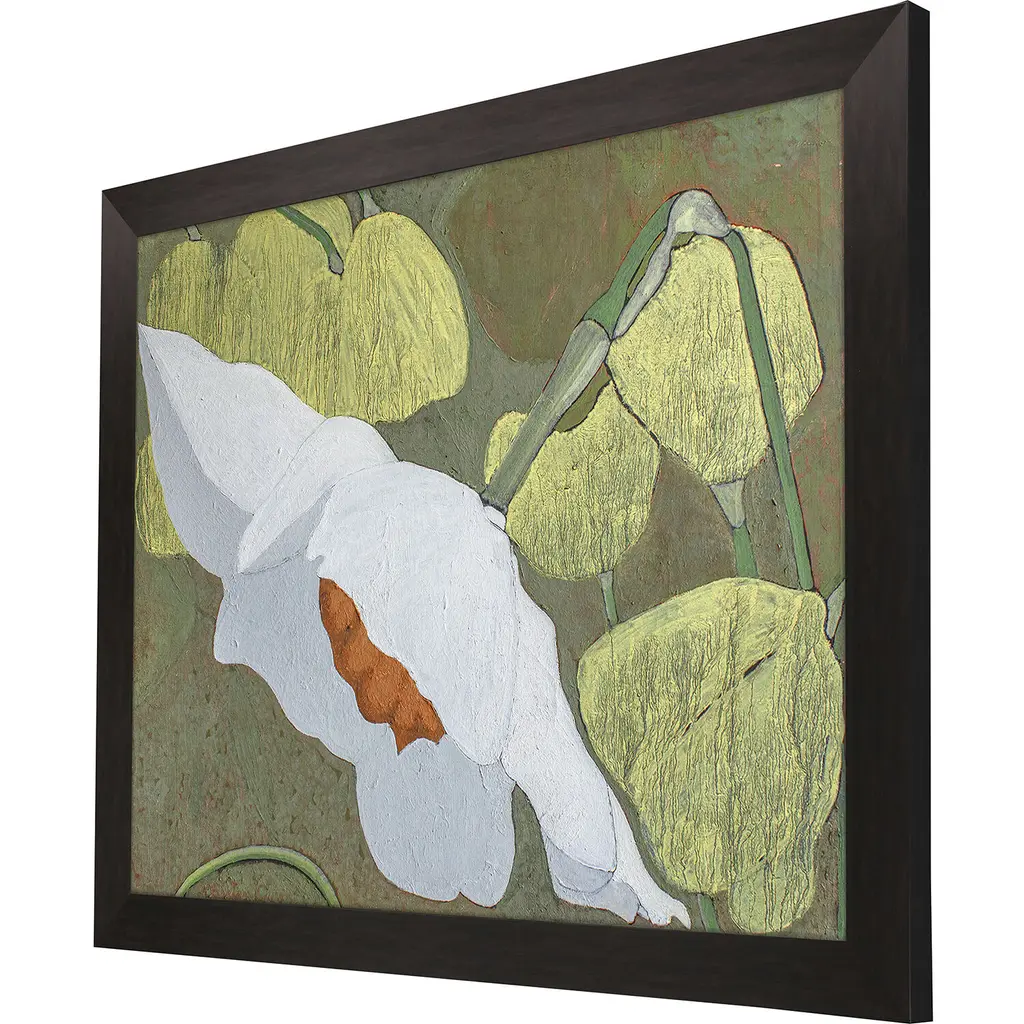 A single white flower blossom contrasts against a sea of green leaves. Framed in a block profile moulding in a dark wood finish.