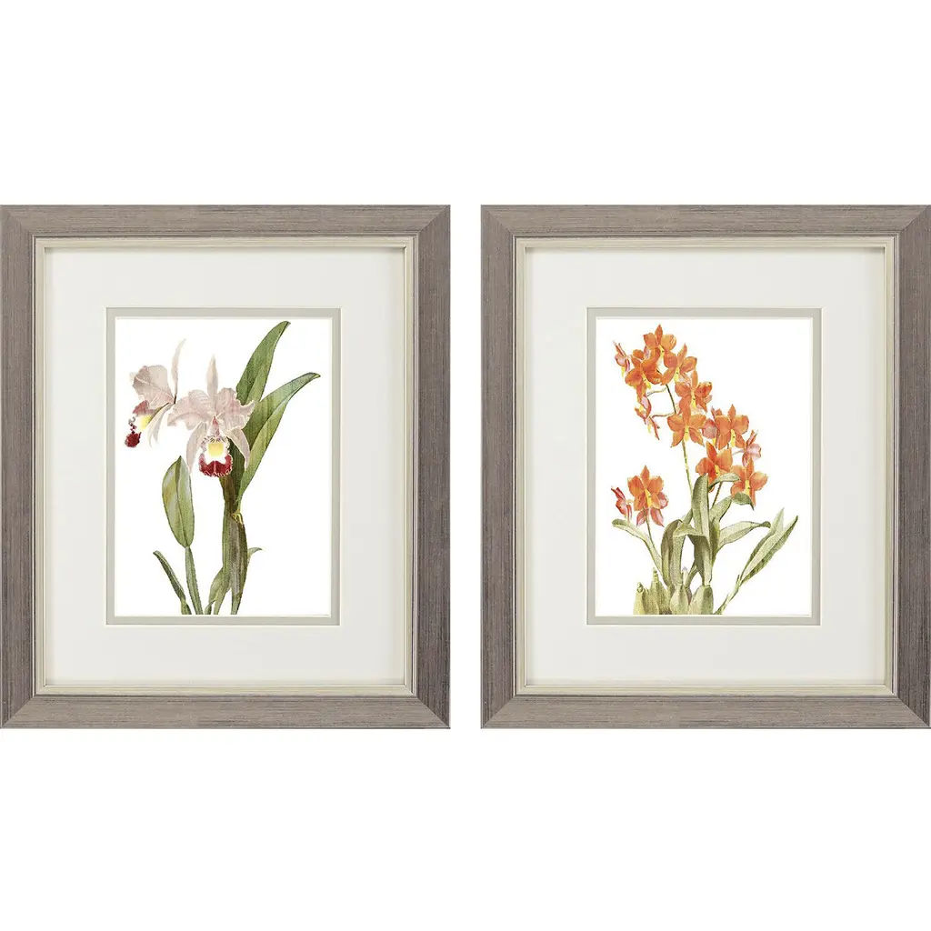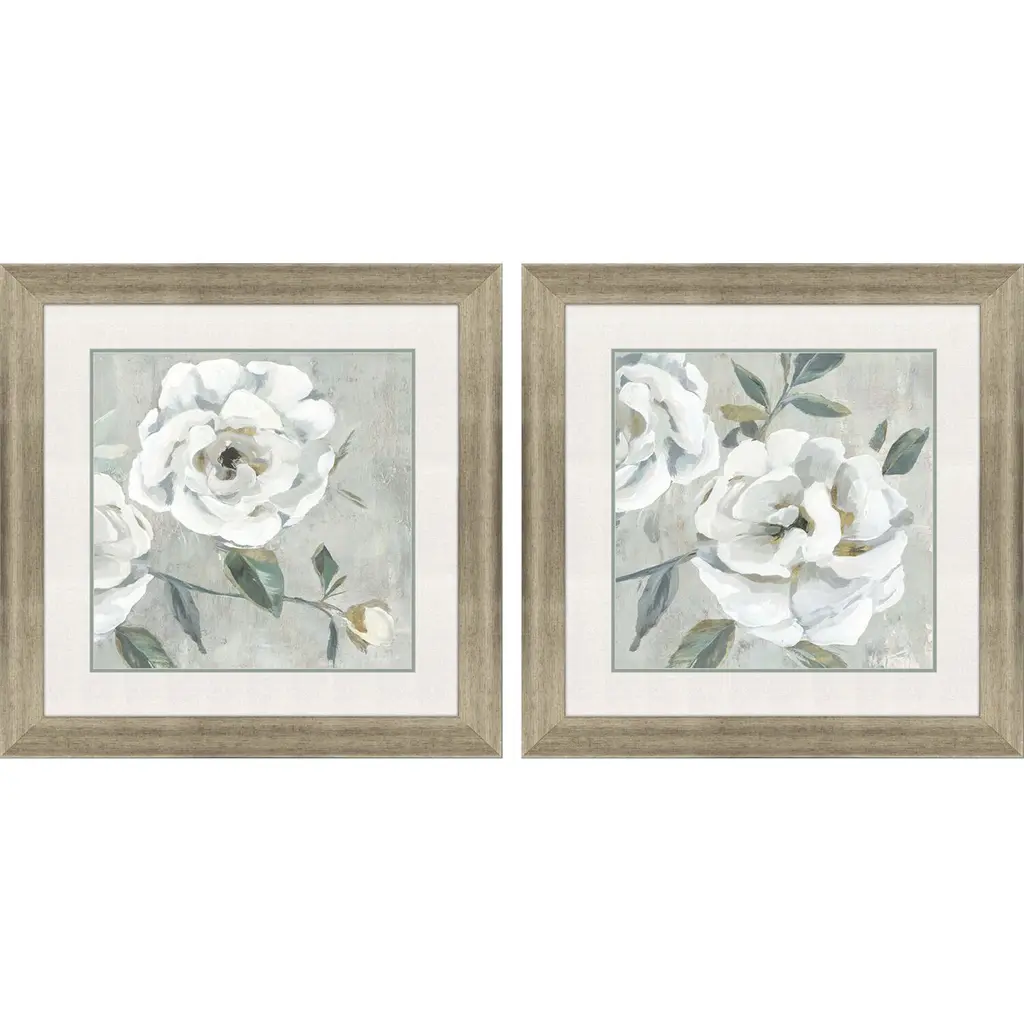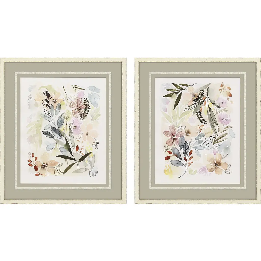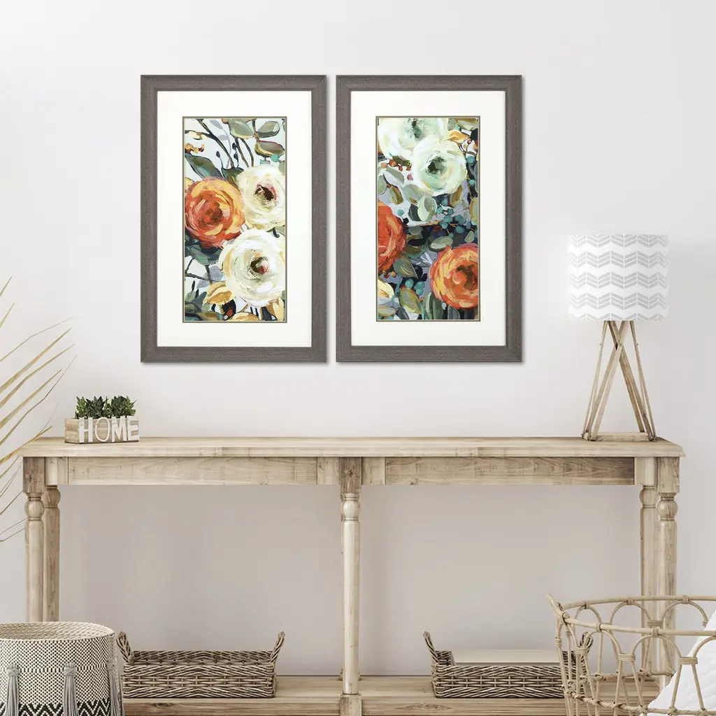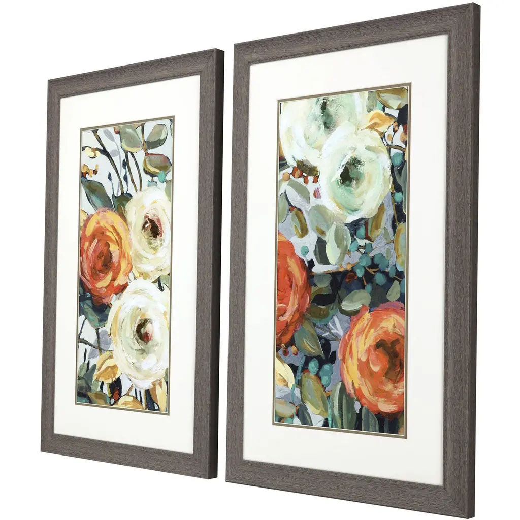 A set of two floral images that are accentuated with double matting. These pieces are framed under glass and paired with a wood tone frame.