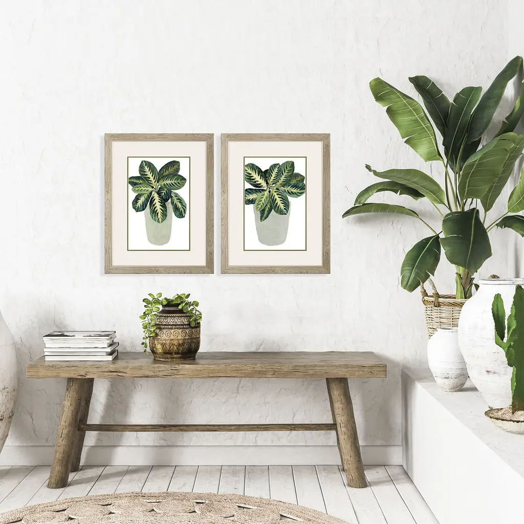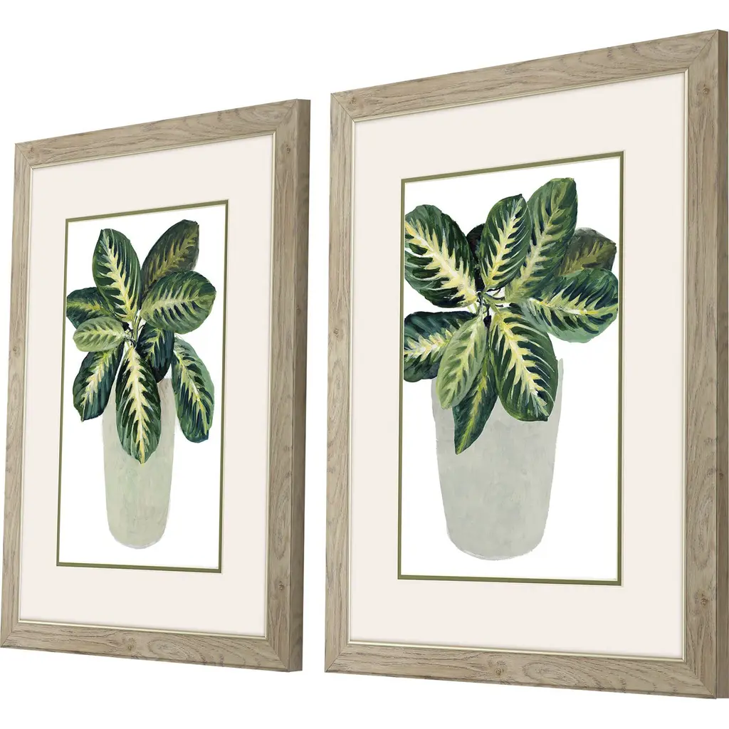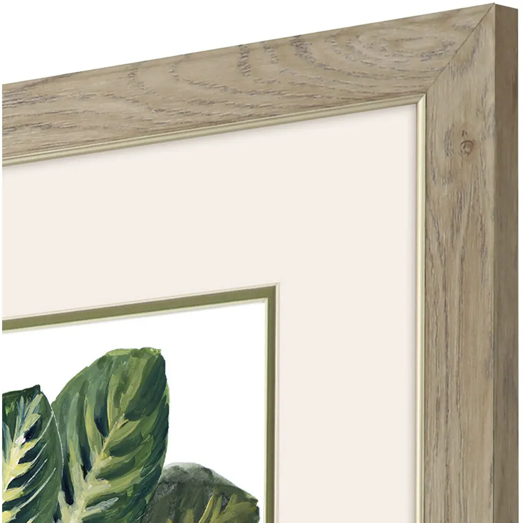 Beautiful green foliage adds color to a neutral backdrop. Matted in putty and framed in a natural wood finish moulding with champagne gold lip.