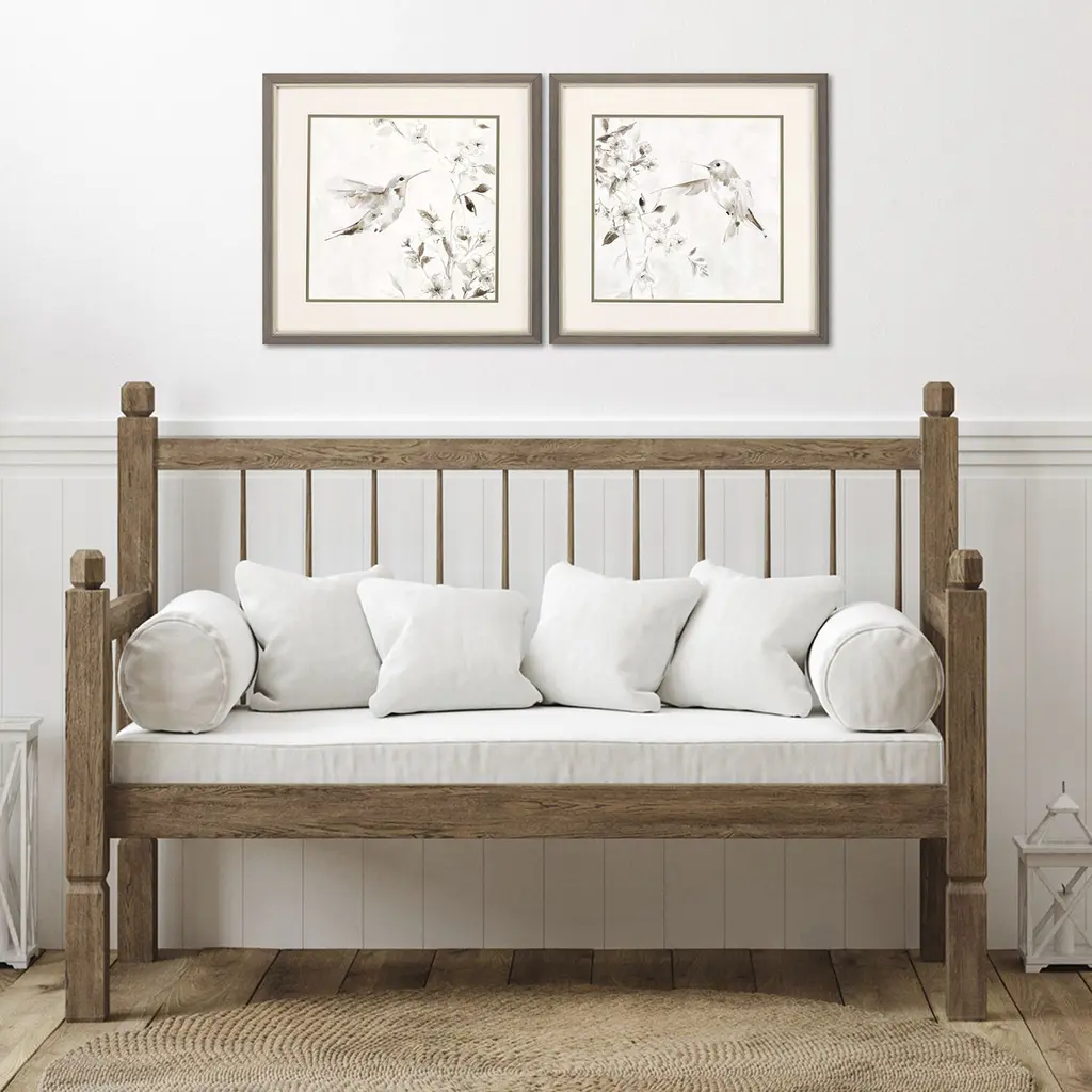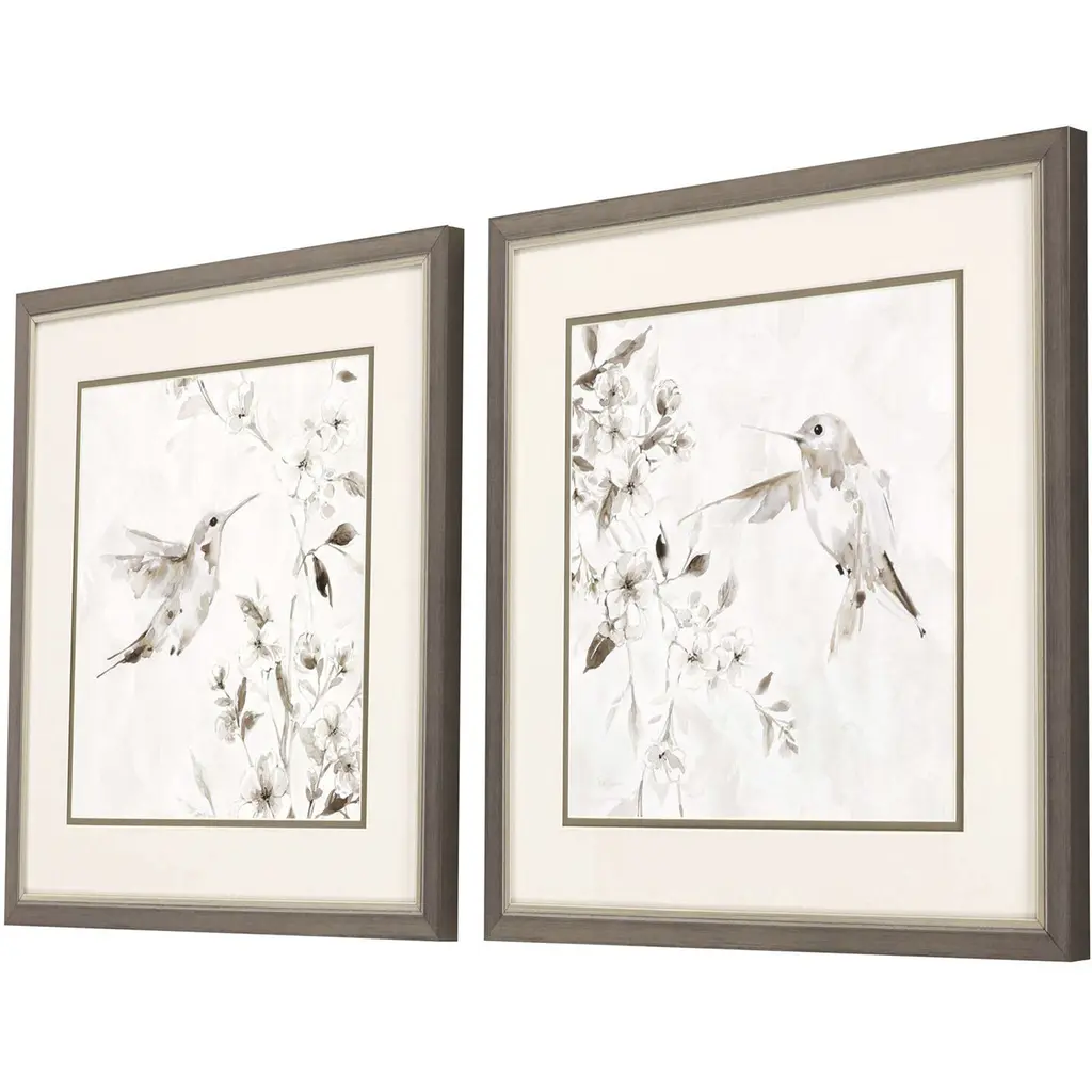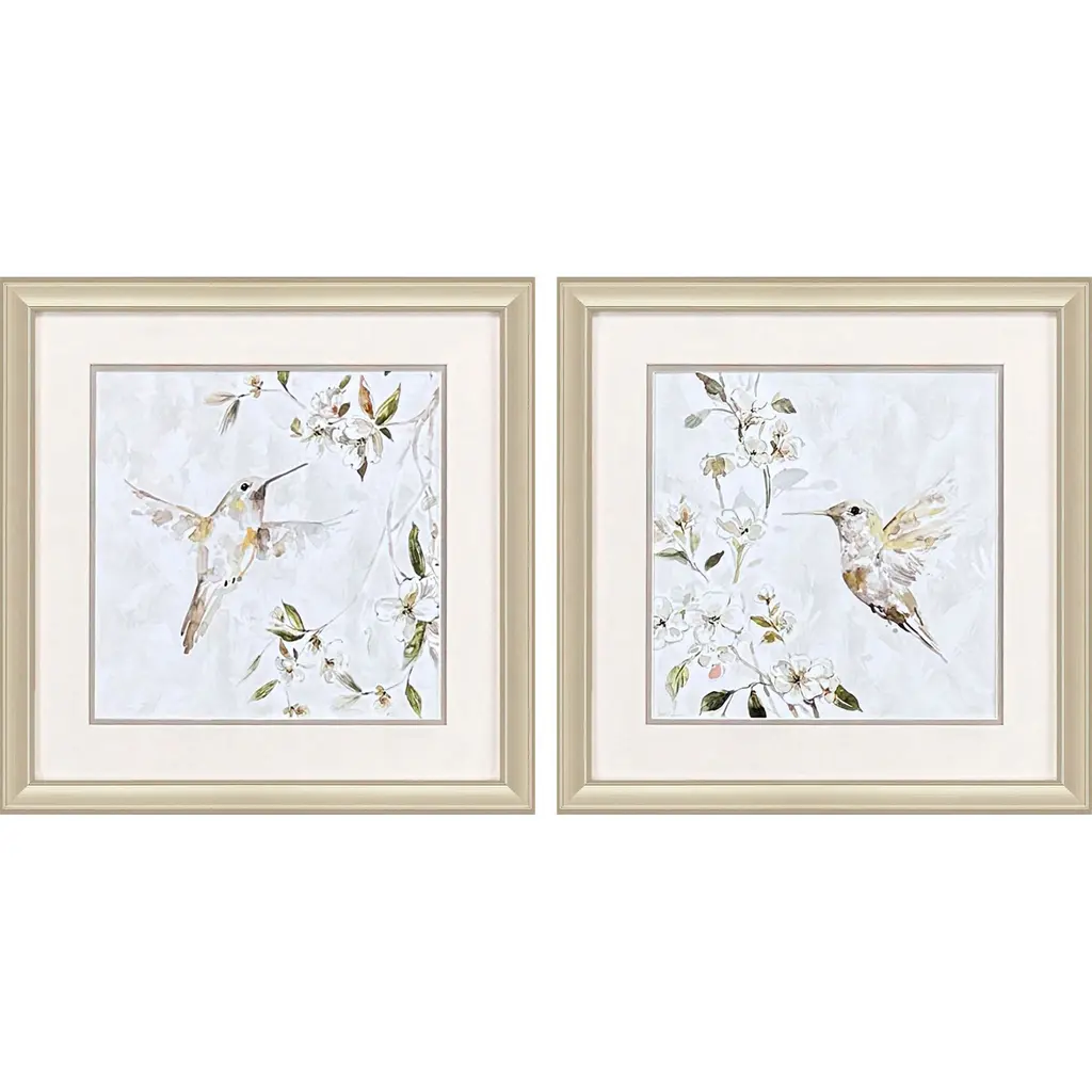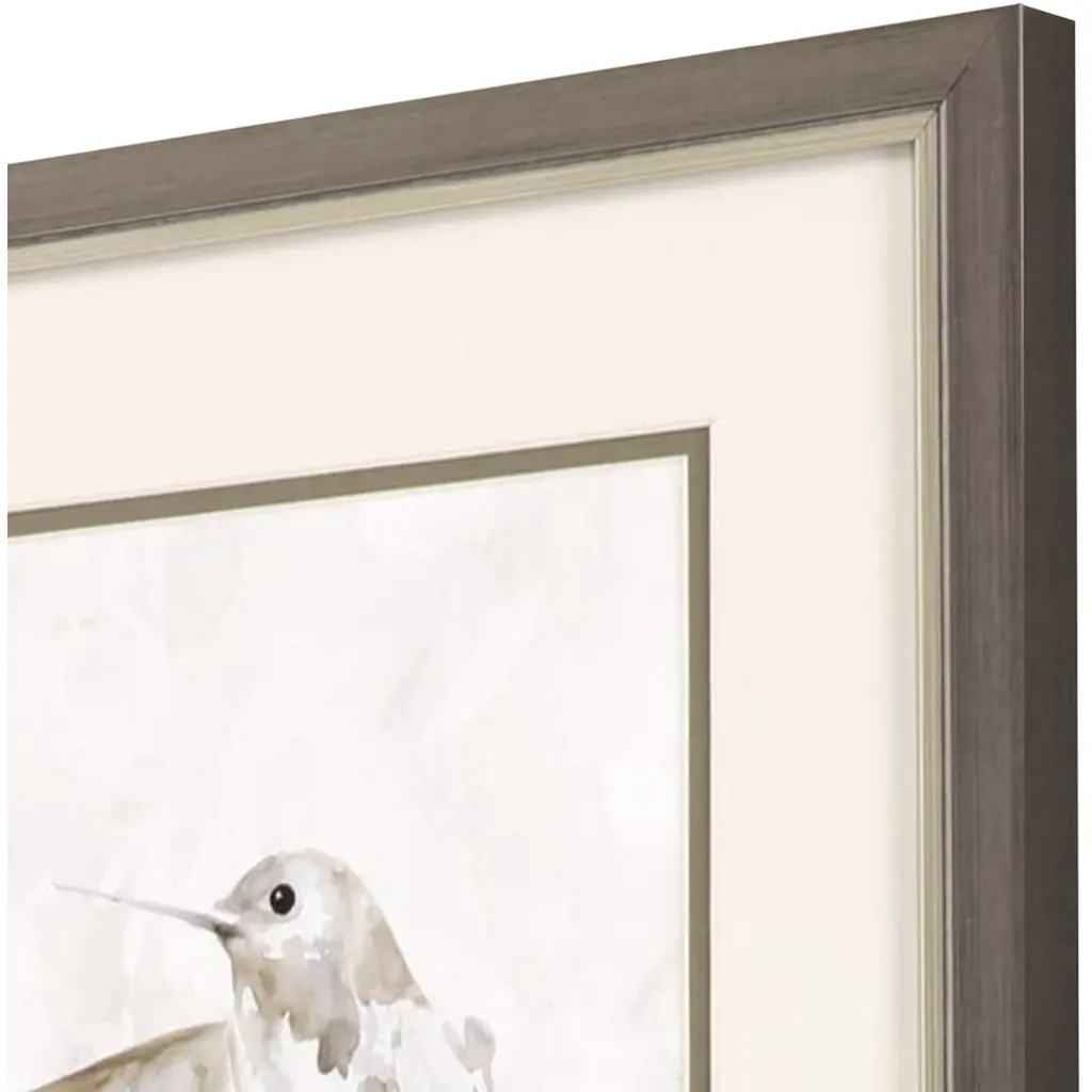 A set of two neutral hummingbird images that are accentuated with double matting. These pieces are framed under glass and paired with a bronze frame.
