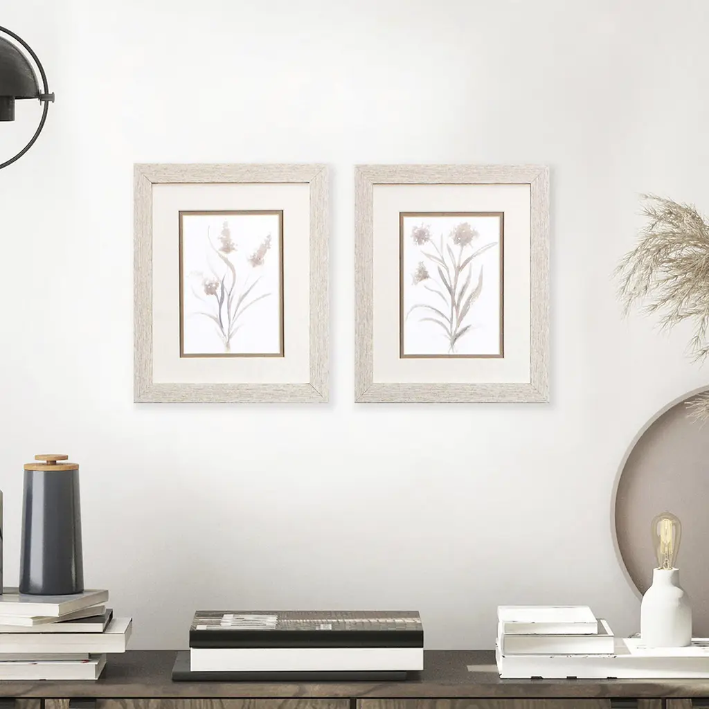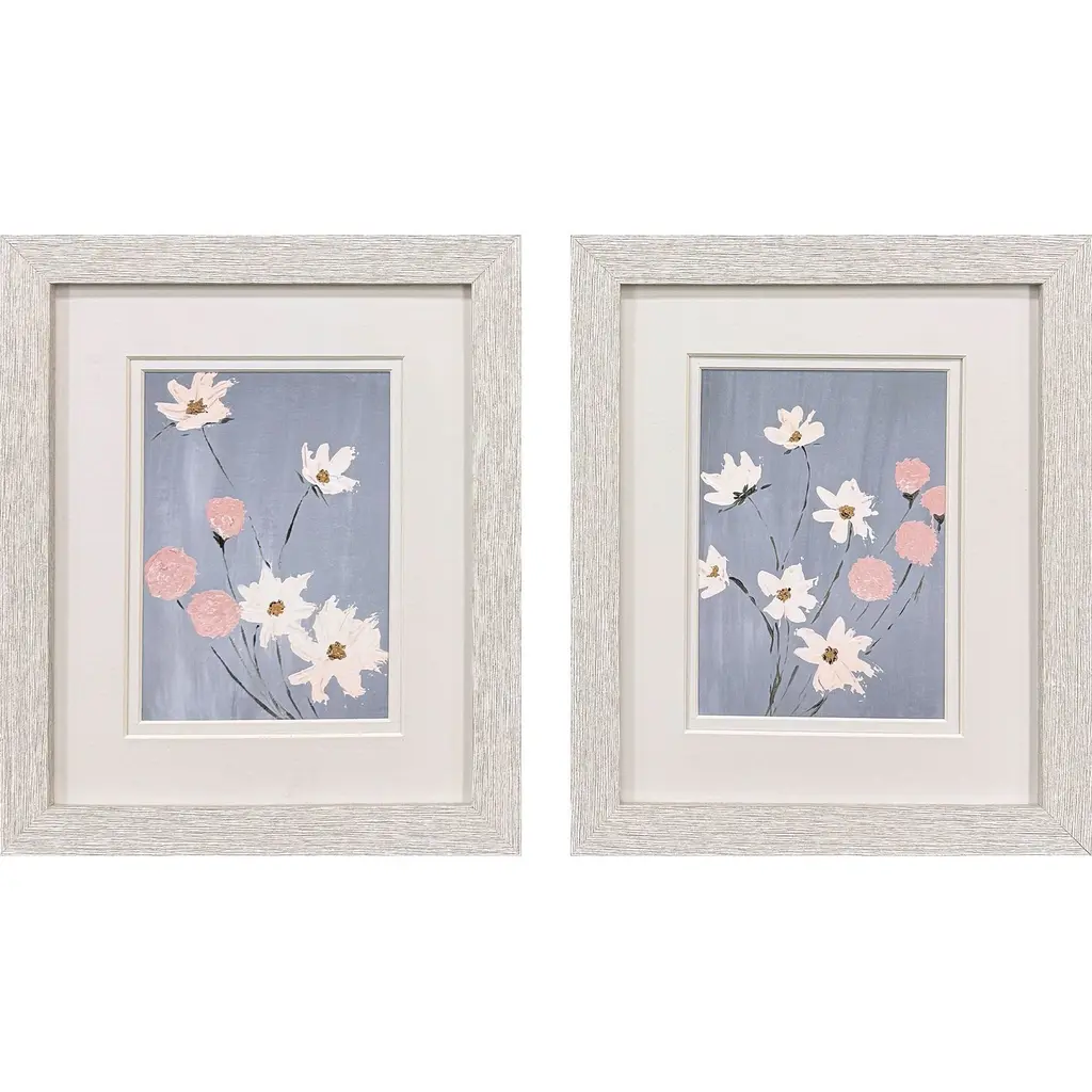A set of two neutral floral prints that are double matted in light buff and pewter and framed in a distressed whitewash finish moulding.