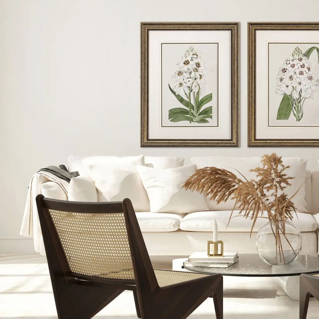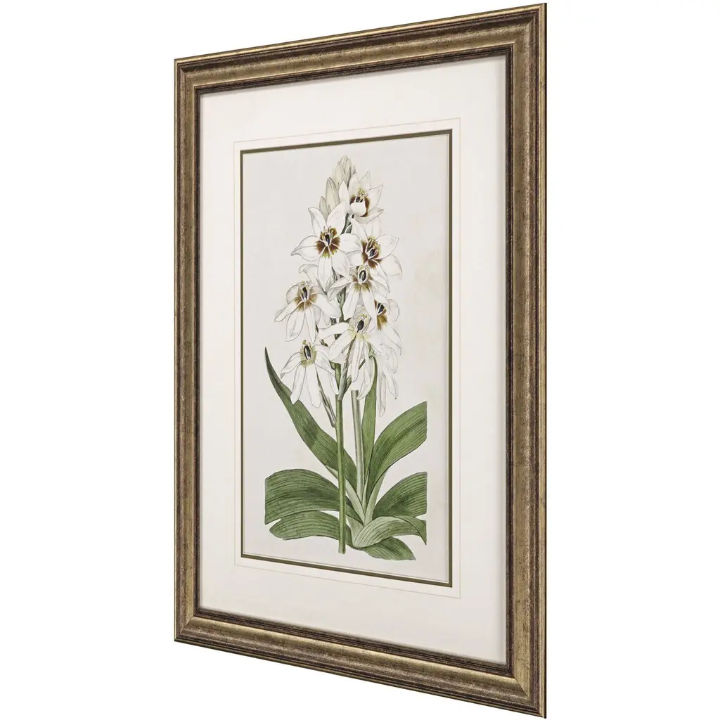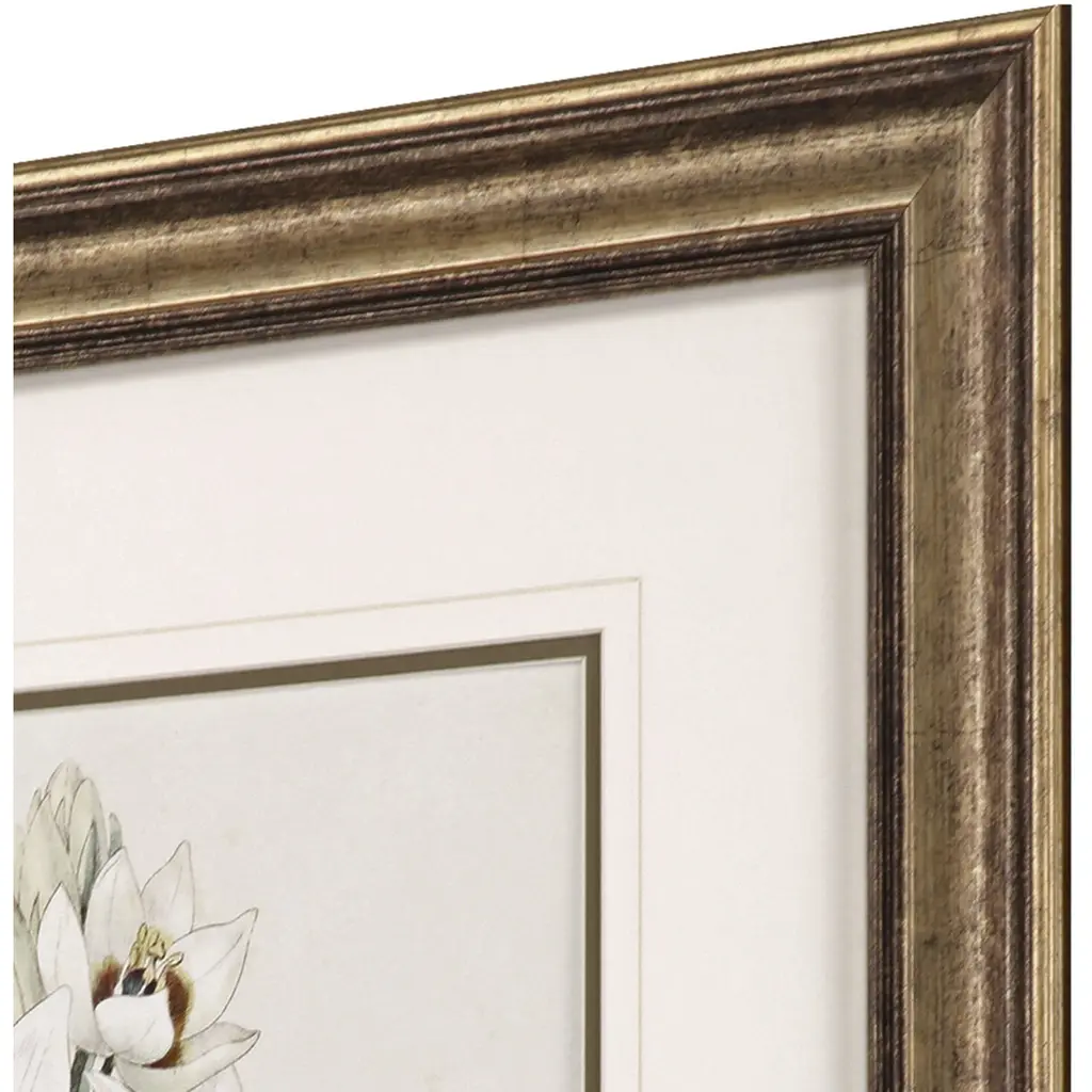 A botanical print that is accentuated with double matting and a v-groove. This piece is framed under glass and paired with a dimensional bronze frame.