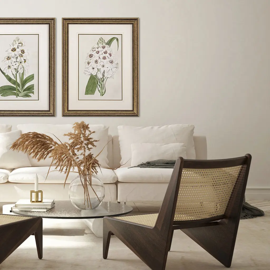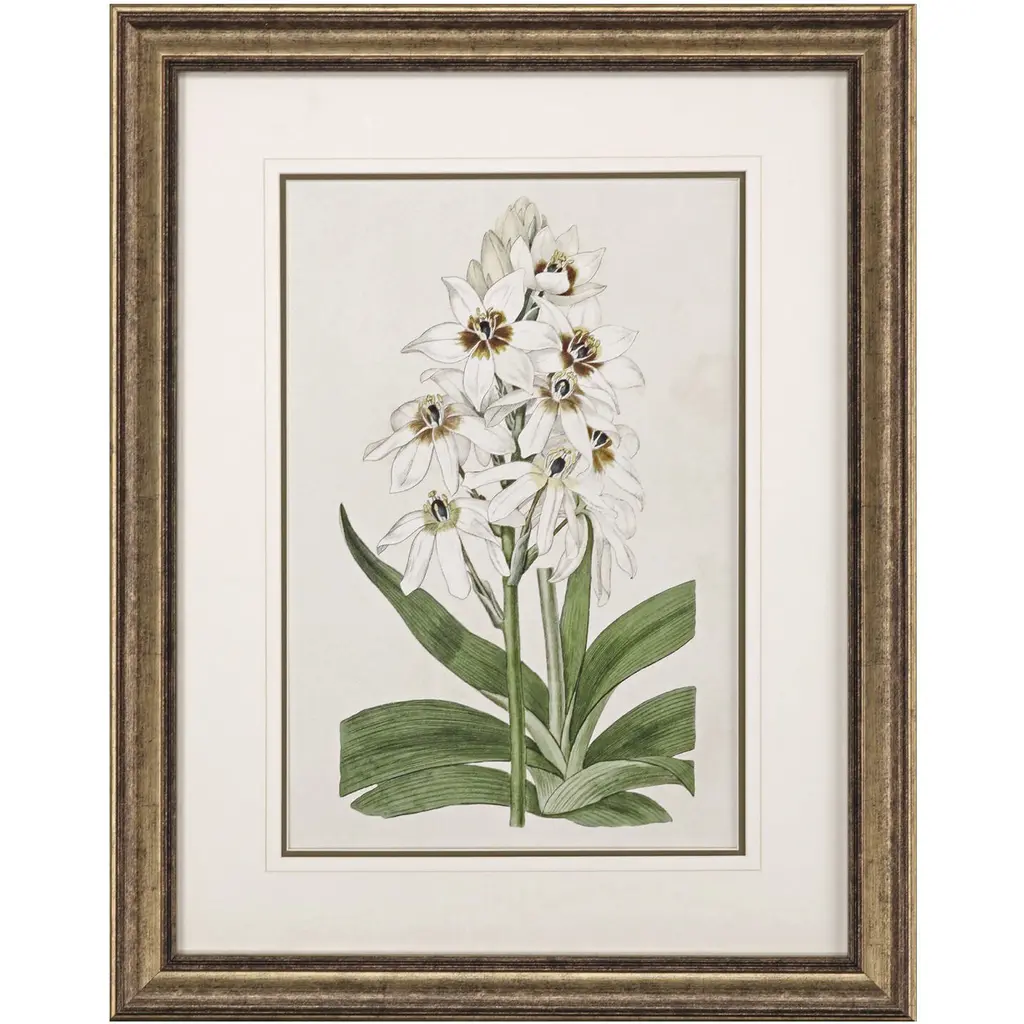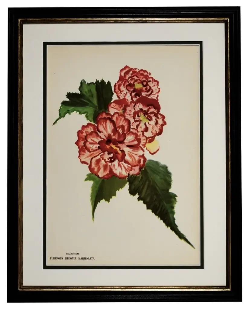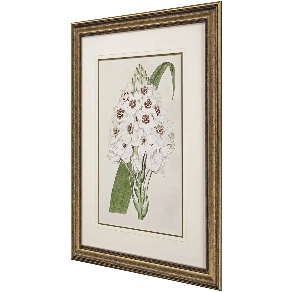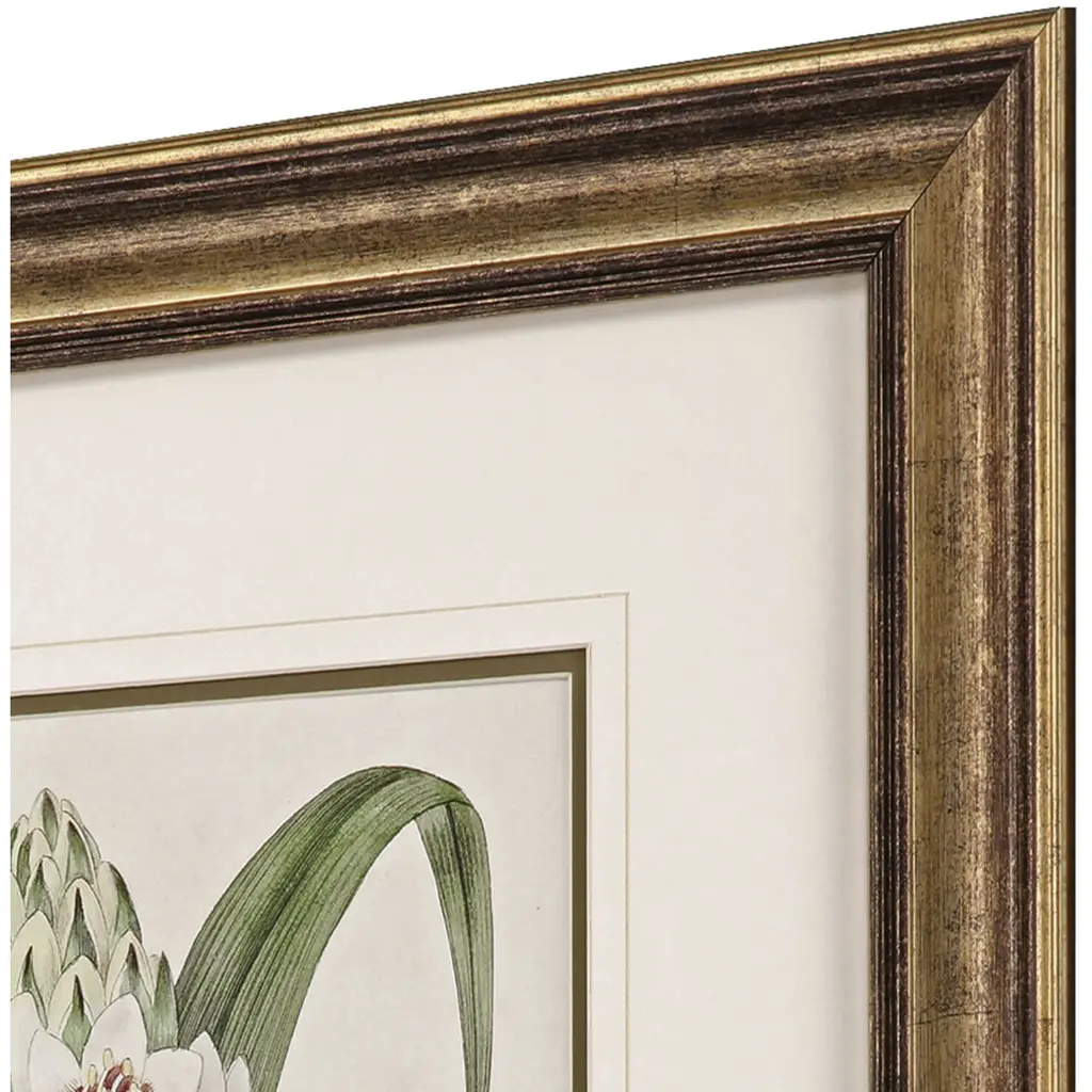 A botanical print that is accentuated with double matting and a v-groove. This piece is framed under glass and paired with a dimensional bronze frame.