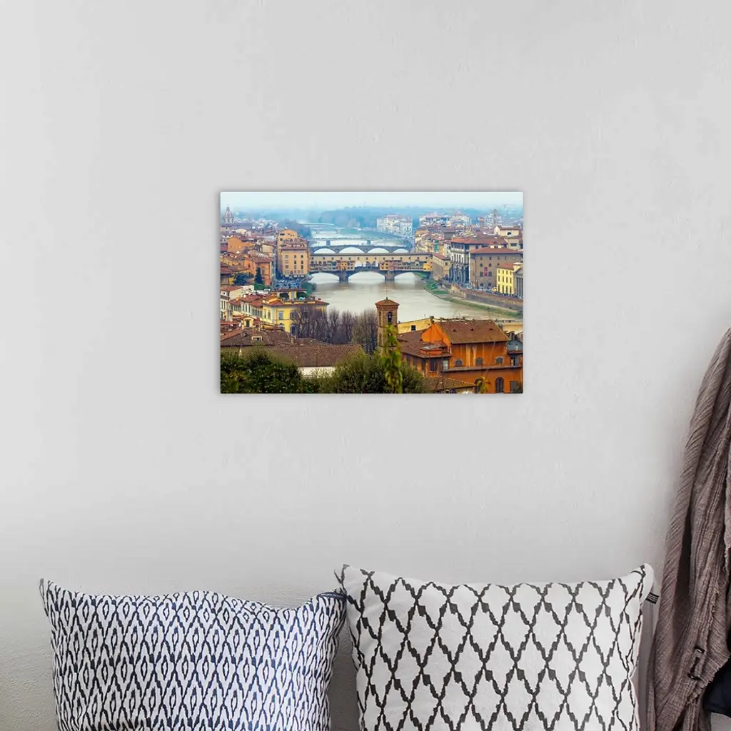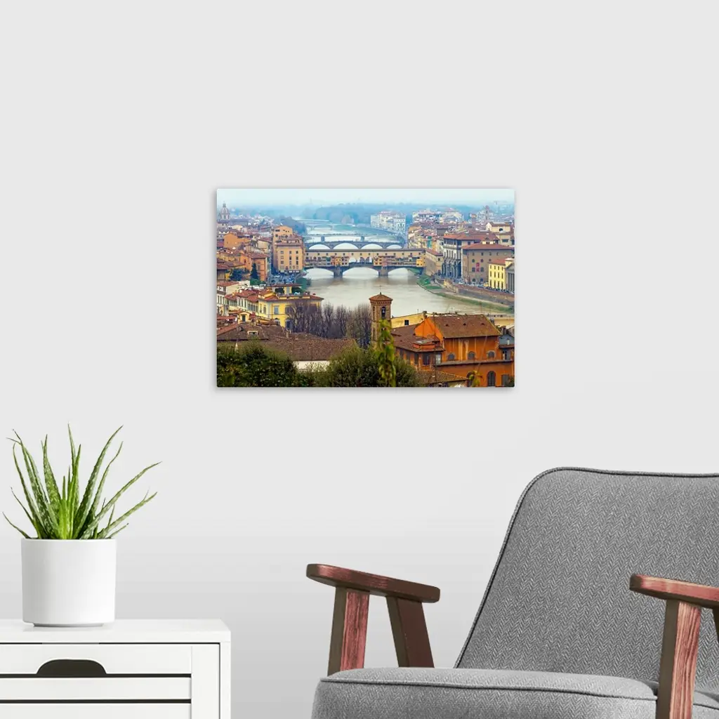 Giant photograph overlooking the Fiume Arno surrounded by a busy city within Italy. On the shores of the river, the buildings and houses that fill the city extend throughout the entire picture, while a variety of bridges span the river in different locations.
