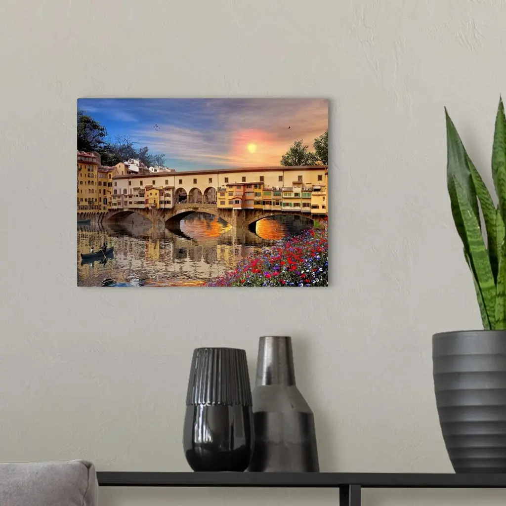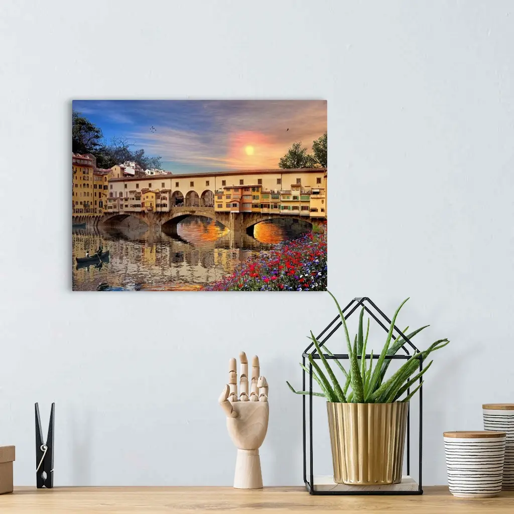 A landscape picture of a bridge in Italy that is reflected in the water below with a canoe rowing toward it and the sun setting behind it.