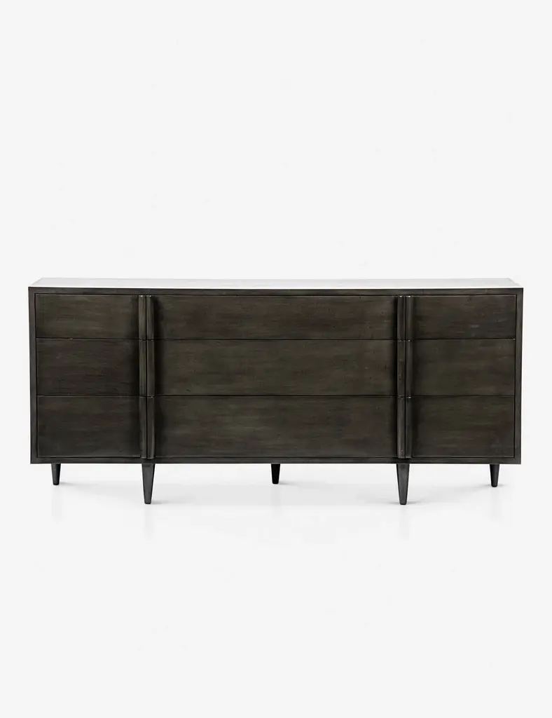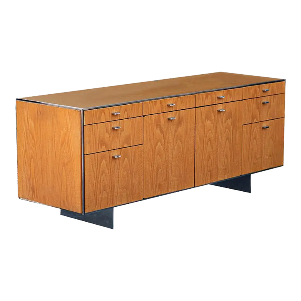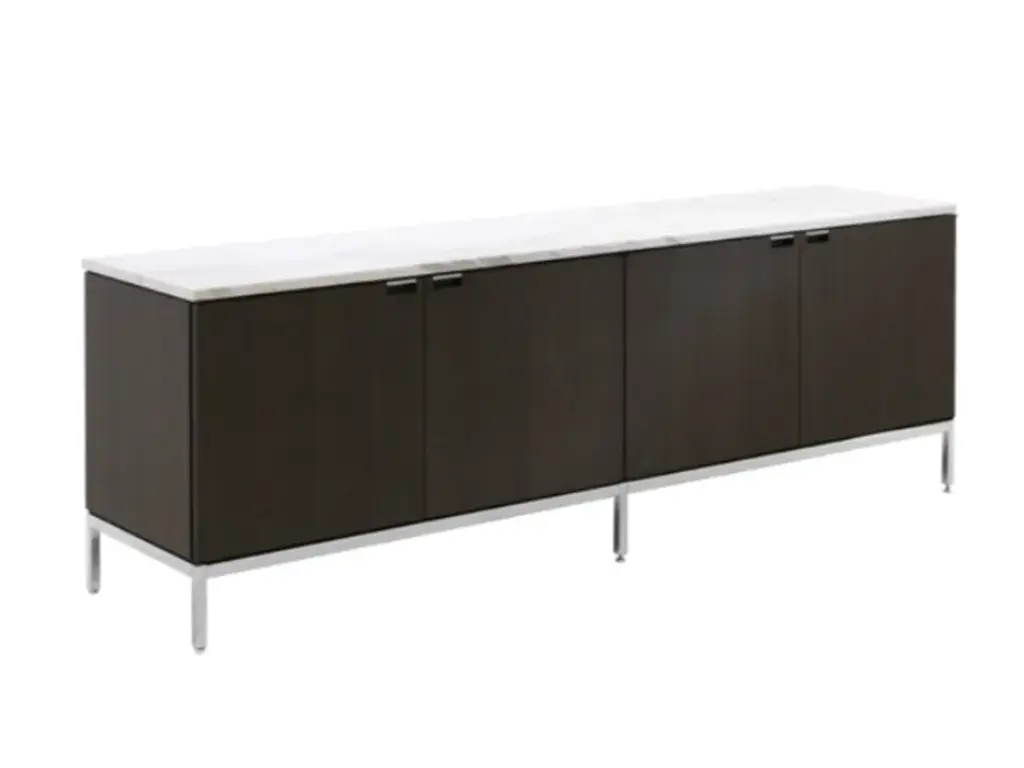 Florence Knoll's credenza designs are reserved and cool, severe and angular, reflecting the objective perfectionism of the early 1960s. The Ten Drawer Credenza includes eight box drawers (each with one removable partition) and two full-extension file drawers with two metal bars each for hanging files. Available in a variety of body veneers, and a choice of matching veneer or marble top options. All marble tops (with the exception of White Extra, and Carrara marbles) can be ordered with a polished finish or satin (matte) finish. The satin finished marble creates a matte sheen that gives the top a natural honed appearance while offering the same protective qualities as the Polished polyester coated marble finish. The credenza base is available in either Polished Chrome or Satin Chrome.