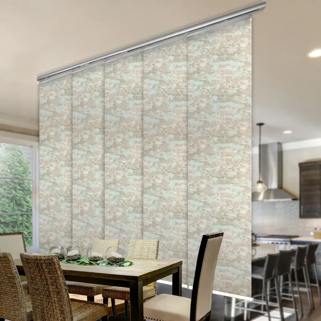 Central Design Products is pleased to introduce a new innovative panel track that offers easy 2-way installation, adding an alluring style and refined touch to your home decor. The single rail design of the track is sleek, compact, and reduces the overall footprint and weight of the installation, eliminating bulky, intrusive window treatments. Adjusting the panel height is a breeze � simply trim the panel, re-attach the liner, and install the panel weight. Detailed instructions are included.The panel track also features a patented slider design, made with aluminum and fitted with bearings that allow for durable and smooth operation. The sliders are stacked closer together than conventional panel tracks, reducing light bleed coming from the gaps between panels. This track has endless uses from dividing rooms, garages, offices, and closets to decorating windows and patios. Available in larger sizes including 8, 10, and 12 panels. Extends from 58-110� wide. Each panel measures 23.5" wide and 91.5" tall, with a total installation height of 94" (includes the 2.5" rail track). The track can be wall or ceiling mounted. The panels can stack on the left or the right. The clearance from the wall is extendable from 1.25� to 3.25� and projection from the wall is extendable from 3� to 4.25�. Florentina panel is made from 100% Polyester, with a light filtering shade that blocks 70% of the light.