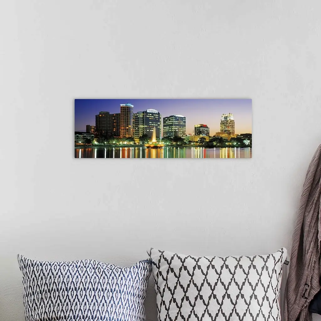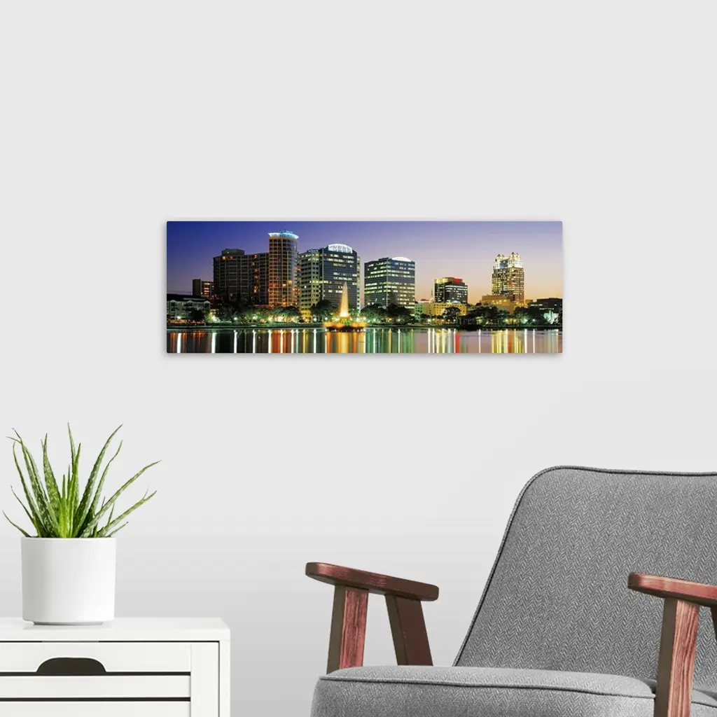 The Orlando skyline is pictured in panoramic view with the buildings illuminated under an evening sky with the lights reflecting in the water below.