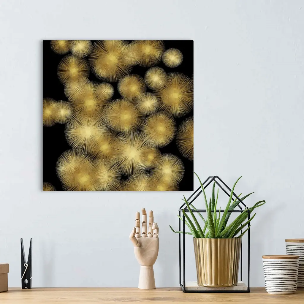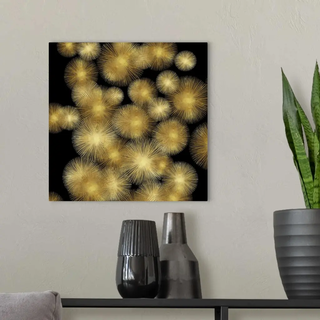 Square decor with circular shapes made out of thin gold lines angled out and disappearing into their gold centers, all on a black background.