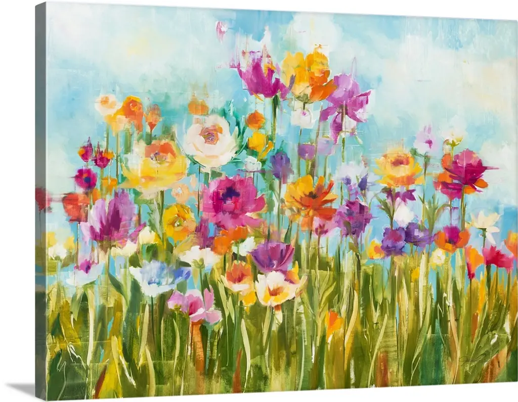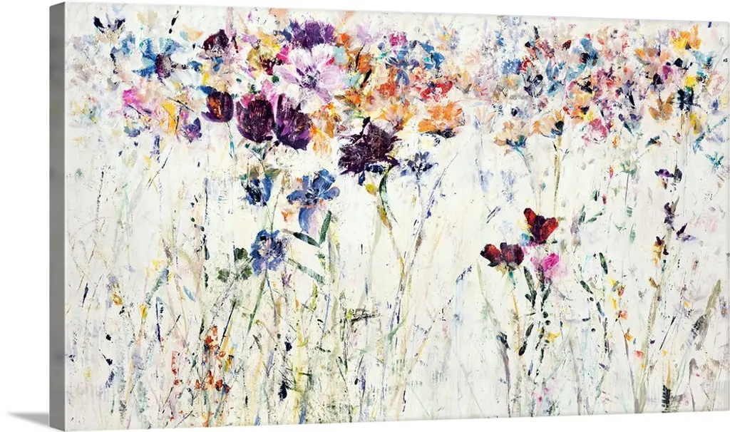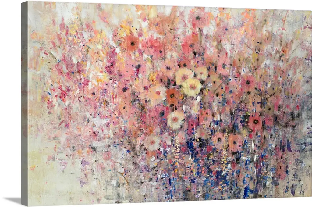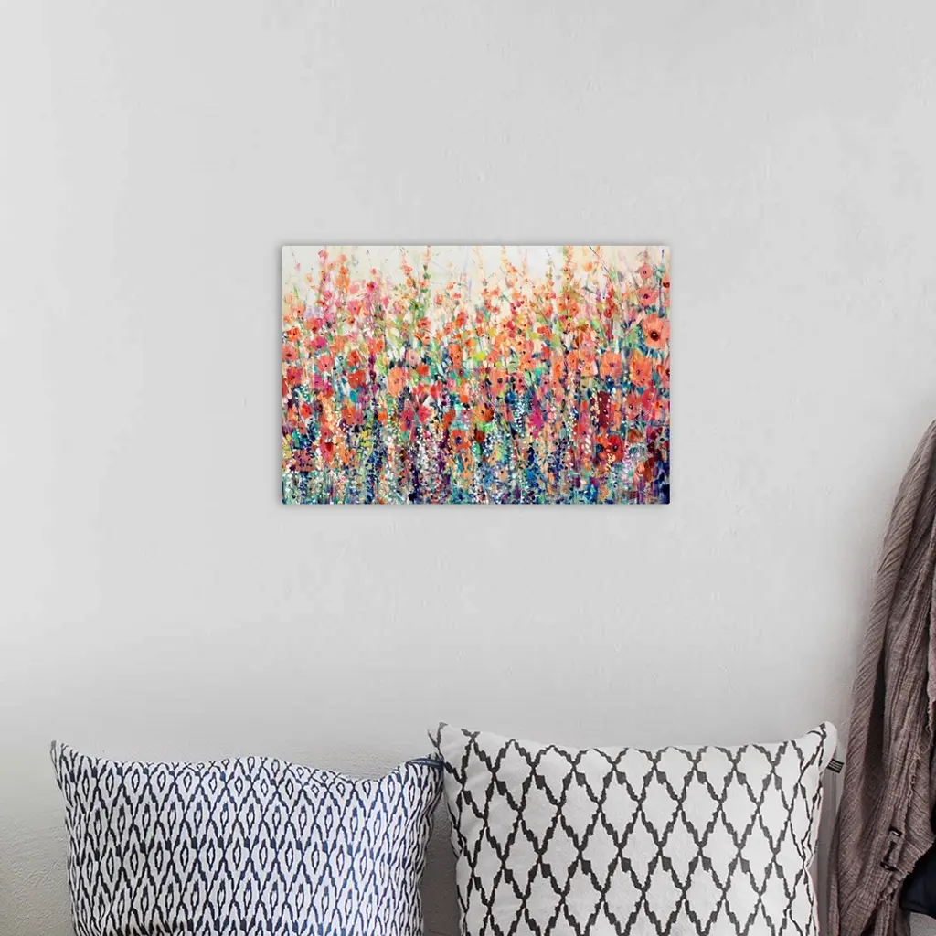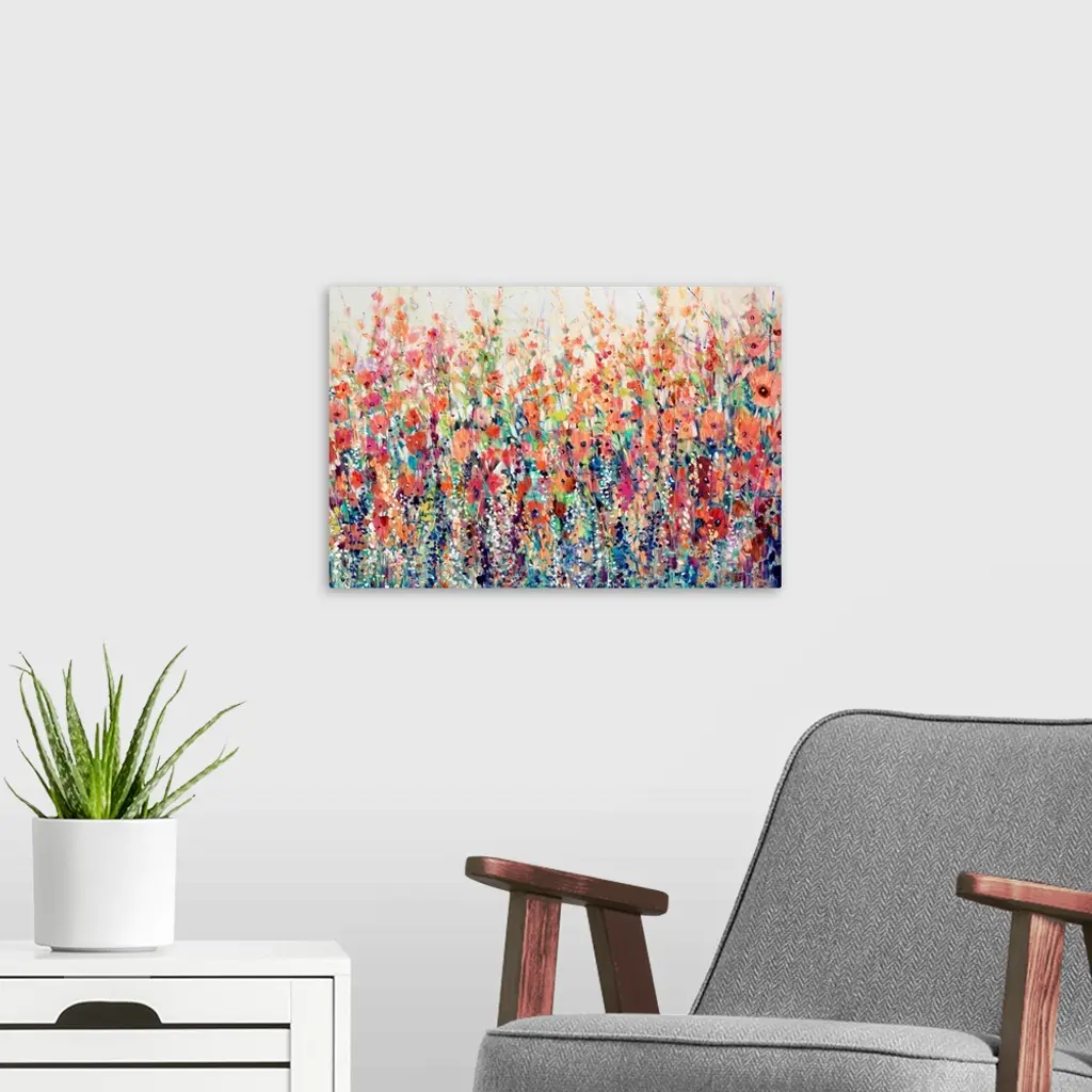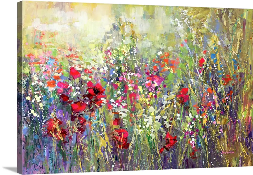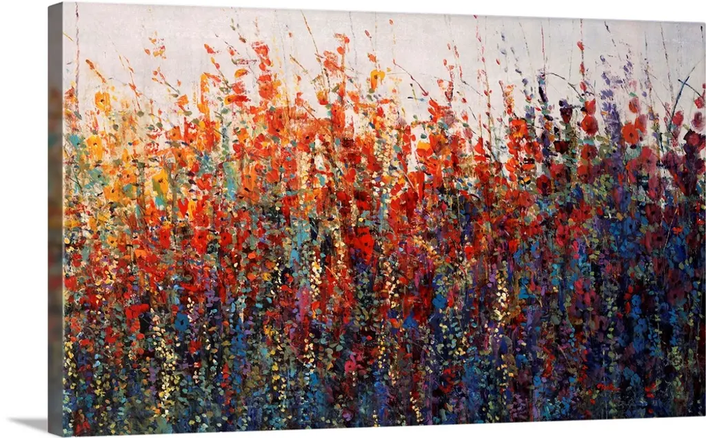 A riot of tall, poppy-like wildflowers and grasses in a blend of warm, light red and orange tones. It's casual impressionist style evokes warm summer days and would bring cheer to any room.