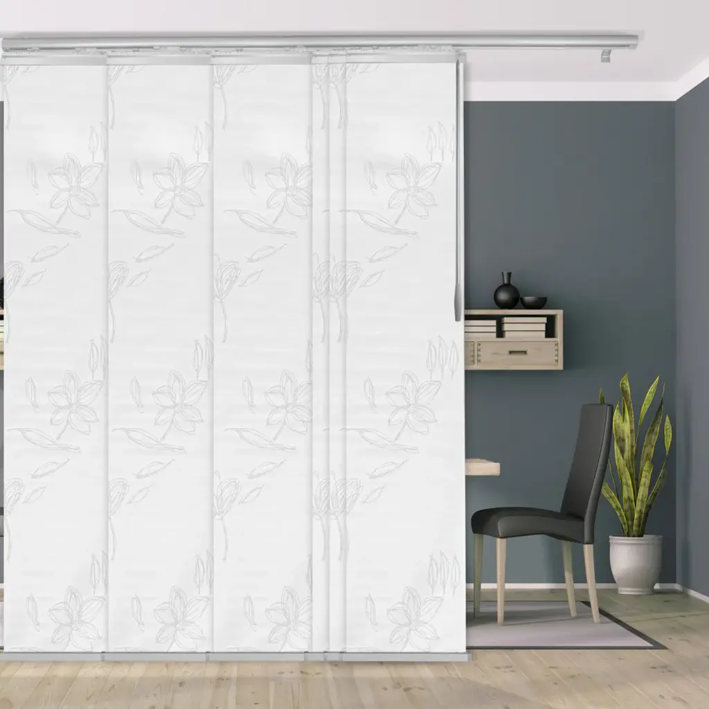 Central Design Products is pleased to introduce a new innovative panel track that offers easy 2-way installation, adding an alluring style and refined touch to your home decor. The single rail design of the track is sleek, compact, and reduces the overall footprint and weight of the installation, eliminating bulky, intrusive window treatments. Adjusting the panel height is a breeze � simply trim the panel, re-attach the liner, and install the panel weight. Detailed instructions are included.The panel track also features a patented slider design, made with aluminum and fitted with bearings that allow for durable and smooth operation. The sliders are stacked closer together than conventional panel tracks, reducing light bleed coming from the gaps between panels. This track has endless uses from dividing rooms, garages, offices, and closets to decorating windows and patios. Available in larger sizes including 8, 10, and 12 panels. Extends from 98-130� wide. Each panel measures 23.5" wide and 116" tall, with a total installation height of 118.5" (includes the 2.5" rail track). The track can be wall or ceiling mounted. The panels can stack on the left or the right. The clearance from the wall is extendable from 1.25� to 3.25� and projection from the wall is extendable from 3� to 4.25�. Flourishing White panel is made from 65% Polyester 35% Rayon, with a light filtering shade that blocks 50% of the light.