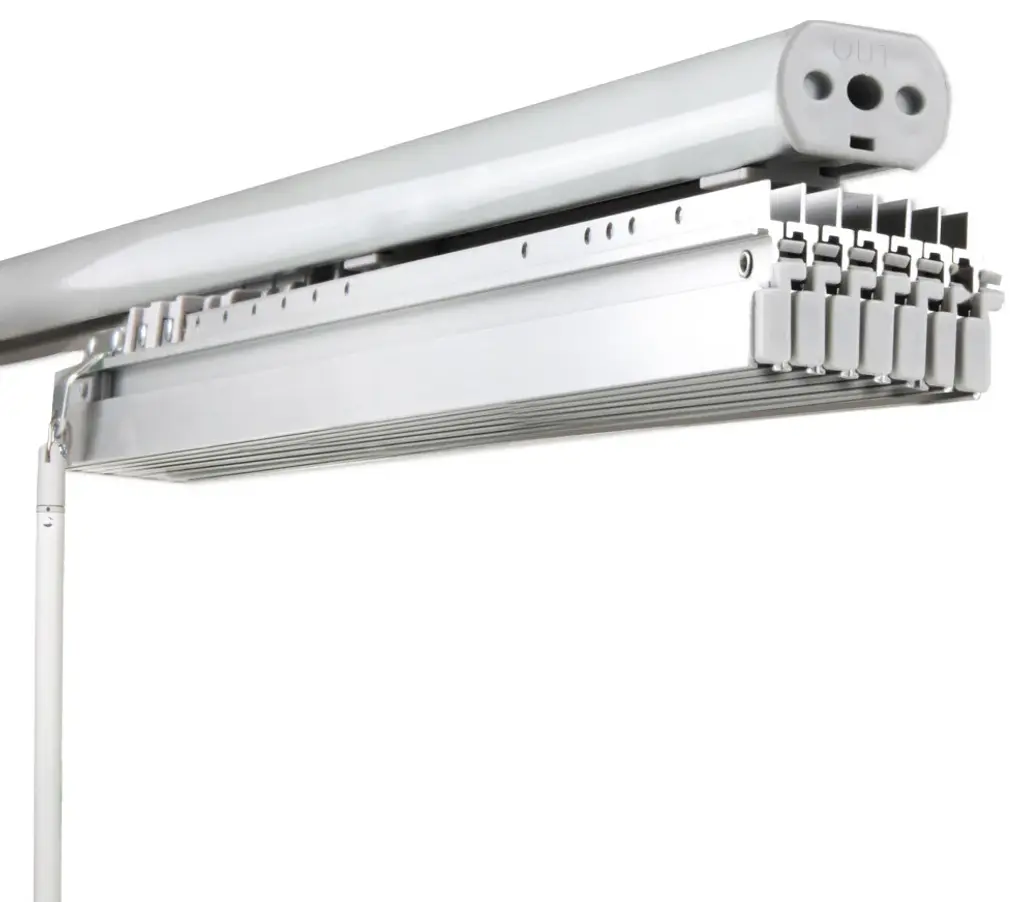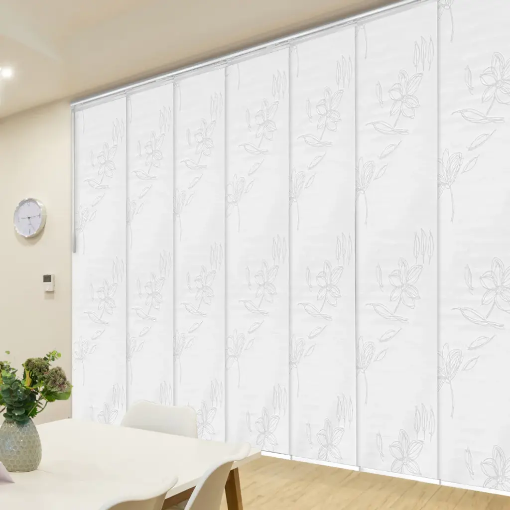 Central Design Products is pleased to introduce a new innovative panel track that offers easy 2-way installation, adding an alluring style and refined touch to your home decor. The single rail design of the track is sleek, compact, and reduces the overall footprint and weight of the installation, eliminating bulky, intrusive window treatments. Adjusting the panel height is a breeze � simply trim the panel, re-attach the liner, and install the panel weight. Detailed instructions are included.The panel track also features a patented slider design, made with aluminum and fitted with bearings that allow for durable and smooth operation. The sliders are stacked closer together than conventional panel tracks, reducing light bleed coming from the gaps between panels. This track has endless uses from dividing rooms, garages, offices, and closets to decorating windows and patios. Available in larger sizes including 8, 10, and 12 panels. Extends from 110-153� wide. Each panel measures 23.5" wide and 116" tall, with a total installation height of 118.5" (includes the 2.5" rail track). The track can be wall or ceiling mounted. The panels can stack on the left or the right. The clearance from the wall is extendable from 1.25� to 3.25� and projection from the wall is extendable from 3� to 4.25�. Flourishing White panel is made from 65% Polyester 35% Rayon, with a light filtering shade that blocks 50% of the light.