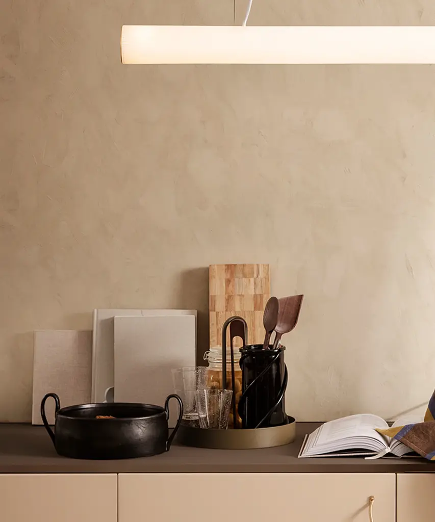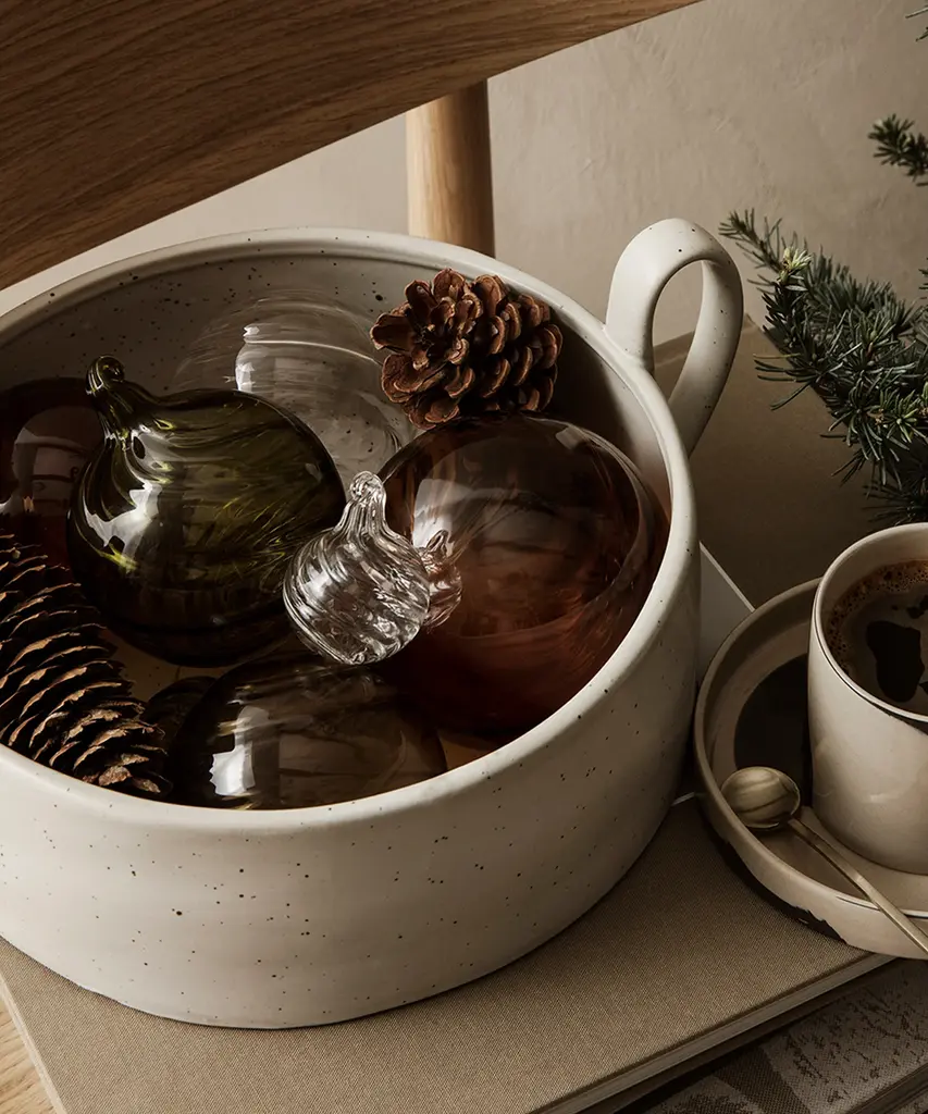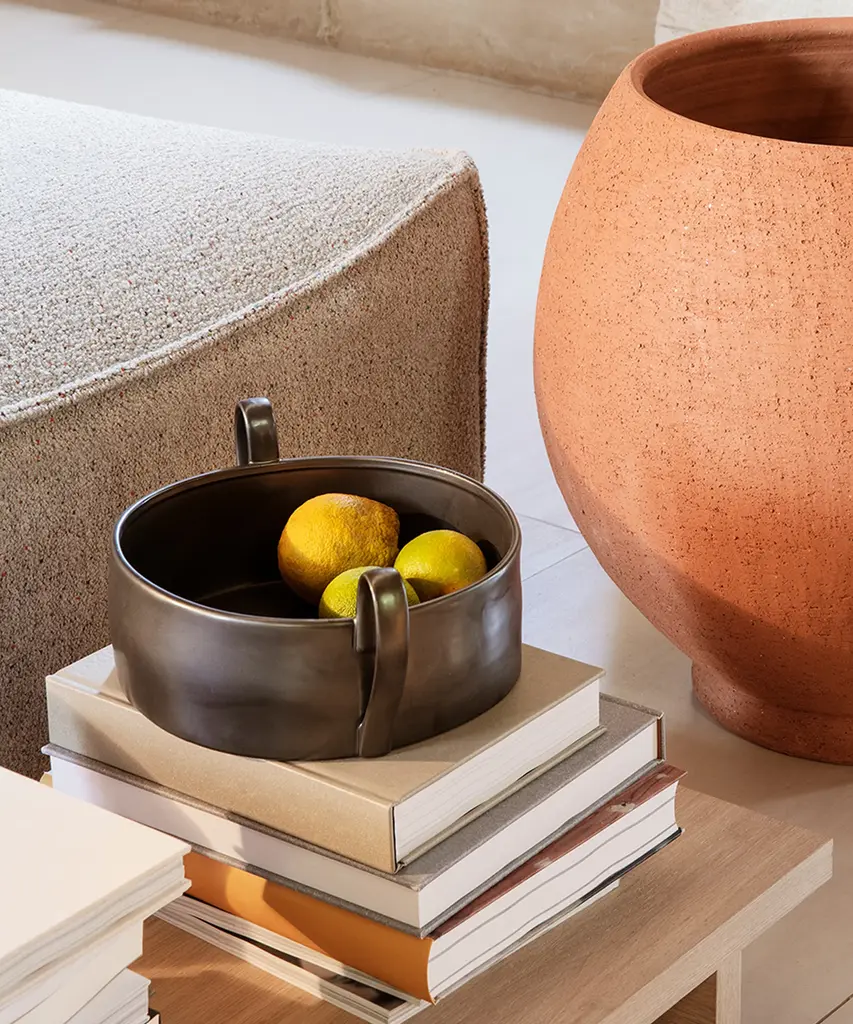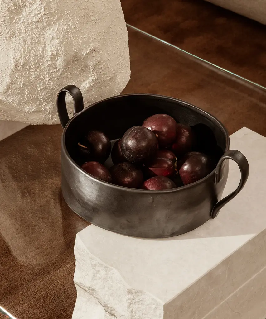 Flow is a series of perfectly imperfect tableware made to modern sensibilities using traditional craftsmanship techniques. All the items are detailed with a semi-matte glaze for a unique expression. The simple, clean lines of this large bowl are offset with two distinctive elongated handles that are sure to make this the central piece of any table setting. Produced by the Copenhagen-based studio Ferm Living.