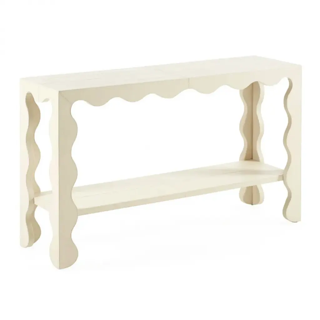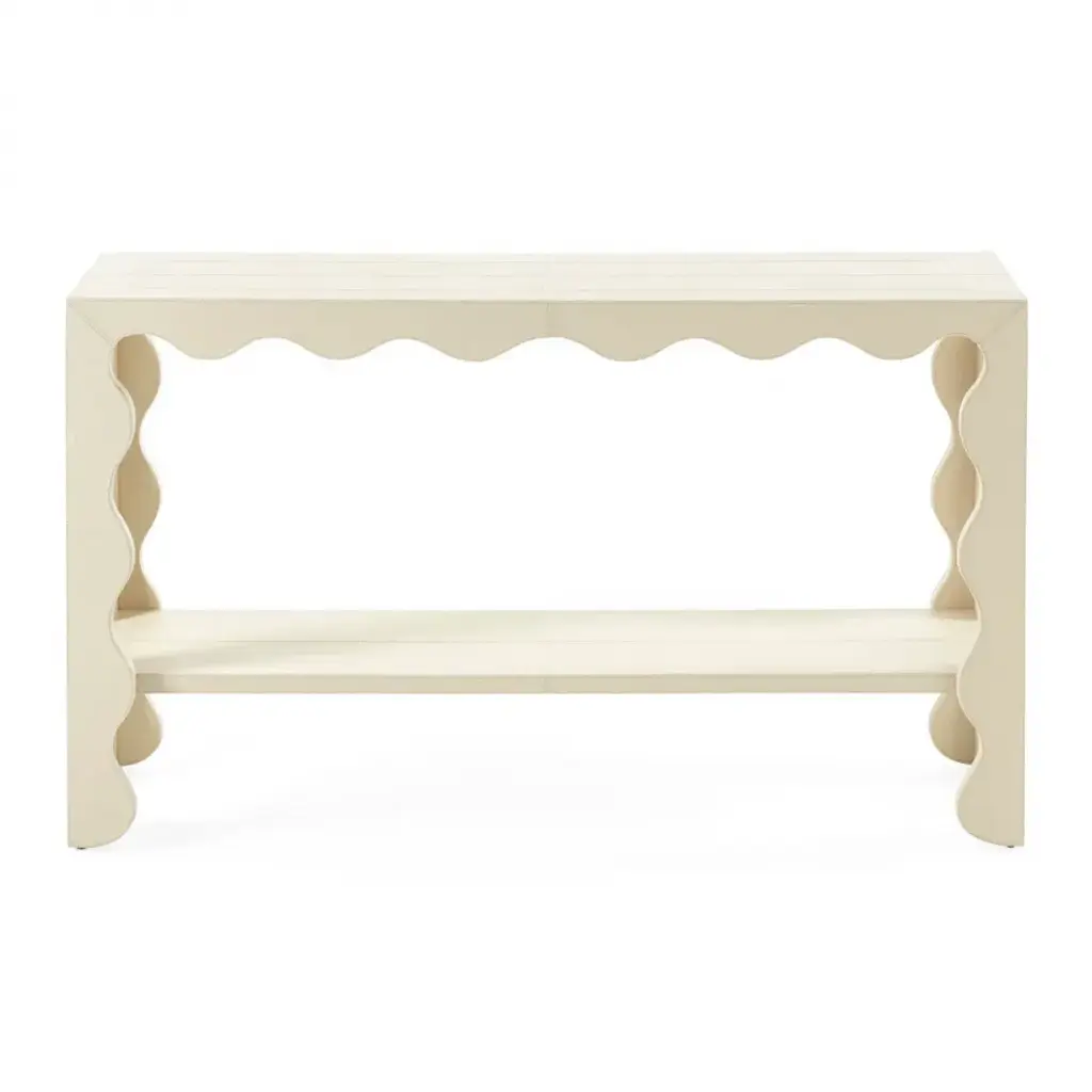 Endlessly Luxe.Simple form meets luxe material in our Flow collection. Featuring an undulating edge, our Flow Leather Console is crafted from pebbled leather in two forever favorites—versatile bone and mariner blue hues—each with timeless topstitched borders. A leather-lined bottom shelf offers generous space for styling books and décor. The perfect piece behind a sofa or a luxe entryway.