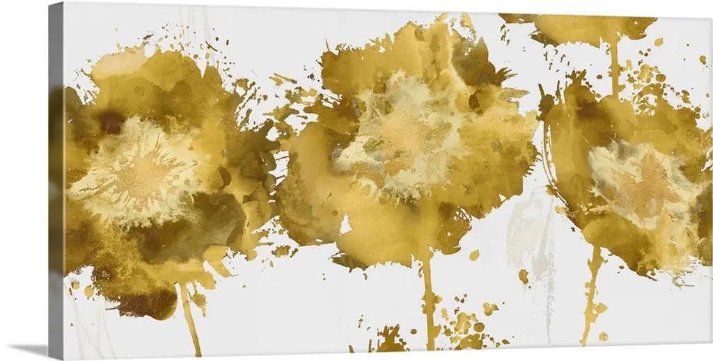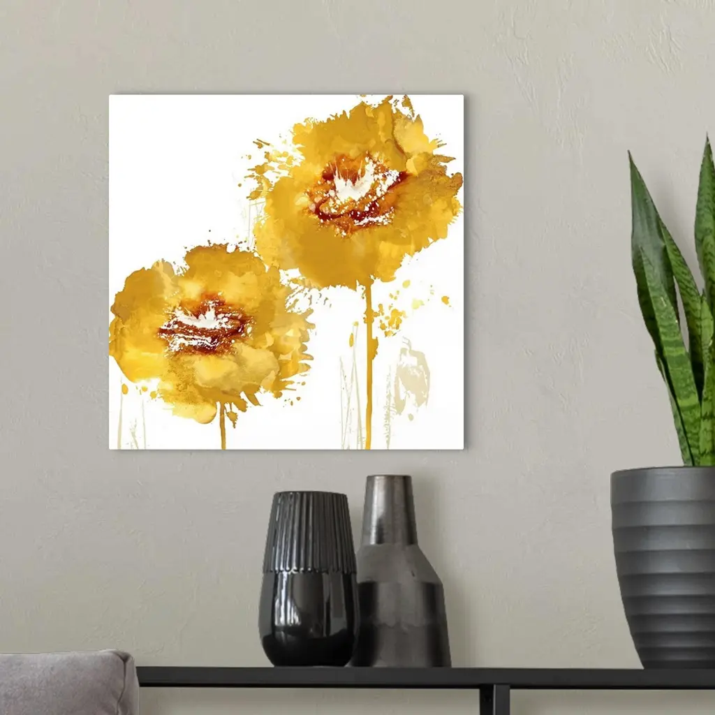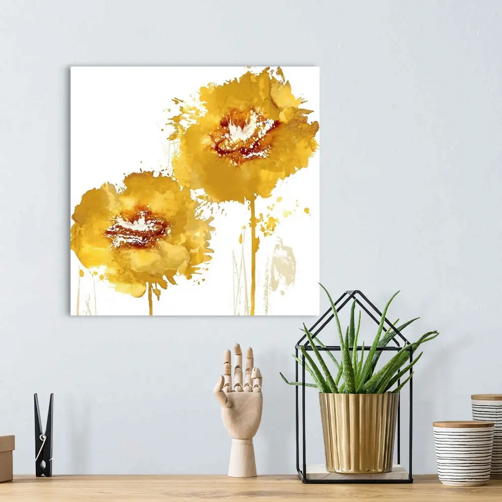 Square decor with two warm paint splattered flowers in gold and orange hues.
