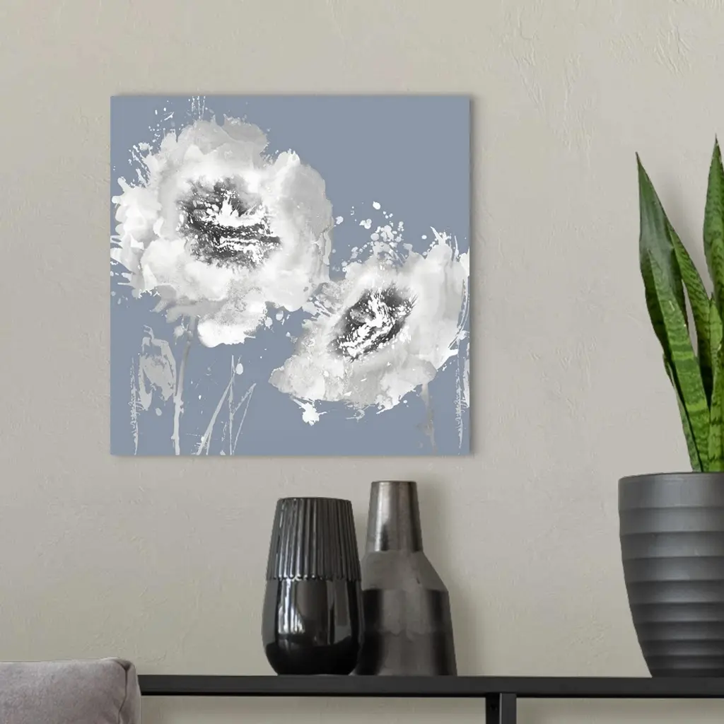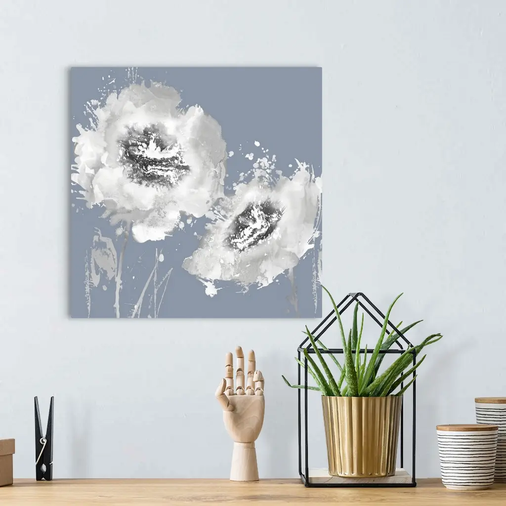 Square decor with two paint splattered flowers in silver, white and black hues on a powder blue background.