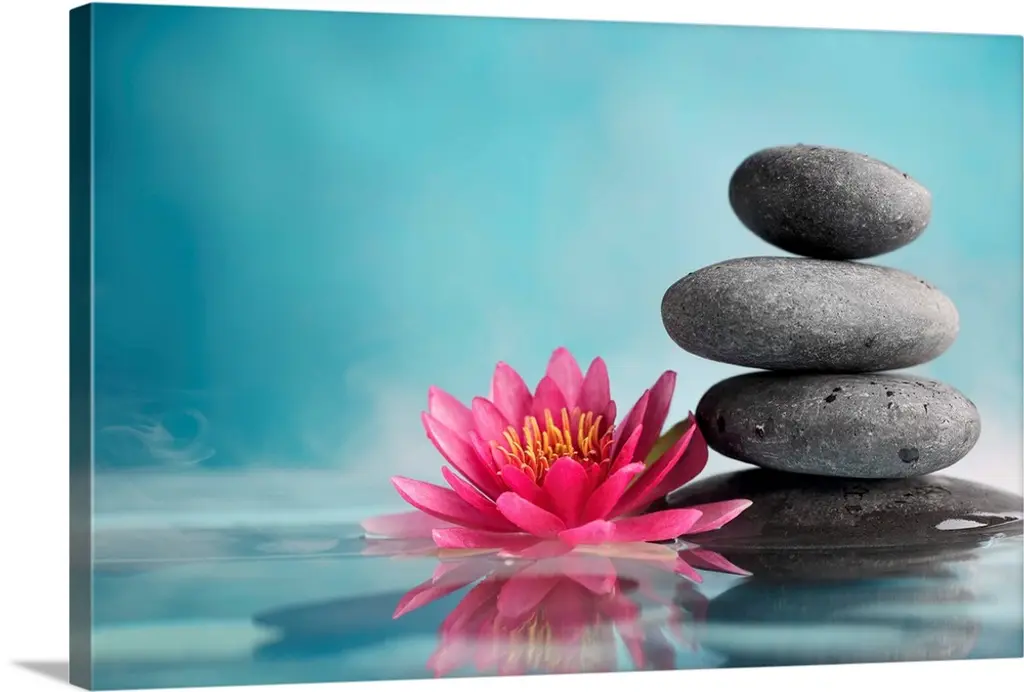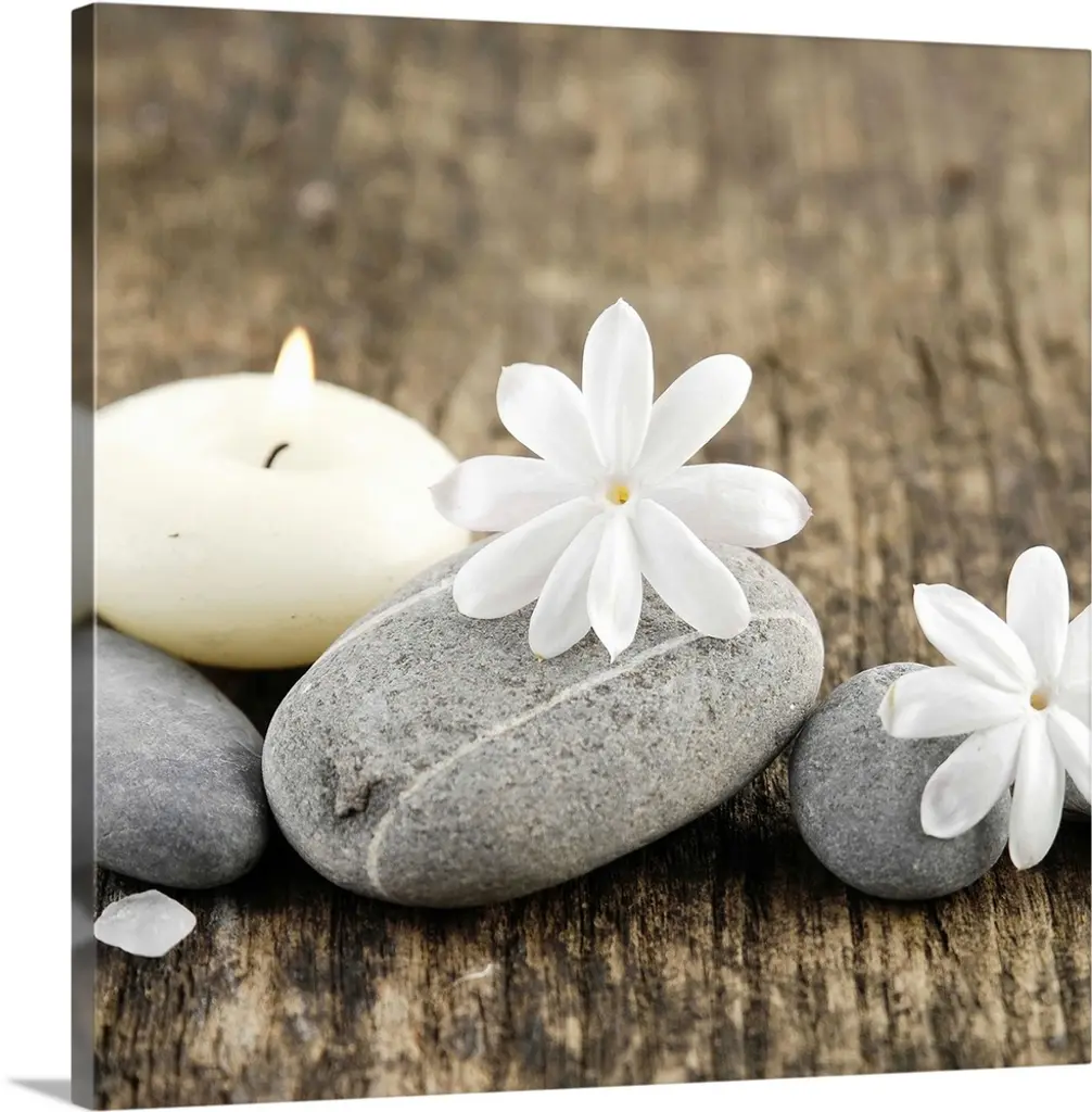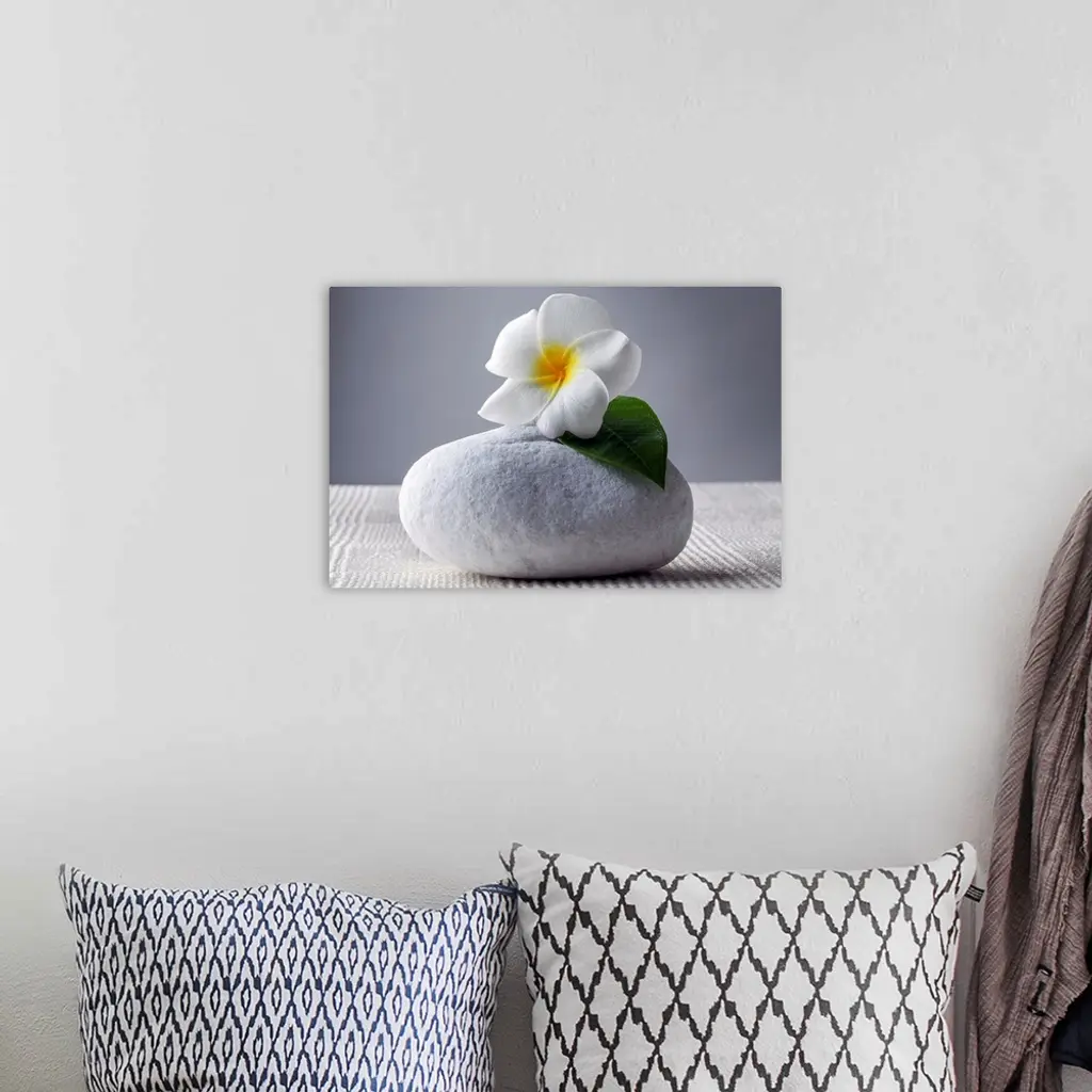 A beautiful white flower with a yellow center and one green leaf is placed on top of a large white stone.