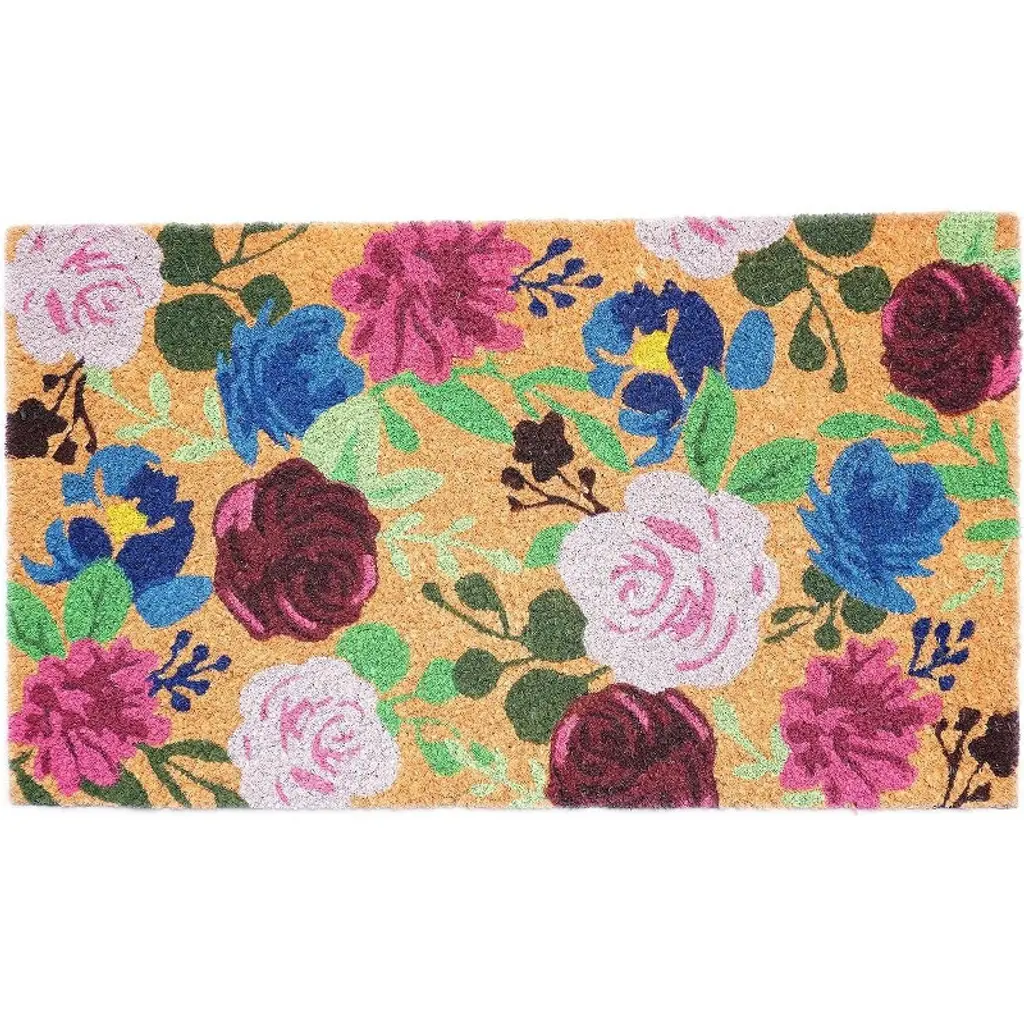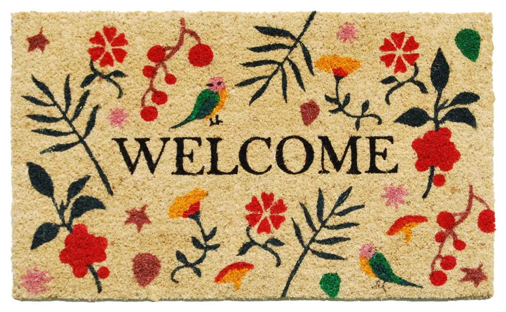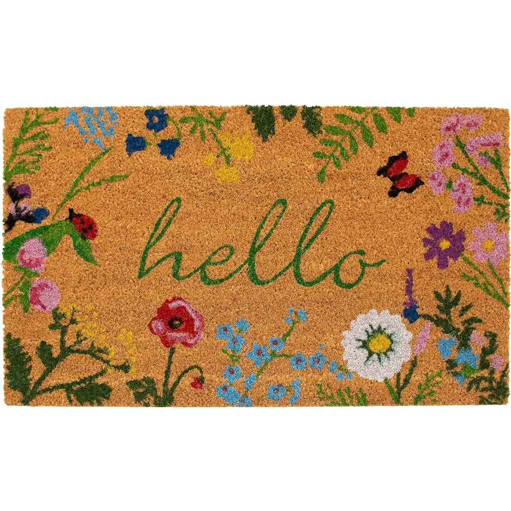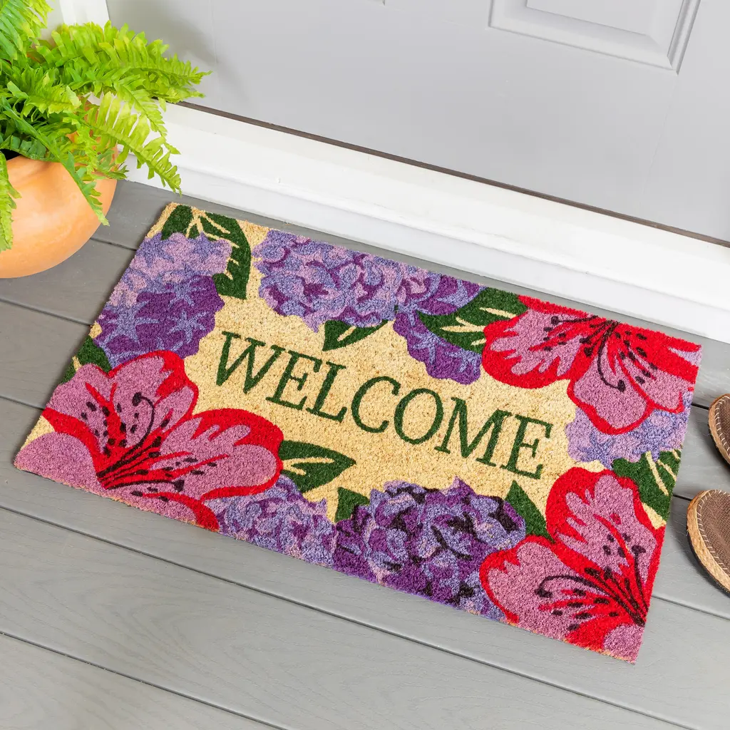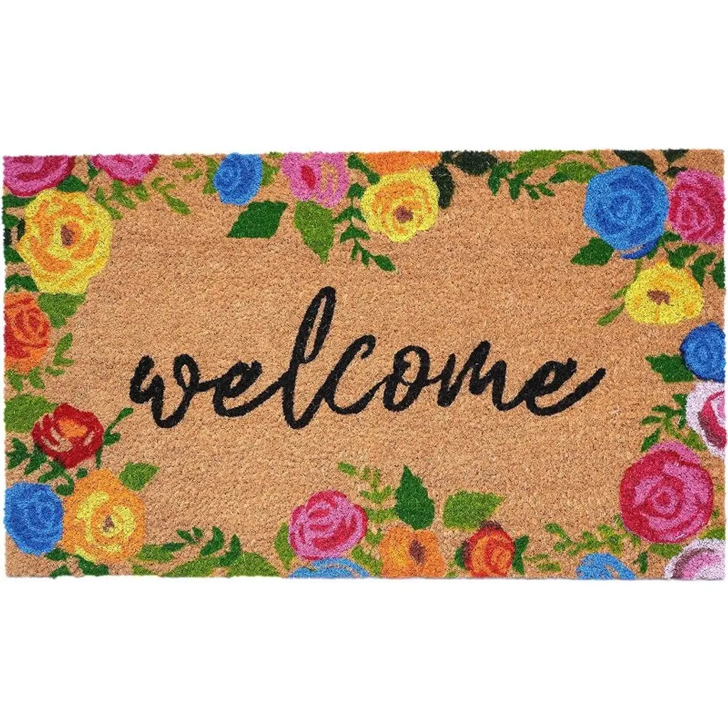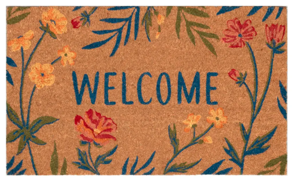 The wreath of flowers around the “Welcome” message on this garden door mat make a cheerful and charming greeting on any stoop. Ideal for spring, summer, and beyond, this mat design is sure to brighten any space. Crafted from coco husk fiber, the eye-catching mat is natural and eco-friendly. Ideal for high-traffic areas, the mat traps dirt and debris to prevent messes from being tracked into homes. Designs are printed directly on the mats with fade-resistant dyes. Since the mat is crafted from natural coir, some shedding is to be expected. Shake off excess fibers or use a soft brush to gently sweep.