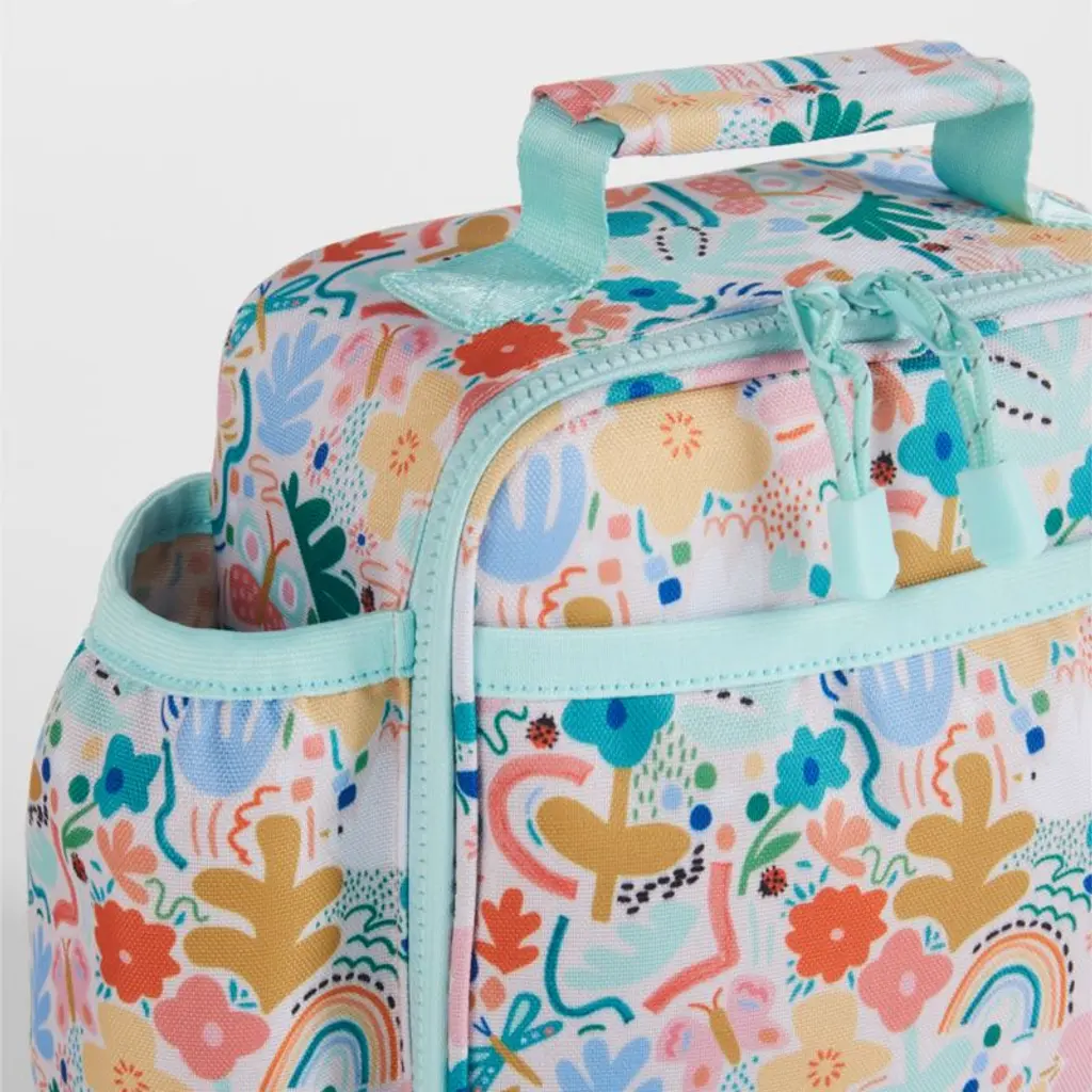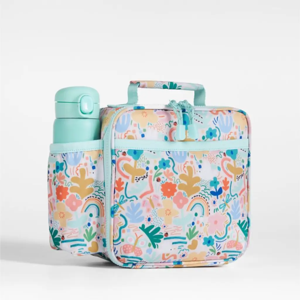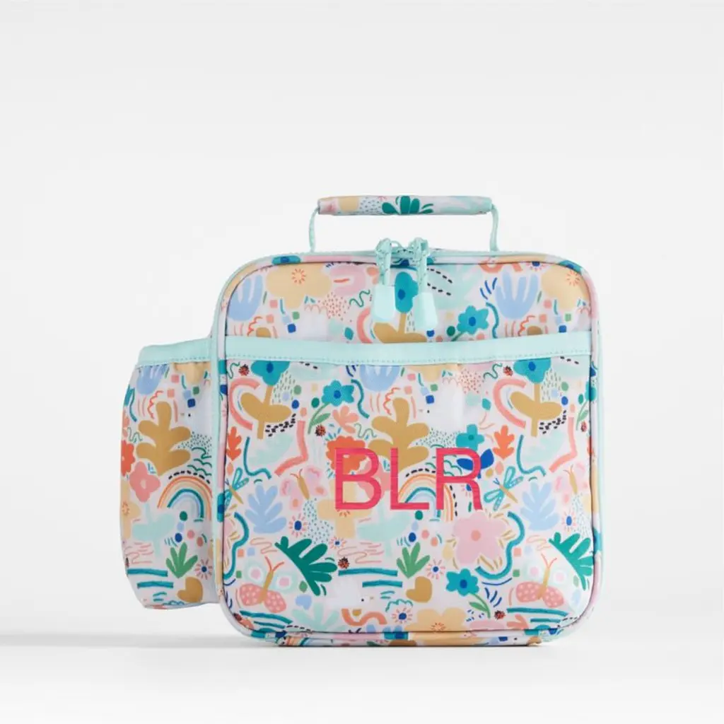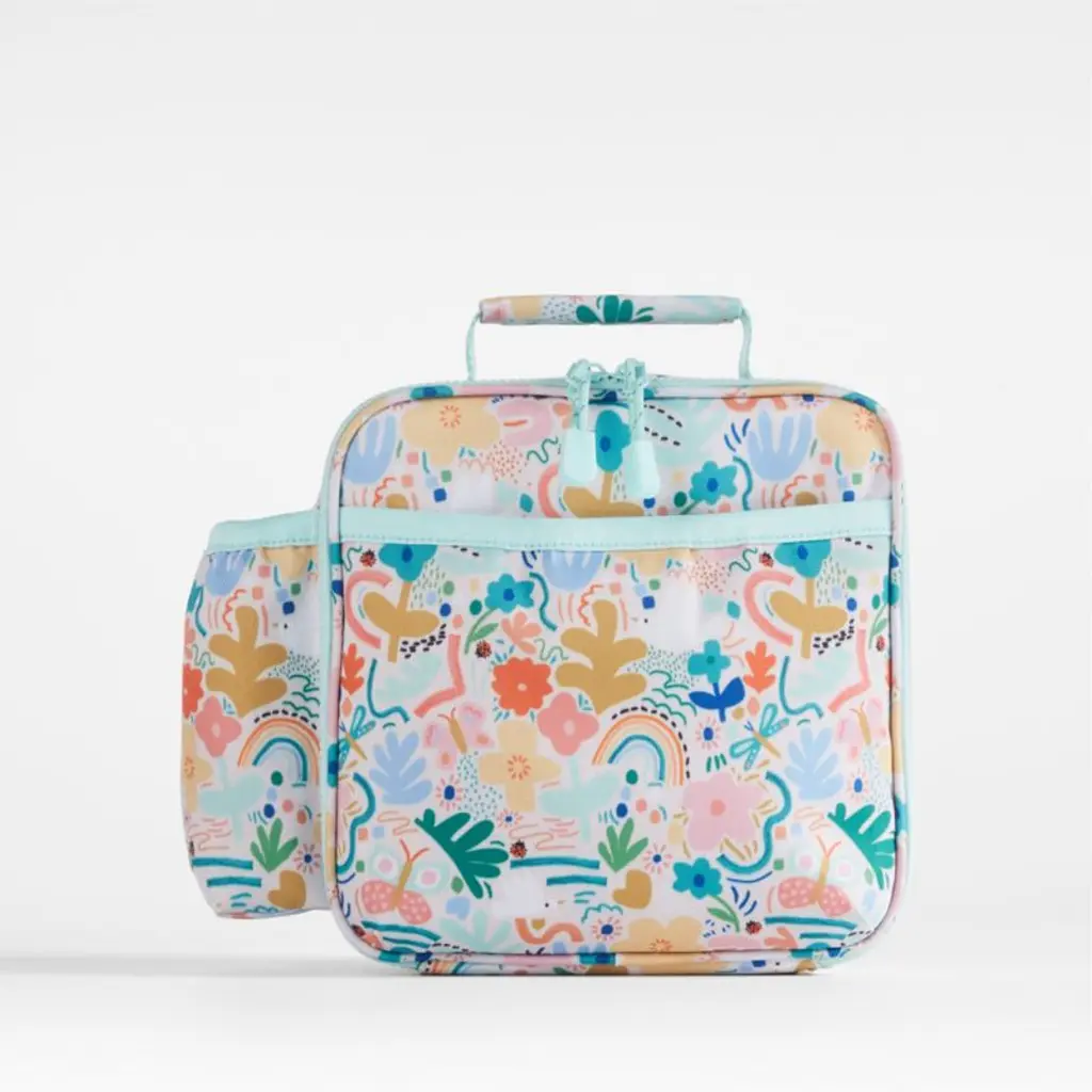 A fun and functional lunch box that's built to handle all the thrills and spills of the day. A colorful collection of garden friends flit and flutter over the bag's bright white exterior, and light aqua trim gives it a fresh flourish. Constructed of food-safe and supremely durable polyester made from recycled water bottles, our lightweight, easy-clean lunch box is roomy enough to hold multiple storage containers. Plus, it's insulated to keep meals just the way your kid likes themhot, cold or somewhere in between. An outer pocket safely stows a napkin, utensils, daily reminder notes and more, and a designated water bottle pocket ensures their drink is always close at hand. Pair the floral lunch box with the matching Flower Garden backpack and water bottle to grow their collection.