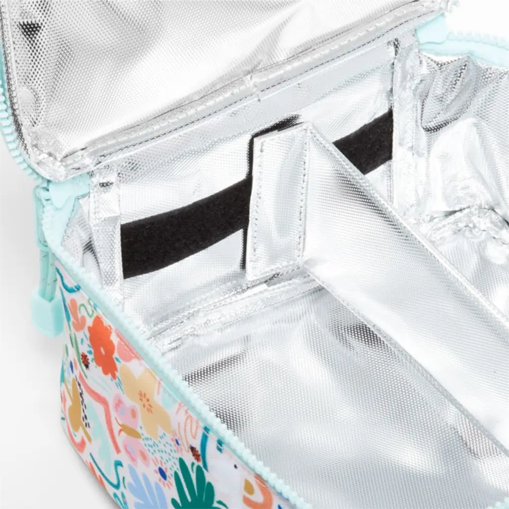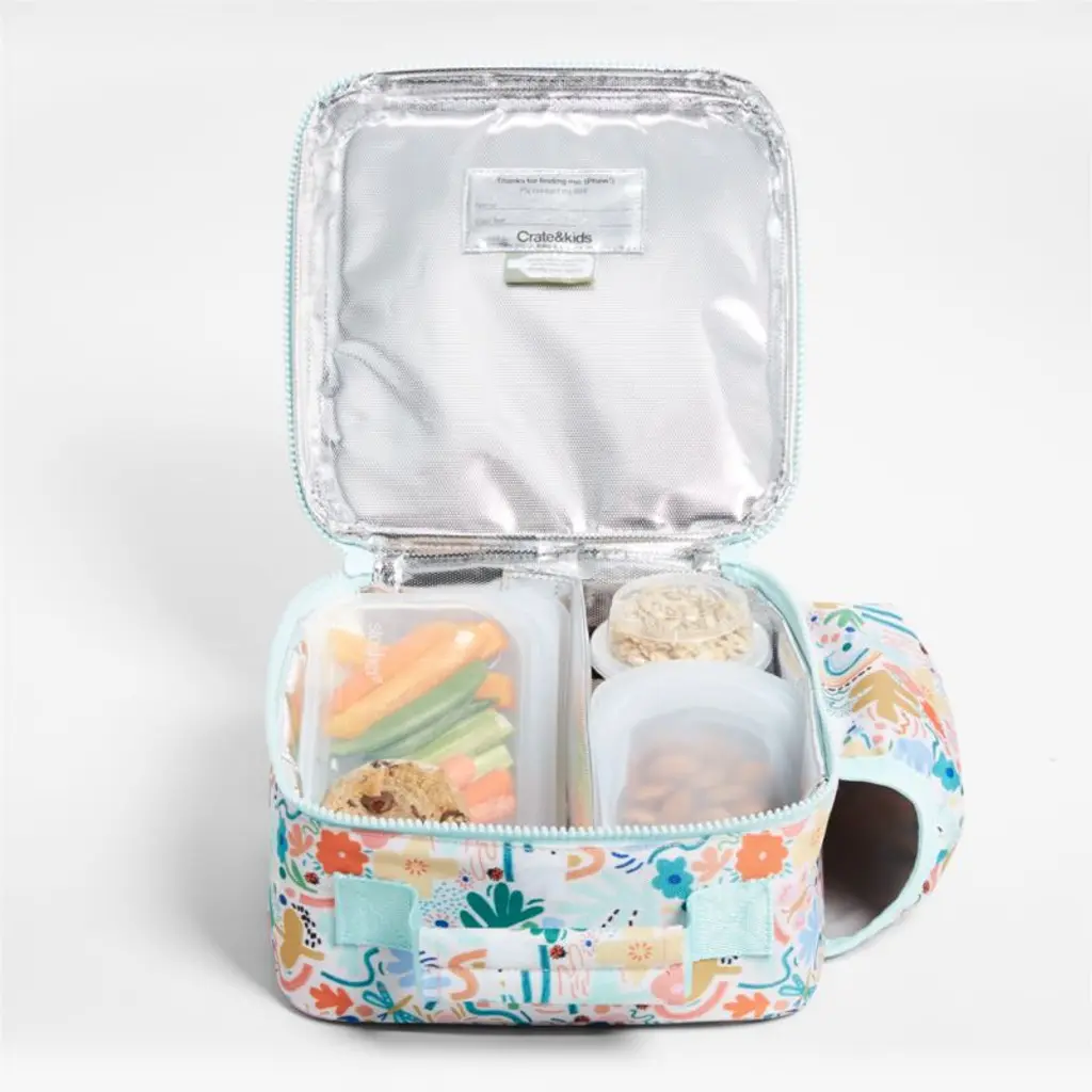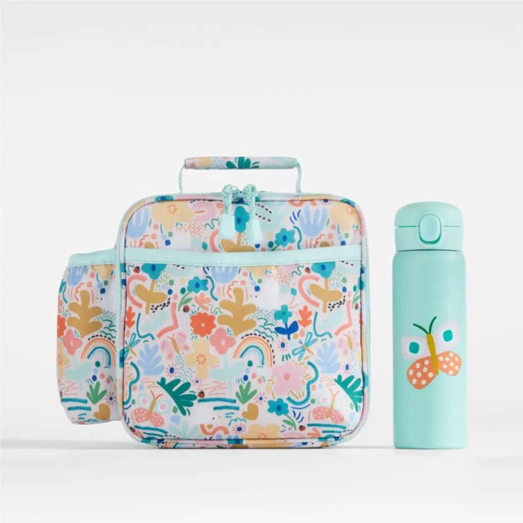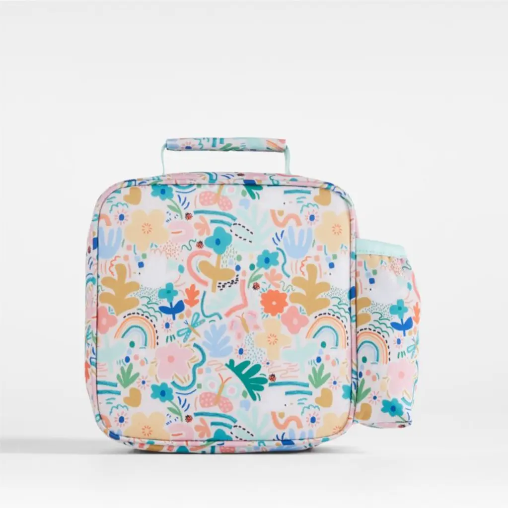 A fun and functional lunch box that's built to handle all the thrills and spills of the day. A colorful collection of garden friends flit and flutter over the bag's bright white exterior, and light aqua trim gives it a fresh flourish. Constructed of food-safe and supremely durable polyester made from recycled water bottles, our lightweight, easy-clean lunch box is roomy enough to hold multiple storage containers. Plus, it's insulated to keep meals just the way your kid likes themhot, cold or somewhere in between. An outer pocket safely stows a napkin, utensils, daily reminder notes and more, and a designated water bottle pocket ensures their drink is always close at hand. Pair the floral lunch box with the matching Flower Garden backpack and water bottle to grow their collection.