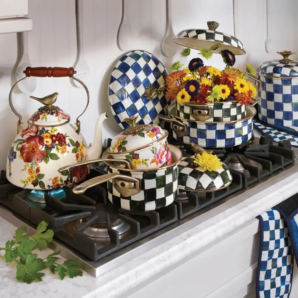 Bubbling over with MacKenzie-Childs style, our Flower Market tea kettle will have you finding new reasons to put the kettle on to boil. The heavy-gauge steel underbody is glazed with lush garden hues, hand-decorated with fanciful botanical decals, and rimmed in bronzed stainless steel. Wood handle and glass-topped lid. Gorgeous and filled with fresh-cut flowers, too.