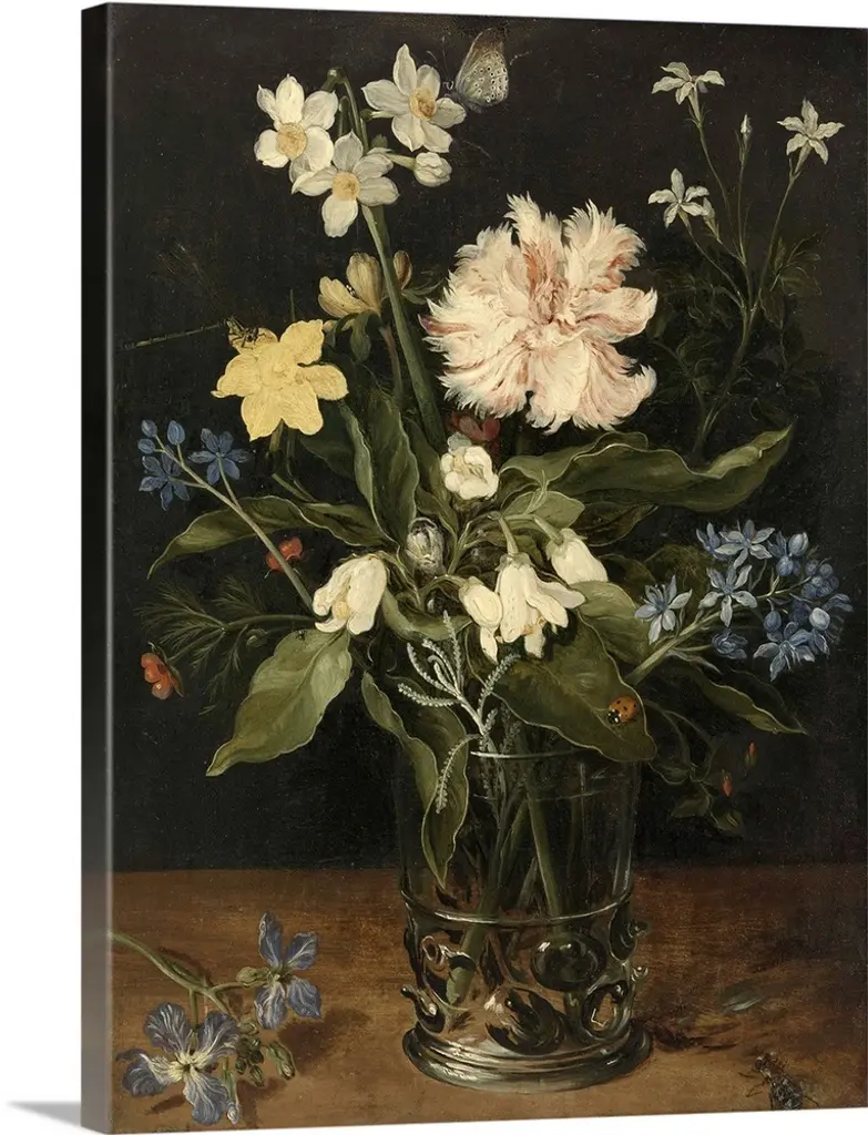 Flowers are painted growing out of a glass vase against a dark background. Some of the flowers are dying and drooping over the side.