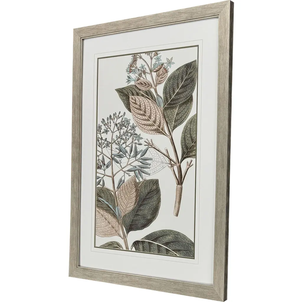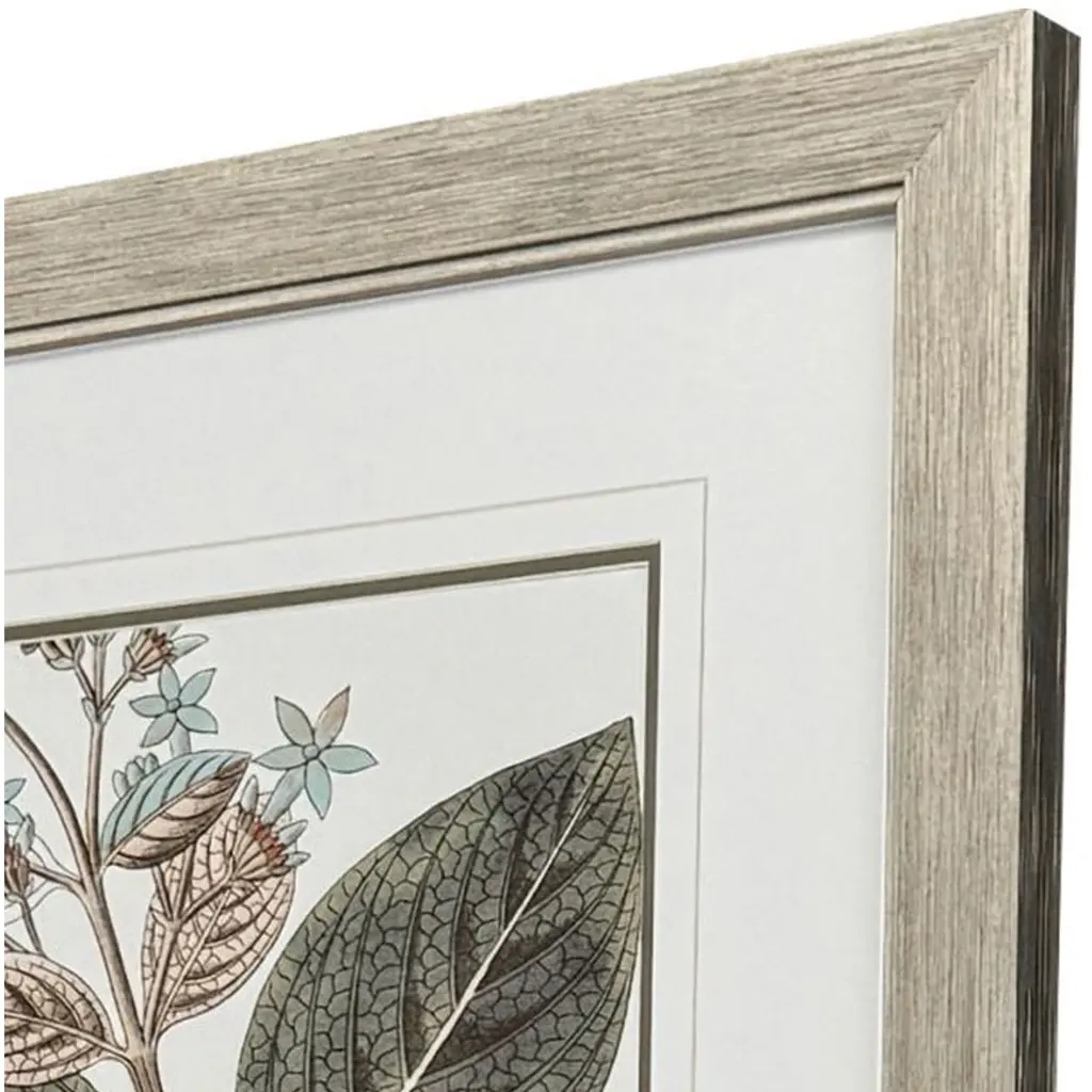 Flower stem botanicals are double matted in white and moss. They are framed in a distressed silver finish molding with a combed embossed pattern.