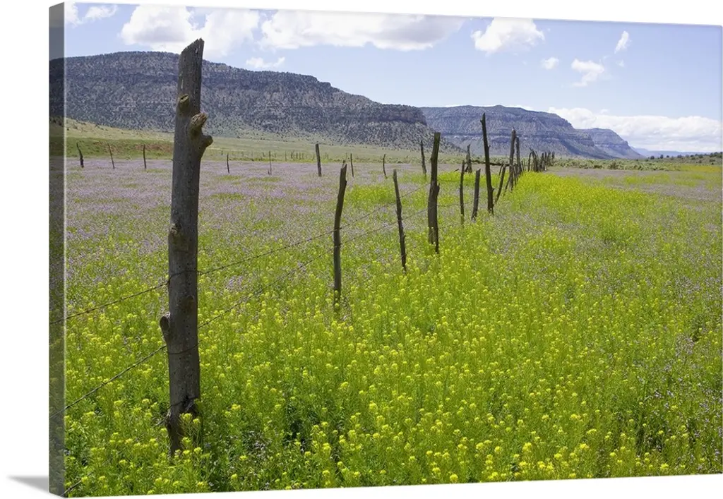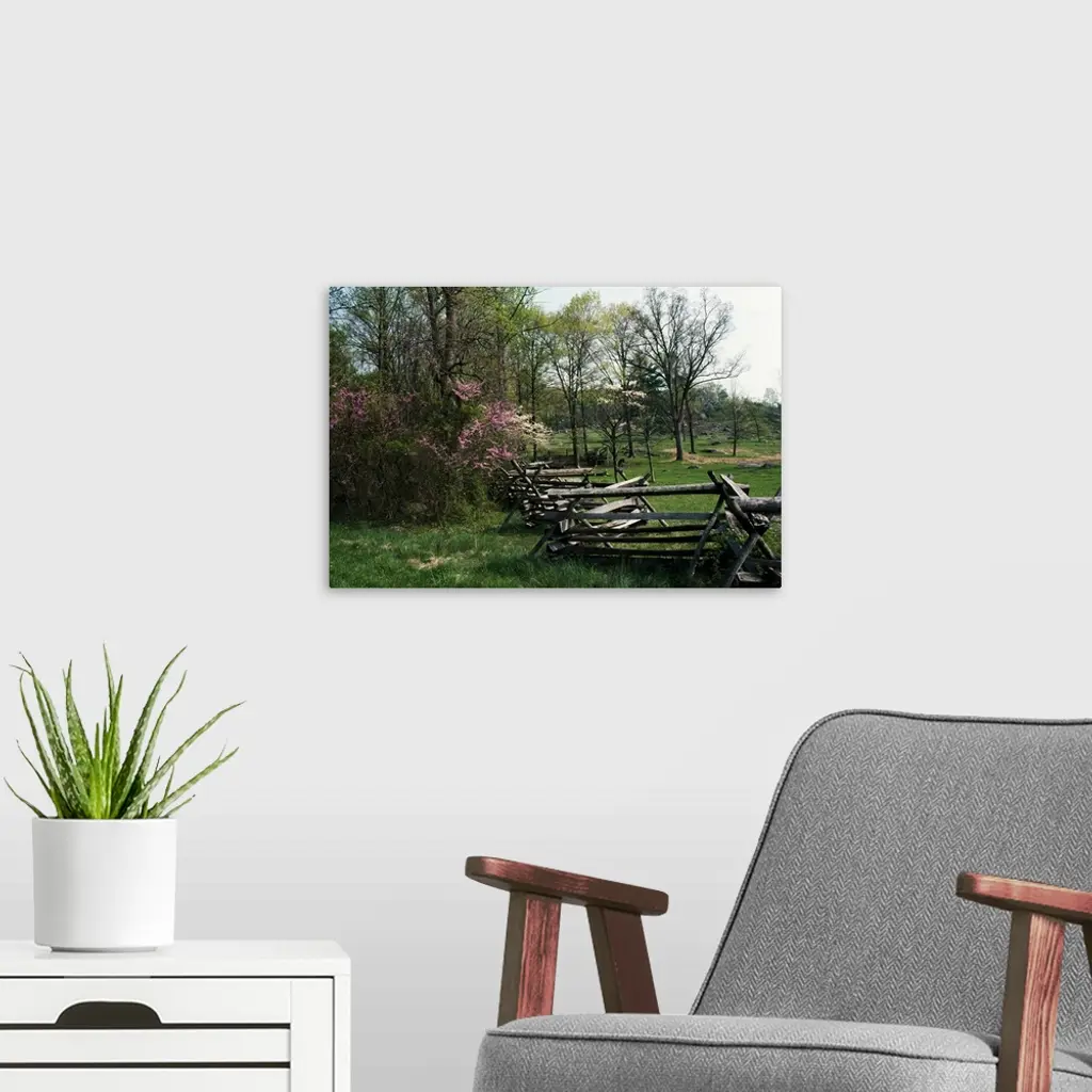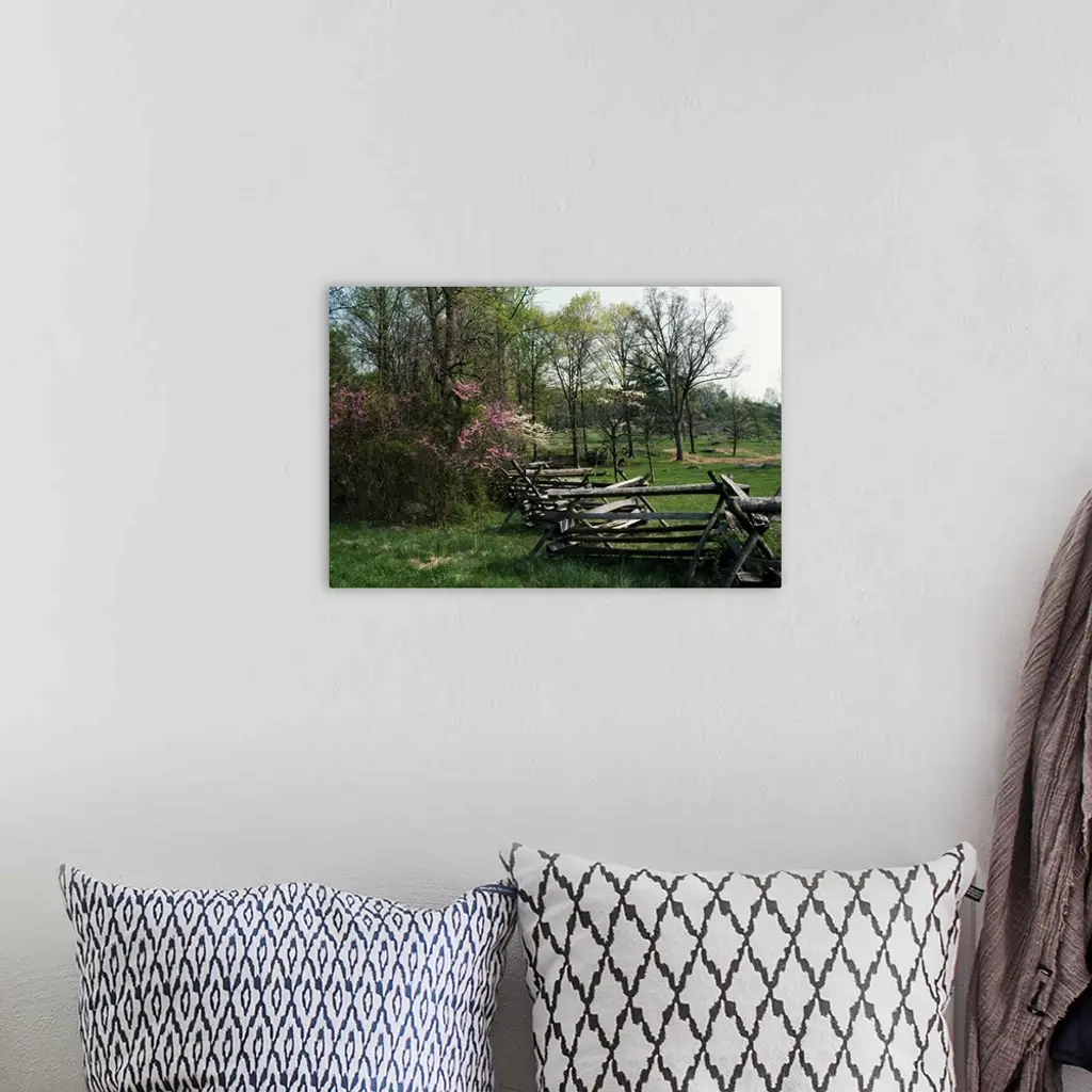 This home docor accent is a landscape photograph of a primitive fence passing through a meadow surrounded by young trees.