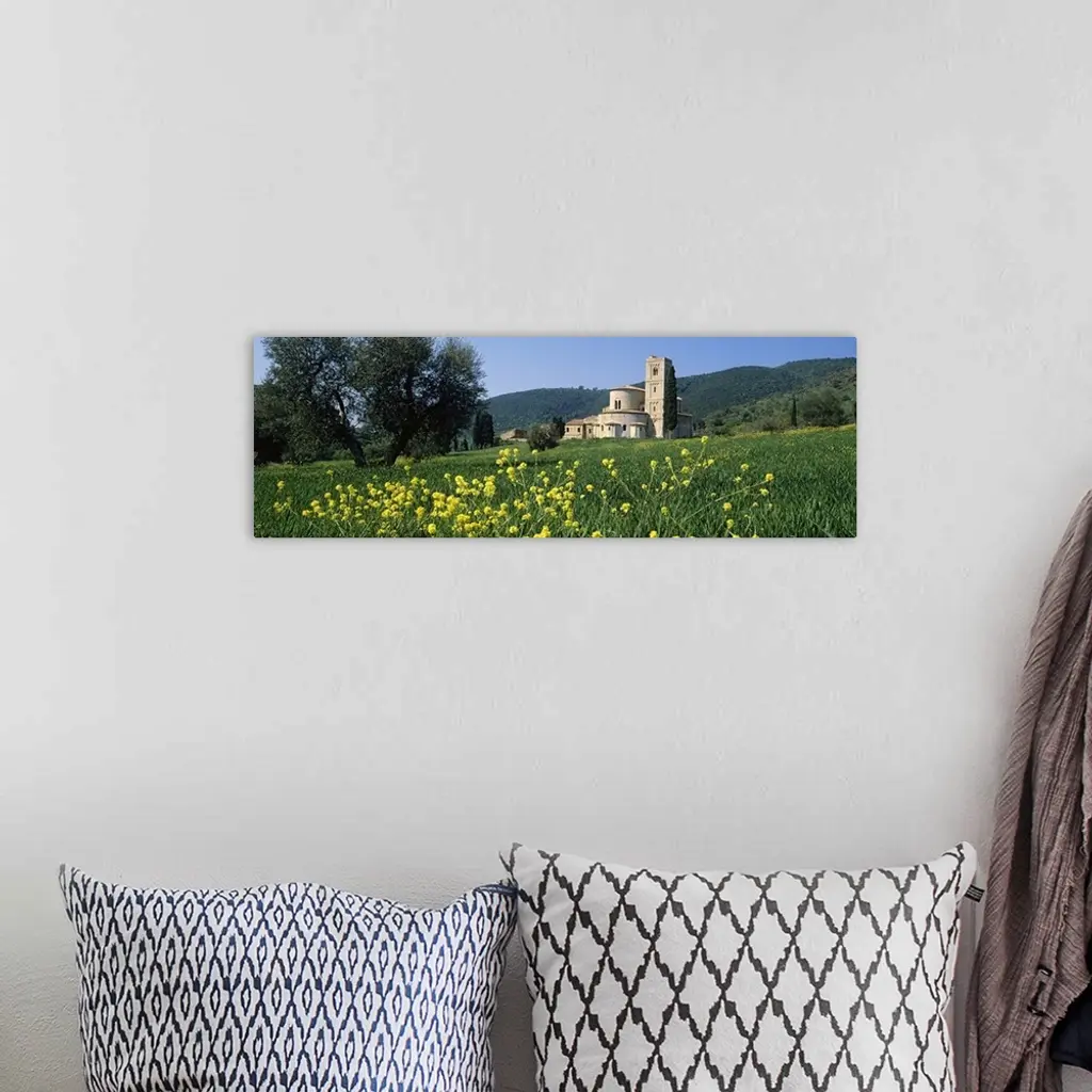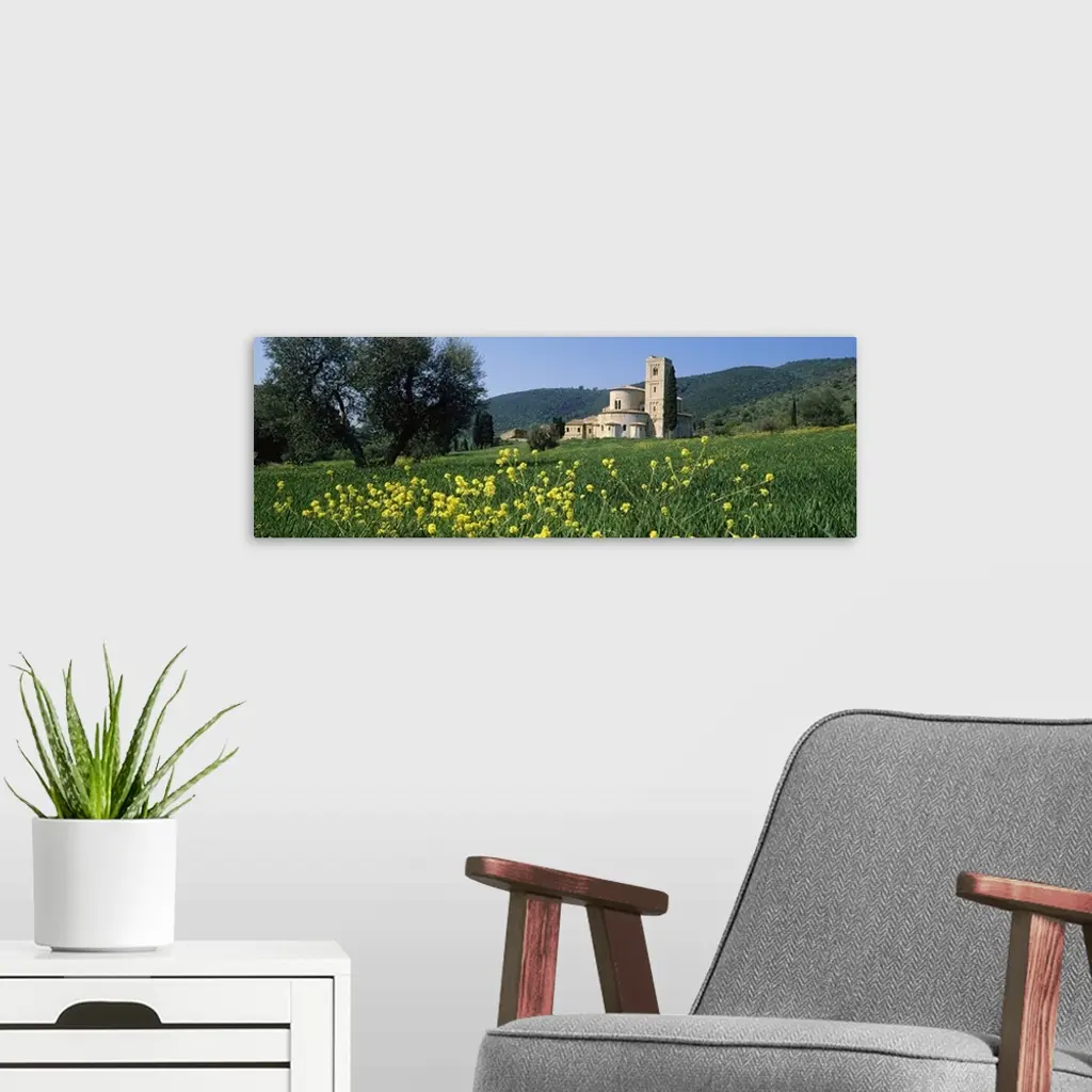 Flowers in a field with a church in the background, San Antimo Abbey, San Antimo, Tuscany, Italy wall art for home and office decor. Discover canvas art prints, photos, mural, big canvas art and framed wall art in GreatBigCanvas.com's varied collections.