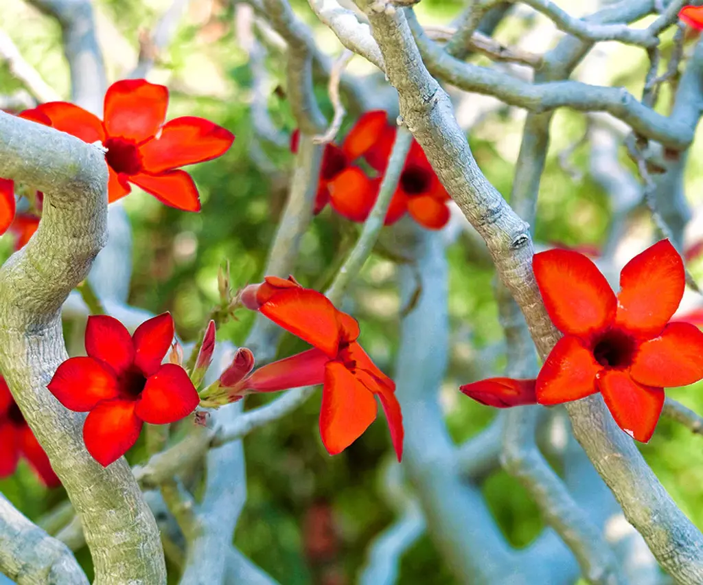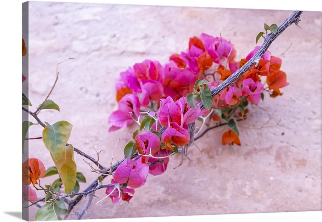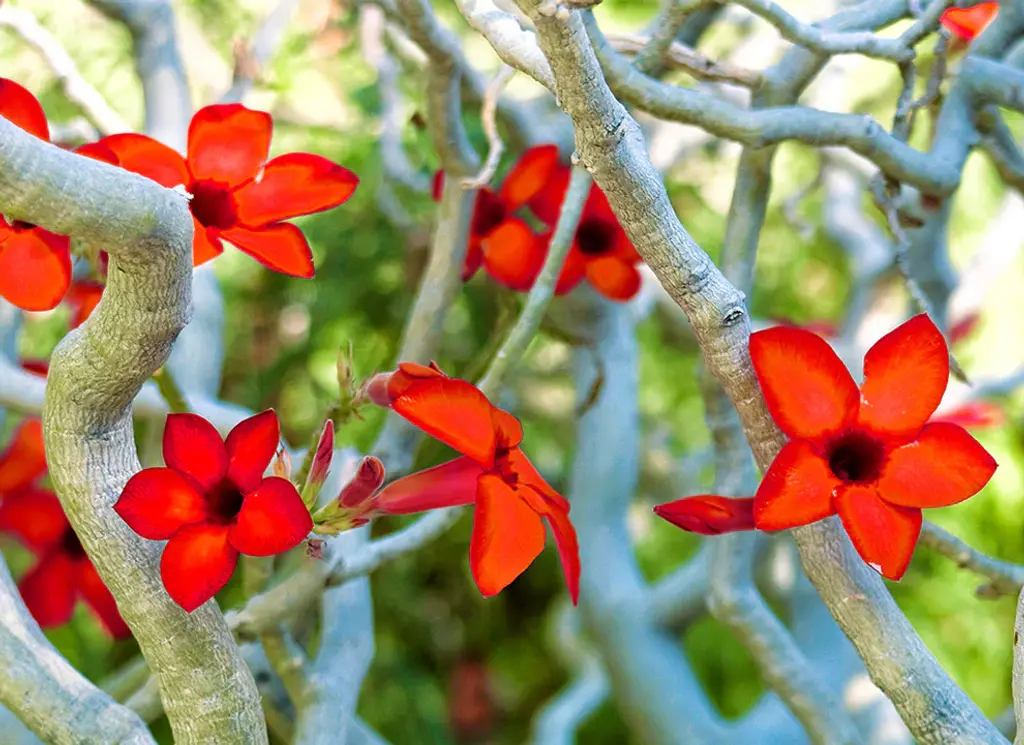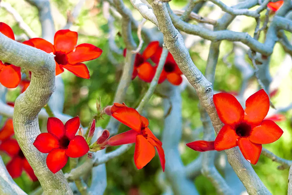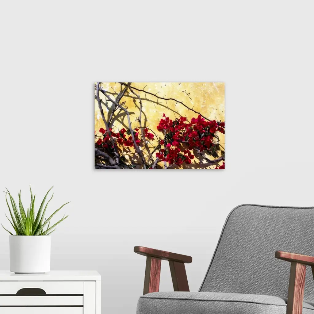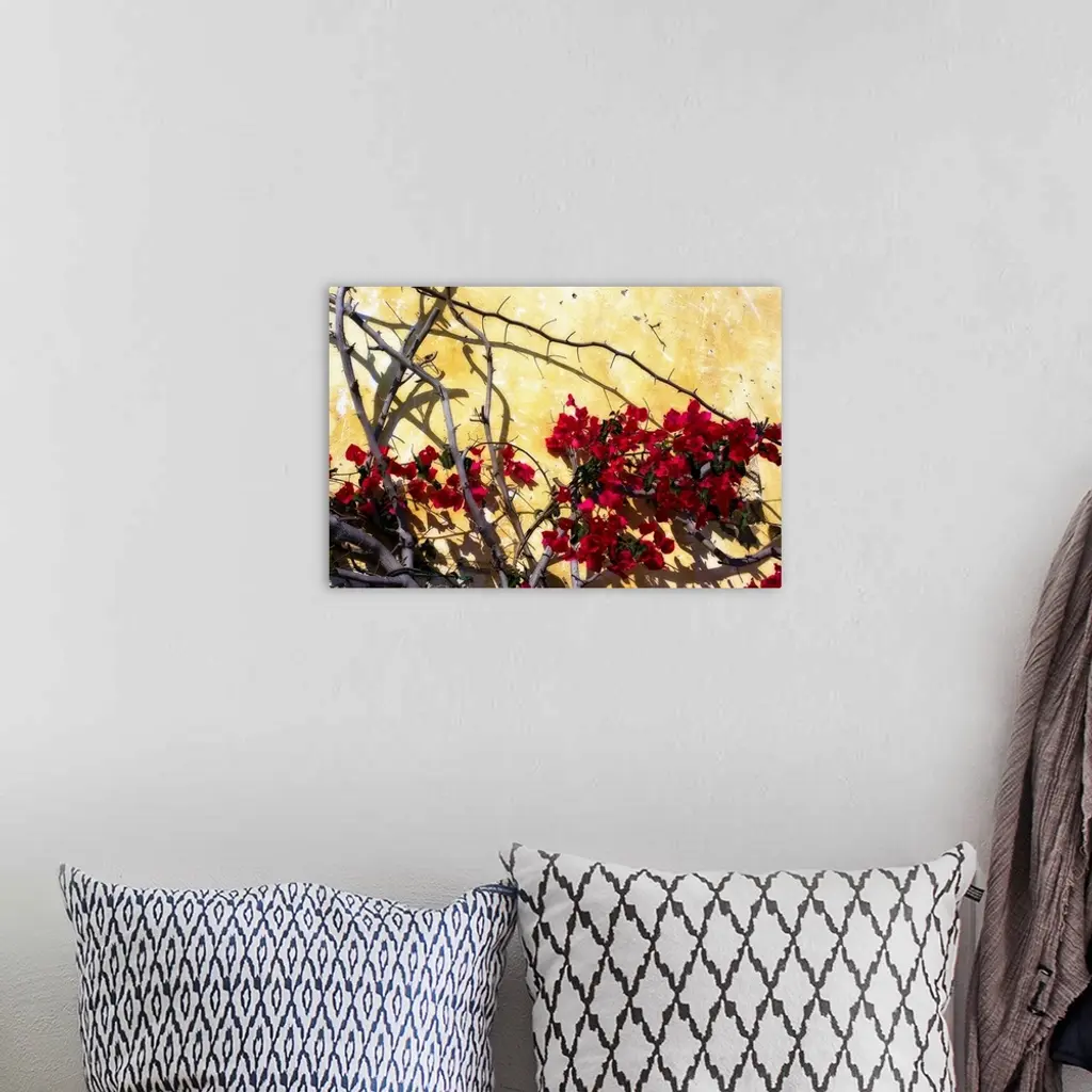 Photograph of a tree with flowers dotting its branches against a bright wall. Shadows of tree branches appear on the wall.