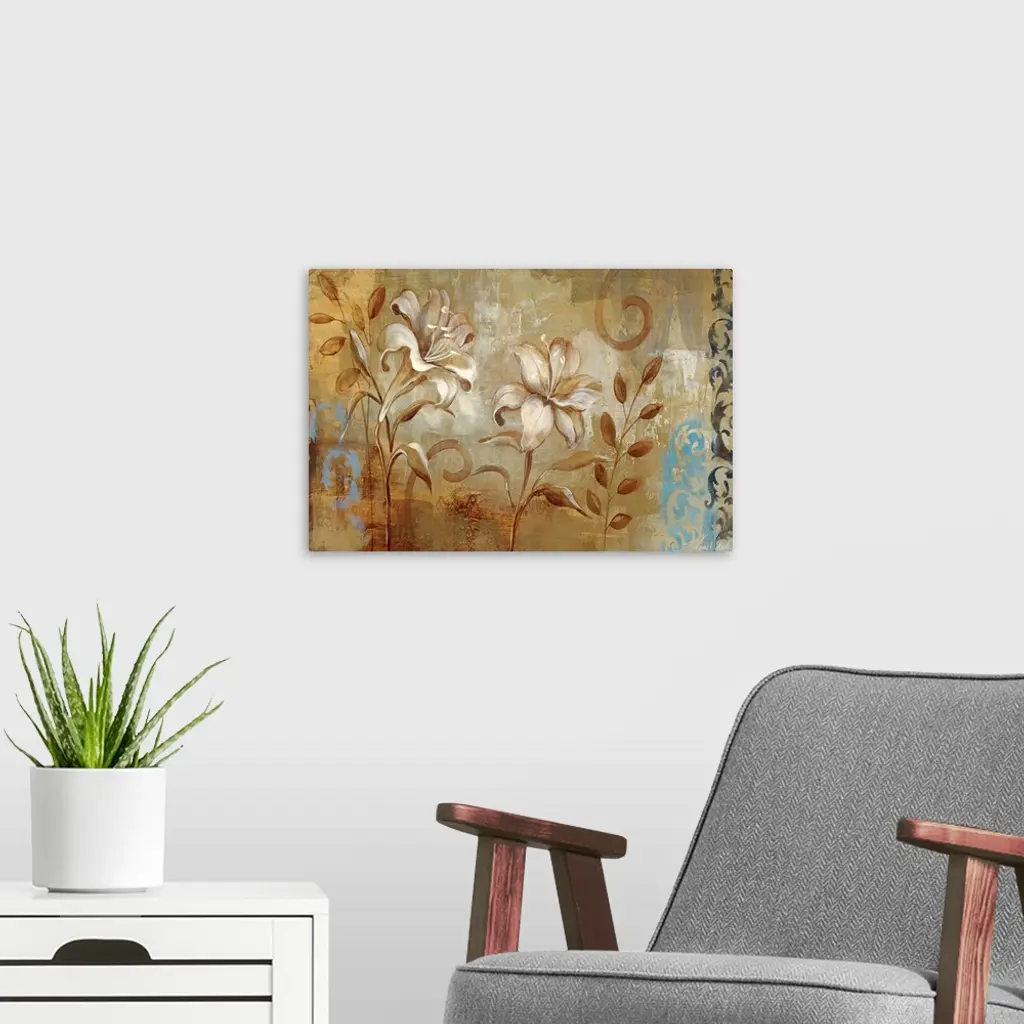Horizontal wall art of two realistically rendered lilies on a neutral background with decorative vine stencils.