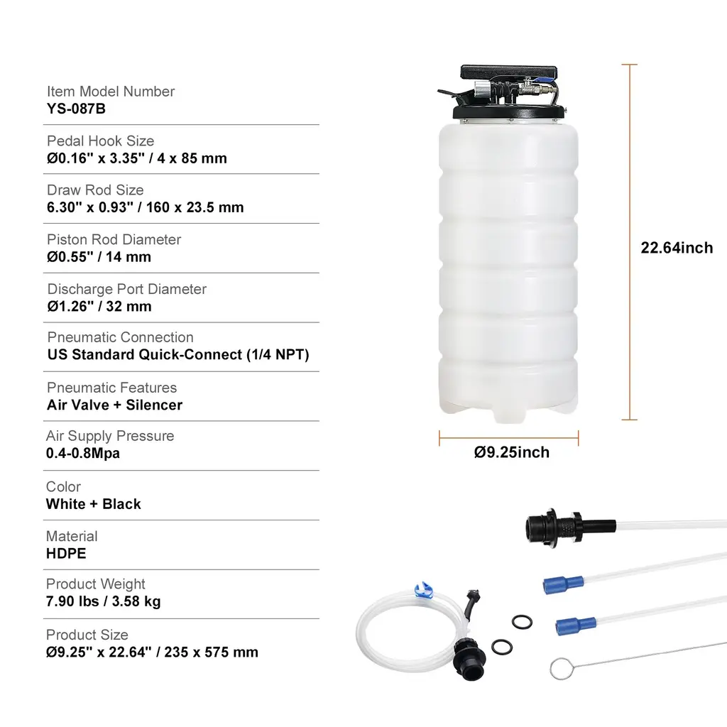 Dual-Mode Mastery: Our fluid extractor adapts to your needs with pneumatic and manual operation modes. The pneumatic mode provides higher speed for increased work efficiency, while the manual mode can function without the fuss of extra gear, which is simple to operate and convenient. All-in-One Kit: Pop the package and find a treasure trove of tools - a 1.74 Gal/4 Gal tank, a main tube, a dipstick, two extension tubes, a liquid suction hose, two sealing rings, and a user manual that gets you going. This oil extractor pump handles all sorts of fluid extractions. Thorough Fluid Extraction: With four sizes of suck-it-all-up oil extractor tubes, you're reaching the deepest depths, leaving tanks dry. Main Tube: 9.8" x 39.37" / 249 x 1000 mm; Extension Tube 1: 0.28" x 47.24" / 7 x 1200 mm; Extension Tube 2: 0.24" x 47.24" / 6 x 1200 mm; Suction Hose: 0.31" x 58.27" / 8 x 1480 mm. Convenient Usage: Think less, do more with our four-step fluid swap. Grab a tube, ditch the dipstick, pump it out, and pour it off. Our oil change pump is a clean, green, engine-changing dream that keeps your hands clean and your engine keen. Fluid Freedom: Engine oil, gear oil, power steering fluid, or brake fluid - our oil pump extractor is perfect for extracting various types of liquids. Wherever you are, whatever you drive, from the car, motorcycle, or yacht to the lawnmower or tractor, we're your go-to gadget for a quick fluid flip. Package Content 1 x Fluid Extractor 1 x Main Tube 1 x Dipstick 1 x Extension Tube 1 1 x Extension Tube 2 1 x Liquid Suction Hose 2 x Sealing Rings 1 x User Manual
