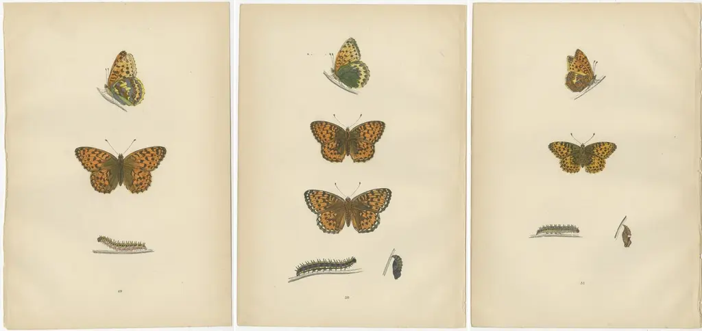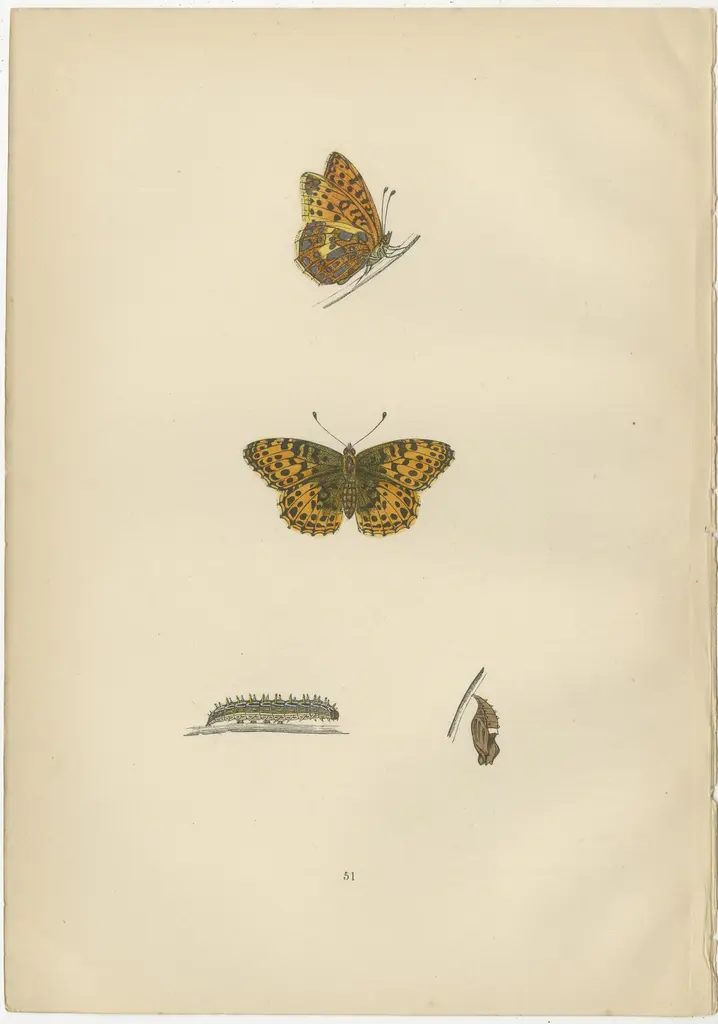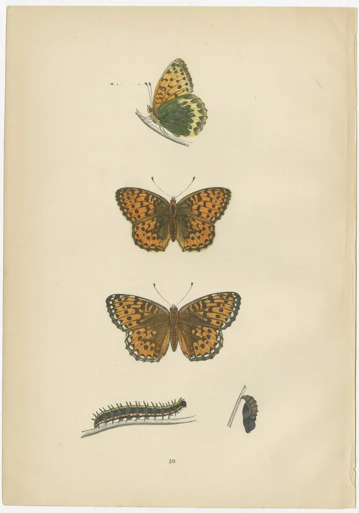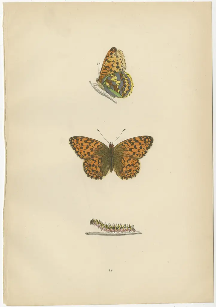 The butterflies depicted in the original antique plates are all hand-colored and they are part of the Fritillary family, known for their beautiful, checkered patterns.1. High-Brown Fritillary (Argynnis adippe): This butterfly has a wingspan that ranges typically from 65 to 75 mm. It can be identified by its distinctive orange-brown color with dark spots and lines. What makes the High-Brown Fritillary interesting is its rarity and preference for habitats with violet-rich flora, making conservation efforts for this species quite specific and challenging.2. Dark-Green Fritillary (Argynnis aglaja): It is known for the dark green hue on the underside of its wings, which are marked with silver spots. It’s a strong flyer and is often seen gliding over tall grasses. The coloration of the Dark-Green Fritillary provides a fantastic example of the adaptive camouflage in butterflies, blending in with its grassland habitats.3. Queen of Spain Fritillary (Issoria lathonia): This is a medium-sized butterfly with a wingspan of 38–46 mm. The upper side of the wings is tawny orange with black spots, while the underside is pale with large silvery spots, giving it a distinct appearance. What’s fascinating about the Queen of Spain Fritillary is its migratory behavior and its larval adaptation to survive on different species of violets.These plates are significant as they not only illustrate the aesthetic beauty of these species but also serve as historical documentation of the British butterfly fauna from the late 19th century. The hand-coloring technique used in these plates adds a unique touch to each illustration, making them not just scientific records but also works of art.