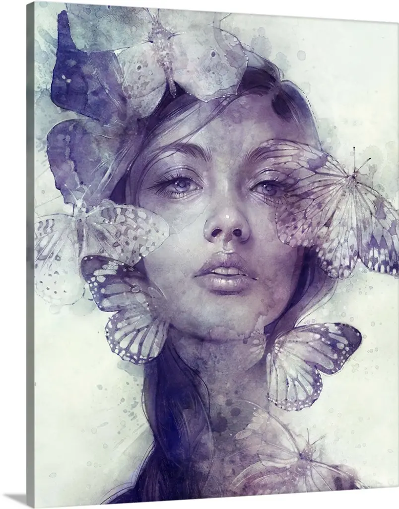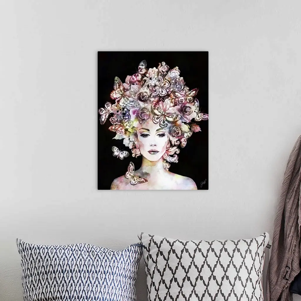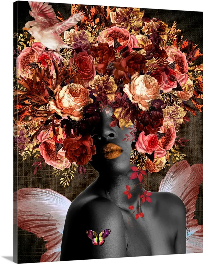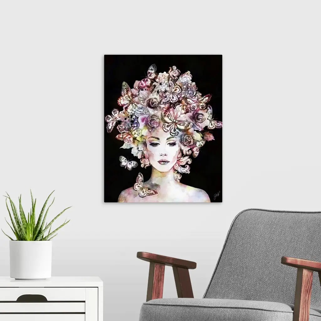 With striking lips and lashes, a captivating woman's hair is a canvas for both flowers and fluttering butterflies.
