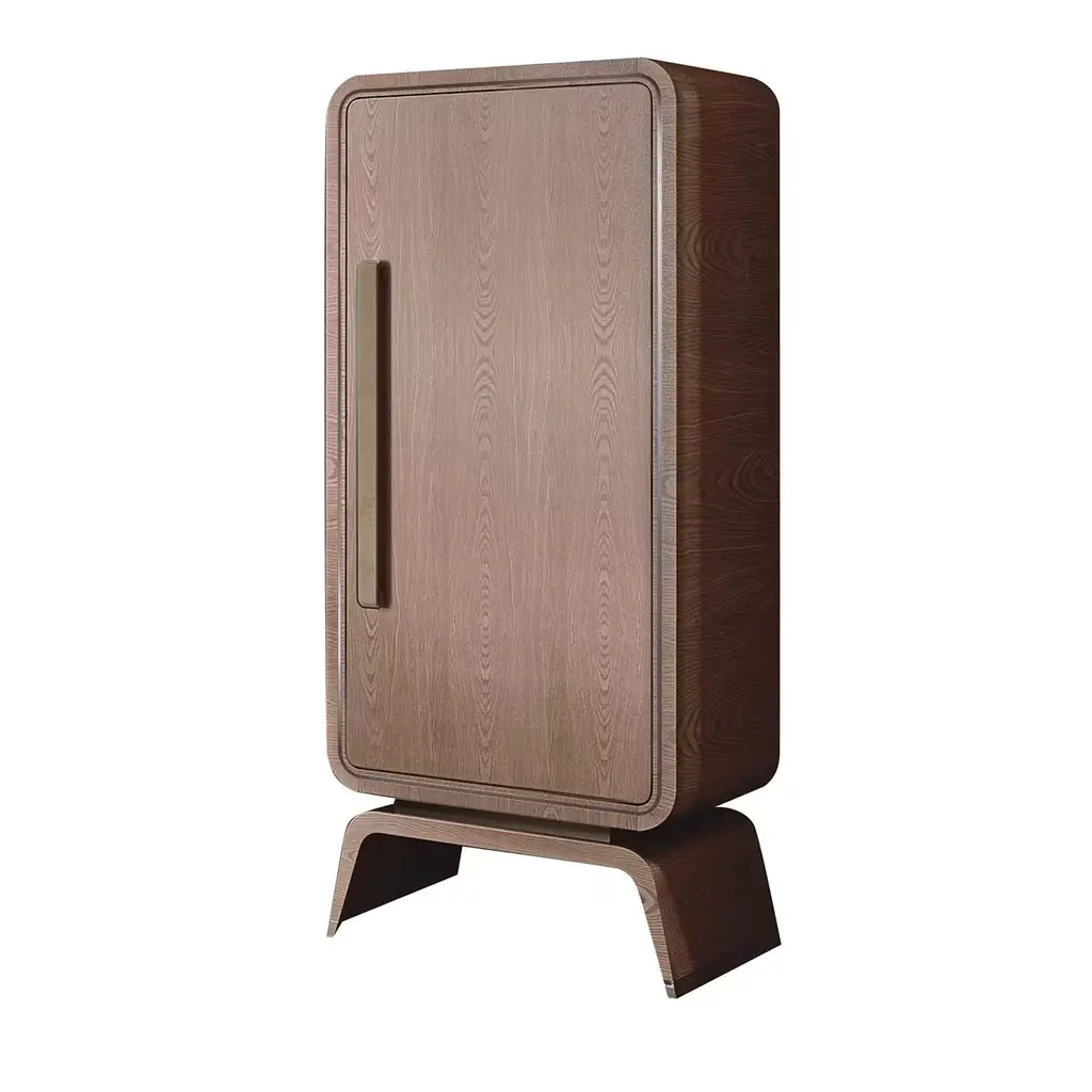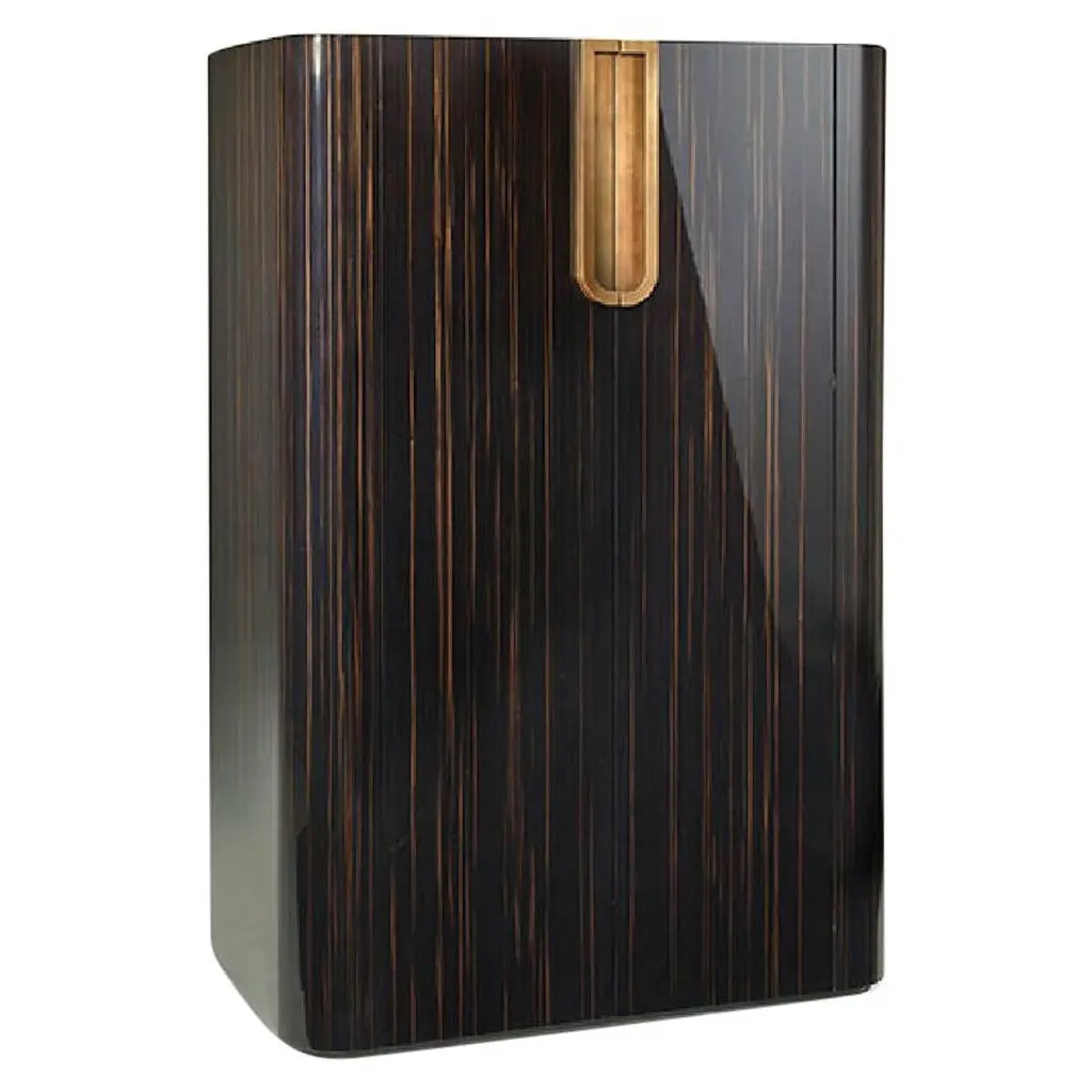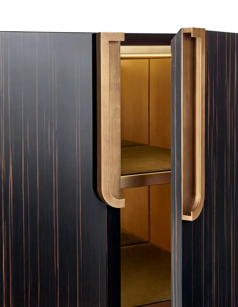 In glossy ebony, this kitchen chest has a distinct and exclusive look. The special minute mosaic handles give light and three-dimensionality to the piece’s surfaces.Cabinet in glossy ebony. Handles with antique bronzed finish. Interior with matte lacquered finish, back with bronzed mirror, microfiber mats on shelves. LED lighting with opening sensor.