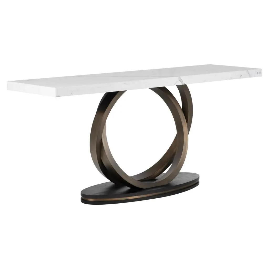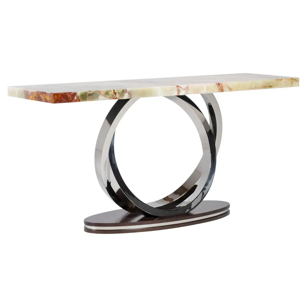 Sinuous lines distinguish this console, created according to the highest standard of quality. Finished in the elegant tones of metallic mosaic with a polished marble top for greater brilliance.