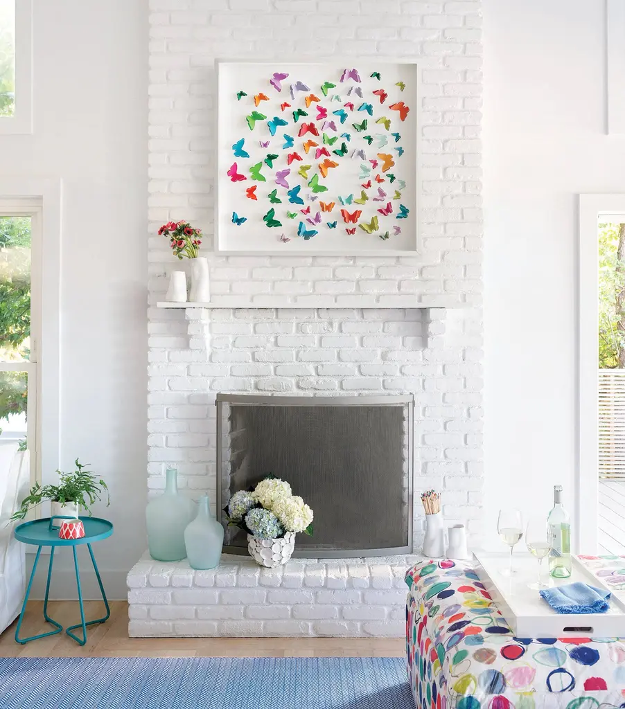Nuanced construction of three-dimensional, abstracted paper butterfly motifs are intricately engineered, creating balanced symmetry that adds contrast and movement to an ordered but ethereal aesthetic. Collaged dimensional watercolor paper in a variety of blue hues on an ivory ground, mounted in a shadowbox frame. Made in the USA