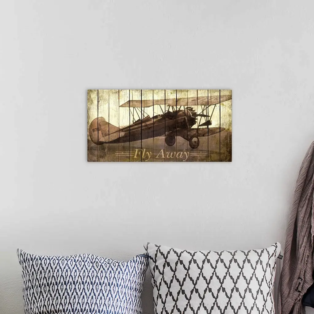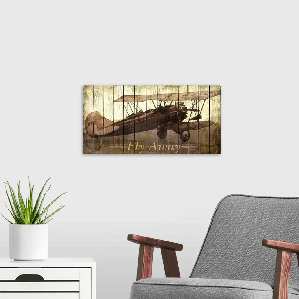 Vintage photo of an airplane on canvas with a wooden and grungy texture overlaid on top.