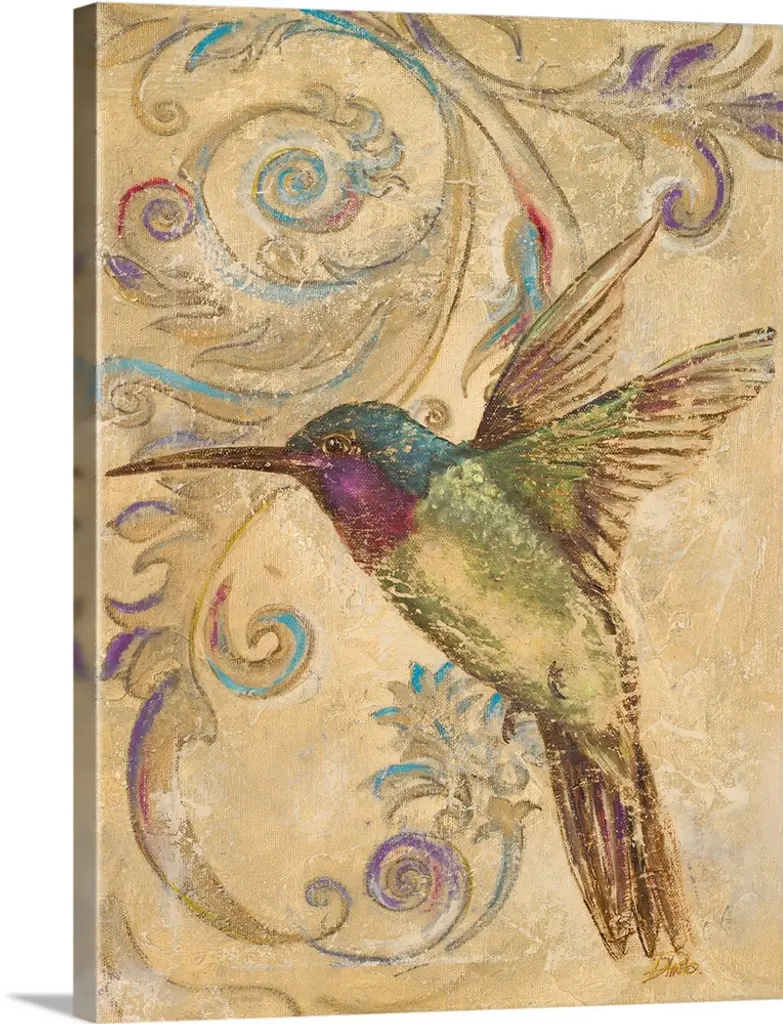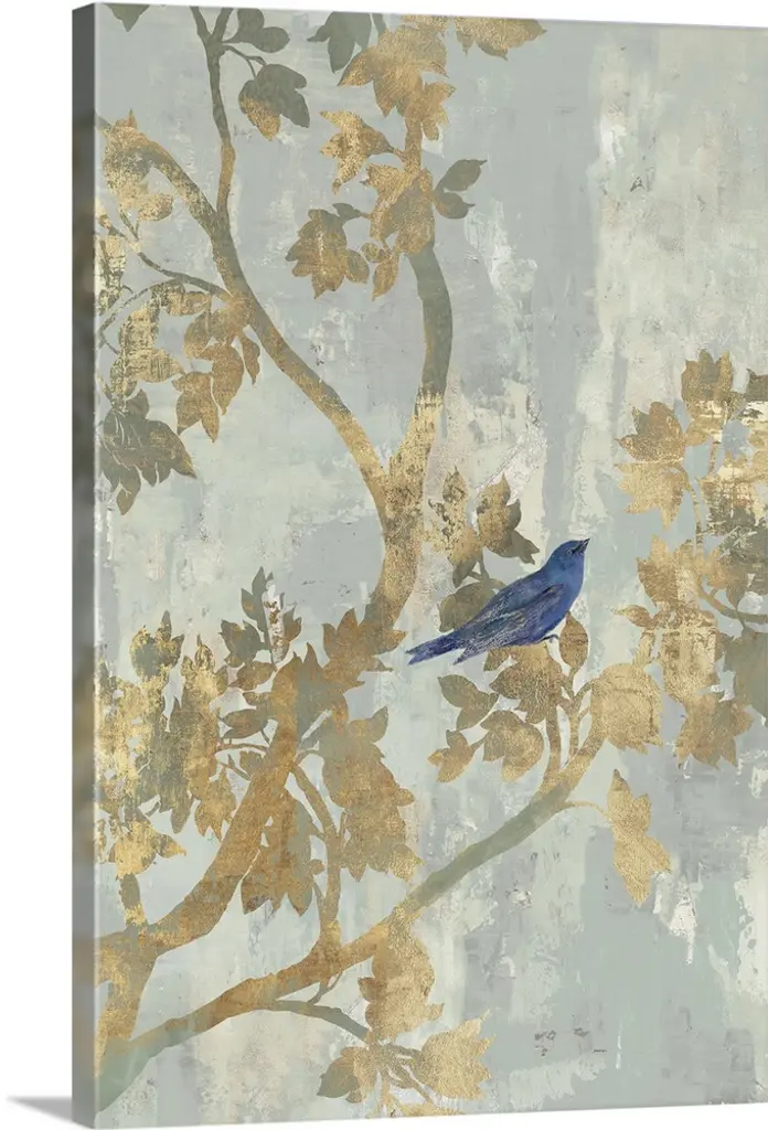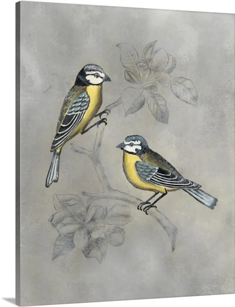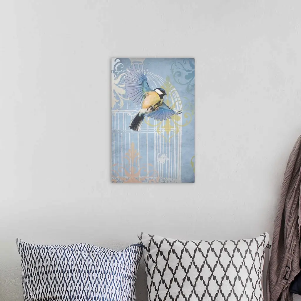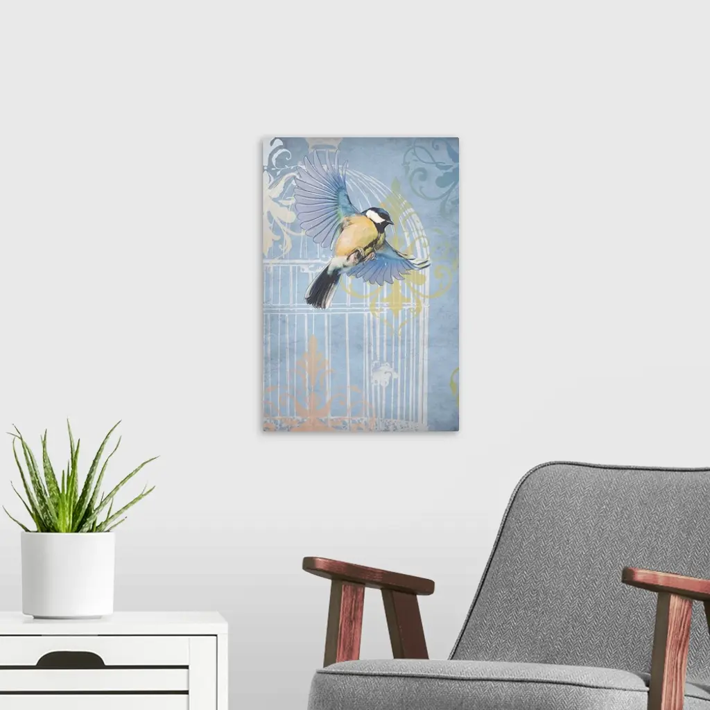 A Blue Tit in flight over a pastel image of a cage and vintage flourishes.