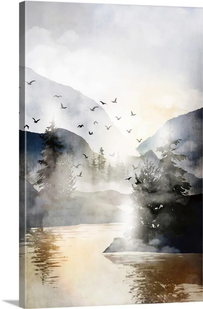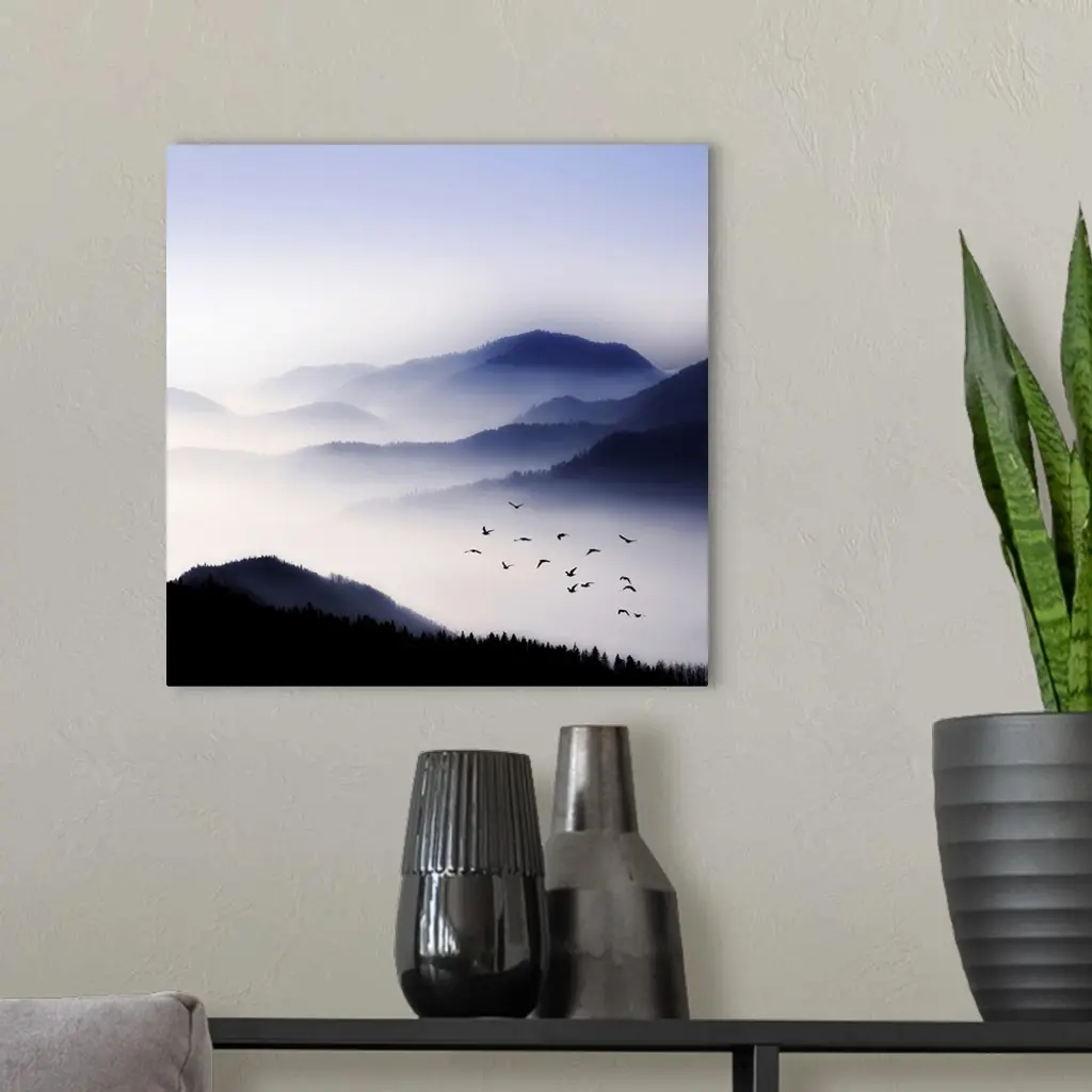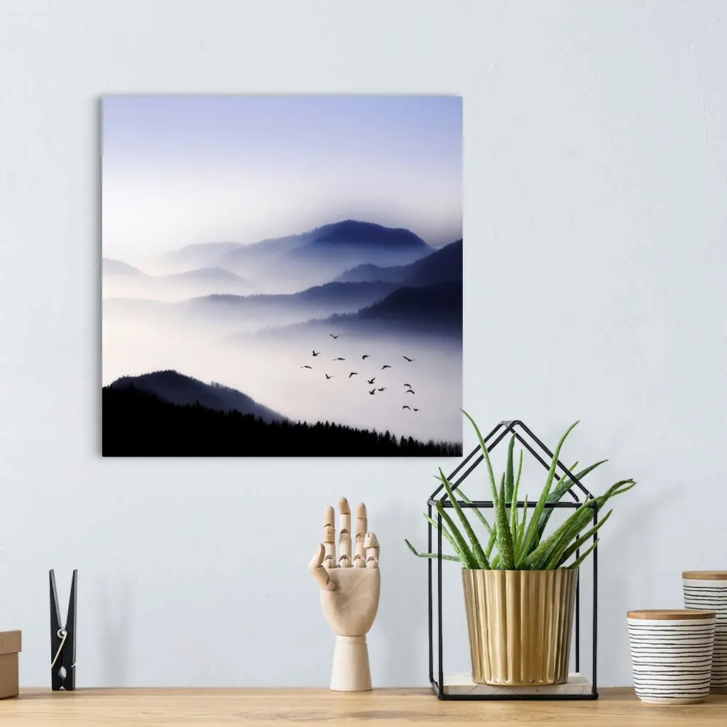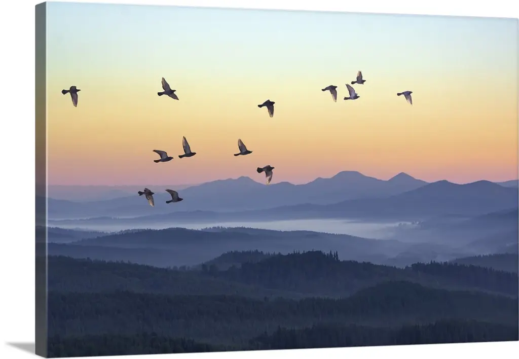 Dense fog hangs over large tree covered hills with a flock of birds flying above the fog.