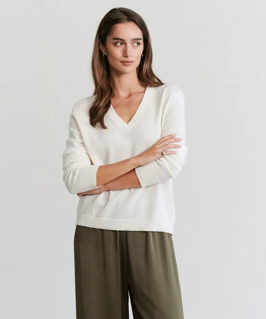 Flynn Cashmere Sweater Ivory As a nod to the classics, this covetable 100% cashmere piece embraces all the ease of a relaxed fit knit with the sophistication of a v-neck silhouette. Tuck this lightweight layer into trousers or pair it with your favorite slip skirt to instantly upgrade any outfit. Please note that this item is not eligible for promotions.