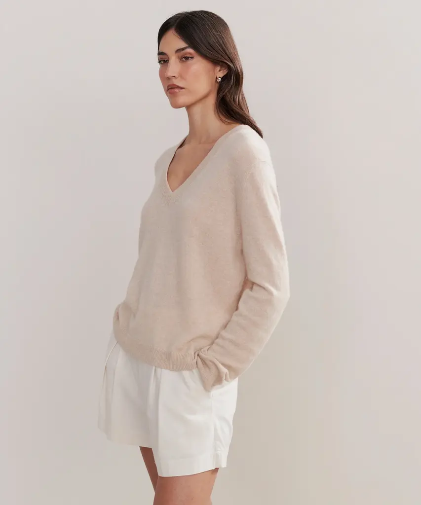 Flynn Cashmere Sweater Oatmeal As a nod to the classics, this covetable 100% cashmere piece embraces all the ease of a relaxed fit knit with the sophistication of a v-neck silhouette. Tuck this lightweight layer into trousers or pair it with your favorite slip skirt to instantly upgrade any outfit. Please note that this item is not eligible for promotions.