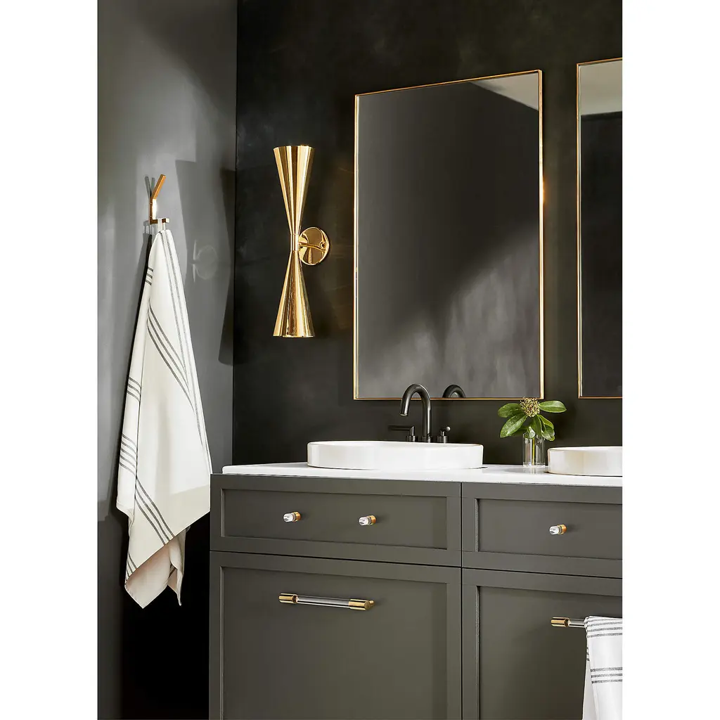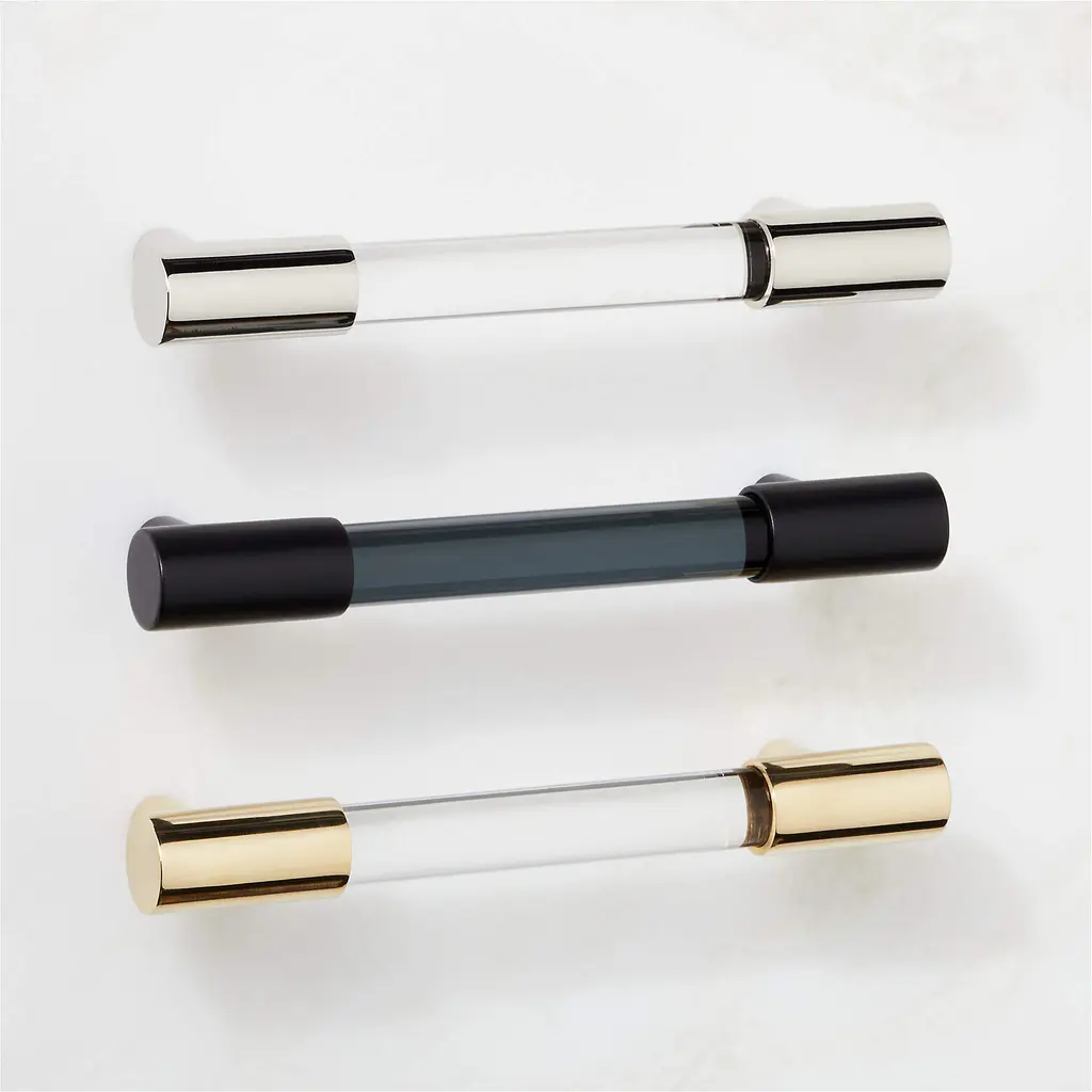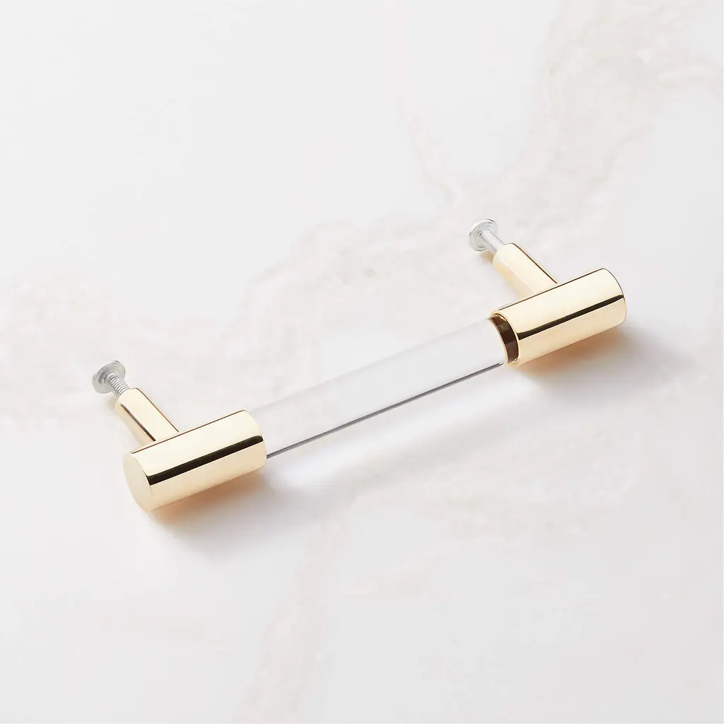 Polished crystal adds a feminine touch to this elegant handle. Aged unlacquered brass hardware has a worn, antique look that will patina beautifully over time. Pairs with the Flynn knobs for a cohesive look. CB2 exclusive.