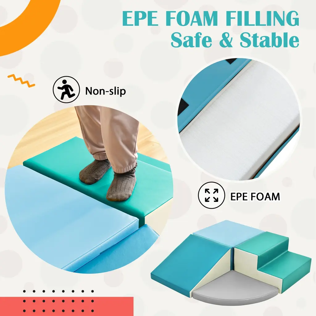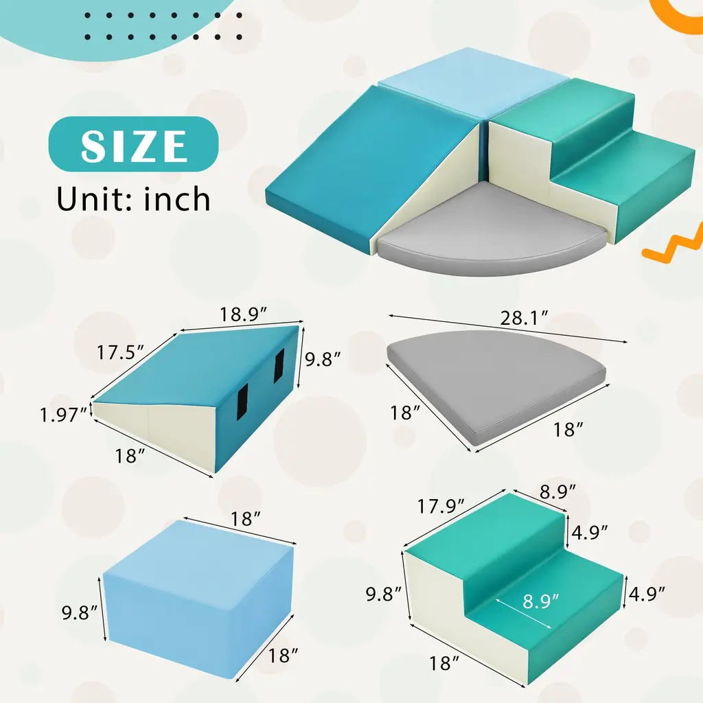 Educational Toy: The climbing toys indoor consists of 5 pieces, which can be placed at will according to the baby's preference, stimulate the baby's creativity, and cultivate the baby's ability to assemble. Toddlers can climb, crawl, and slide on this kit, learn simple motor skills, exercise body balance, and promote physical development.Soft and Safe Foam:The soft toddler climbing set is composed of high-quality EPE foam lining and a soft skin-friendly surface , Anti-slip particles on the bottom and foam with a certain support, soft and firm.Easy to Maintain:The toddler foam climbing blocks have a vinyl surface that is easy to clean and can be wiped clean with a damp cloth. The foam climbing blocks also feature a non-slip base for added stability, don't take up much space and are easy to move and store.Full Play: As an important part of the perfect indoor kids' playground, your toddler can use this climbing toy set to move, lift, carry, stack, slide, and so on, fully activating their immature bodies, and allowing children to freely release their vigorous nature.Complete Combination :This crawling playset consists of a stair, a block, a ramp, and a quarter pad for combining, with full options for play and exercise functions, children are free to rearrange and set them up the way they like and can be combined with multiple sets of soft foam toys to build their own little castles