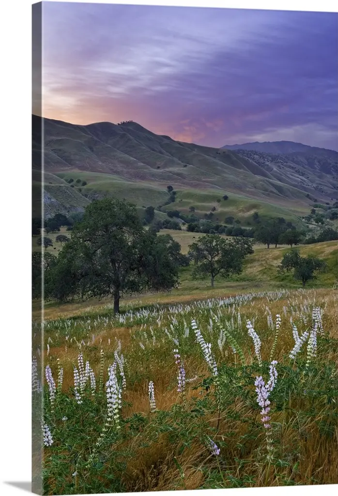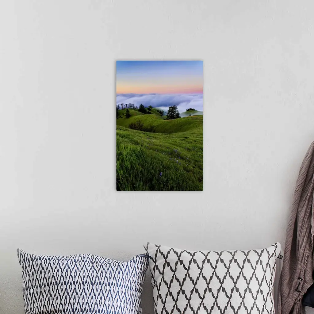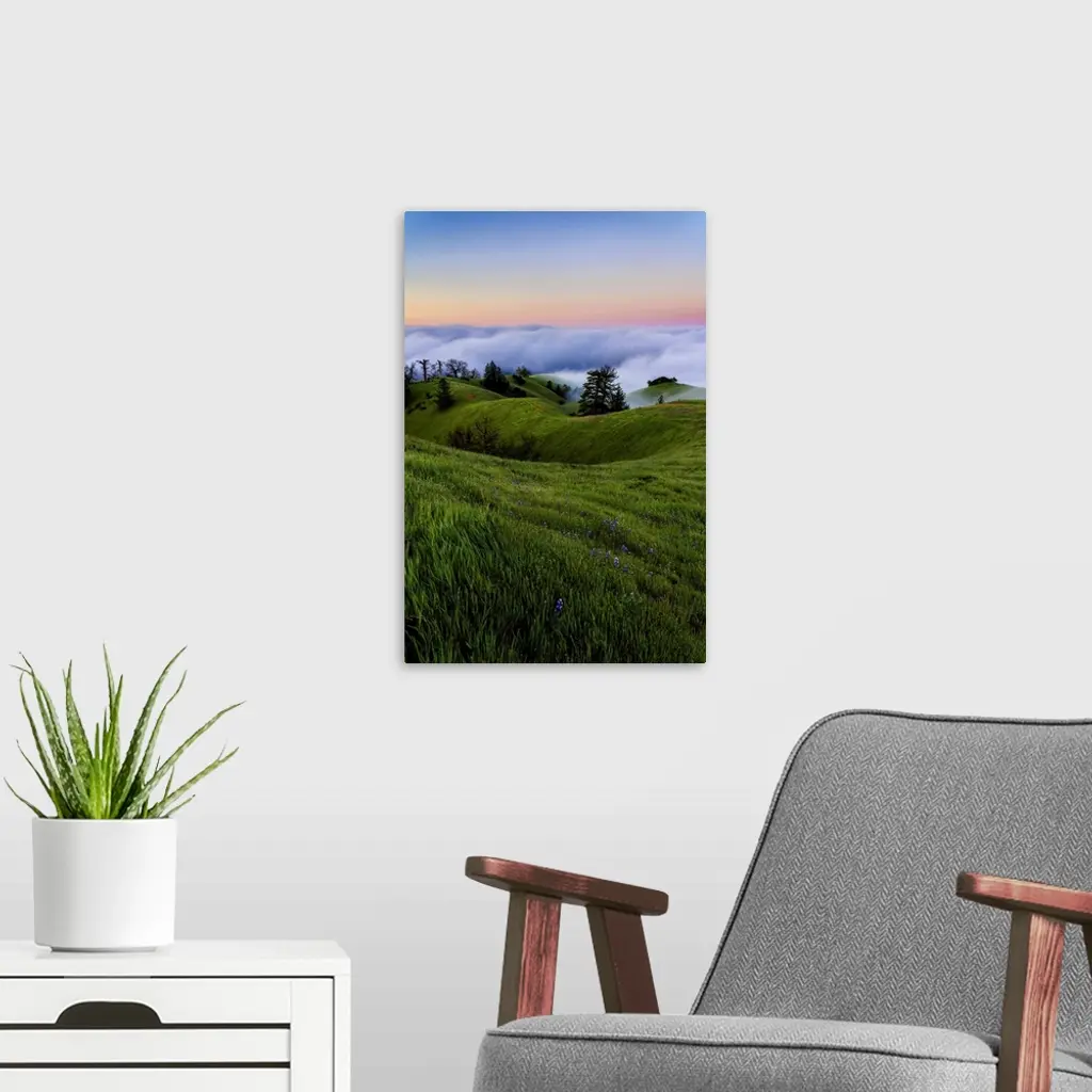 Fog banks rolling in off of the ocean with the sun setting below them, lush meadow on the rolling hills in the foreground, Big Sur, California, United States of America